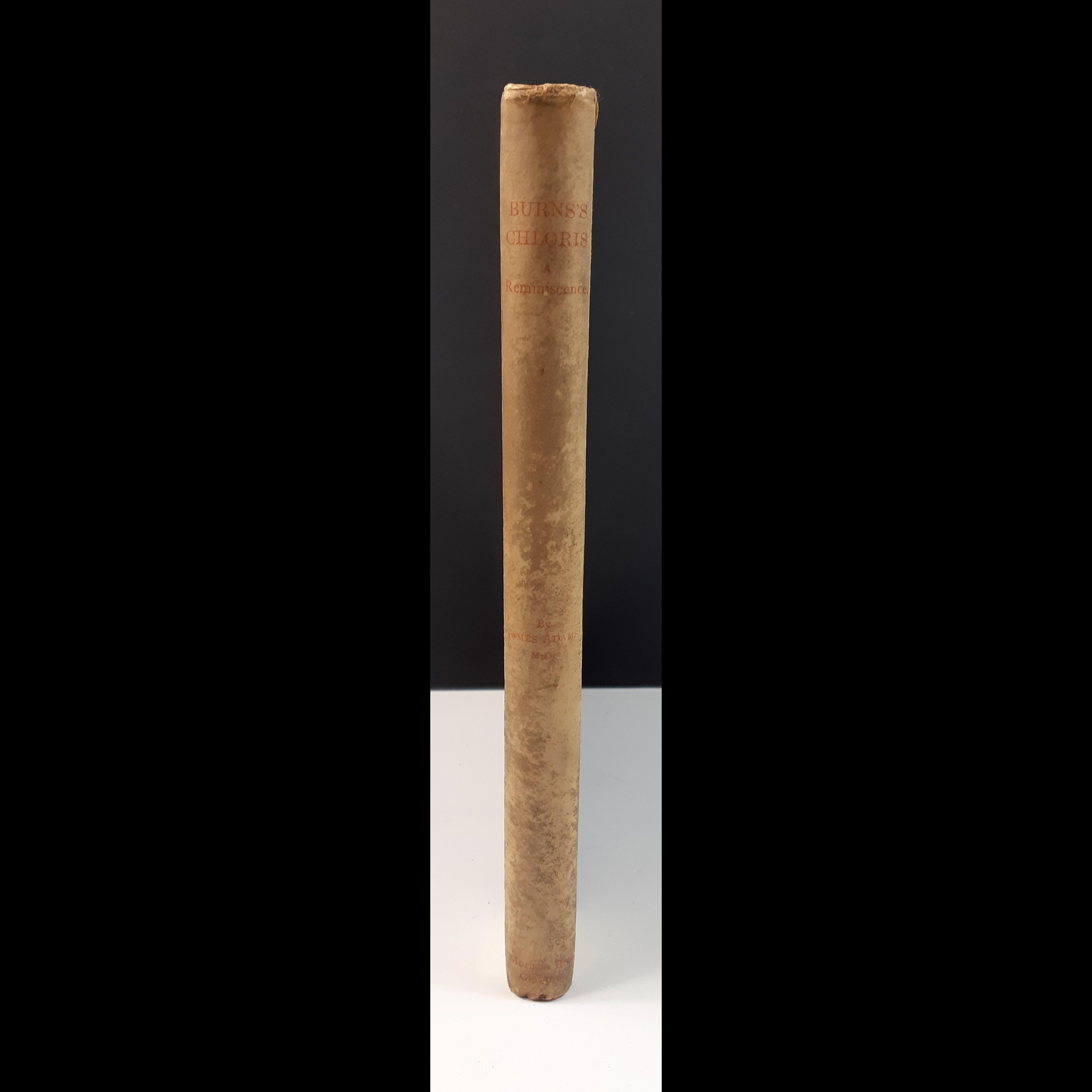 A limited edition of BURNS'S CHLORIS: A REMINISCENCE by JAMES ADAMS. A limited edition of 275 large paper copies of which 250 were offered for sale. Dark blue cloth with vellum spine with unclear red lettering on spine. Slight tear on title page, hand-cut pages.
