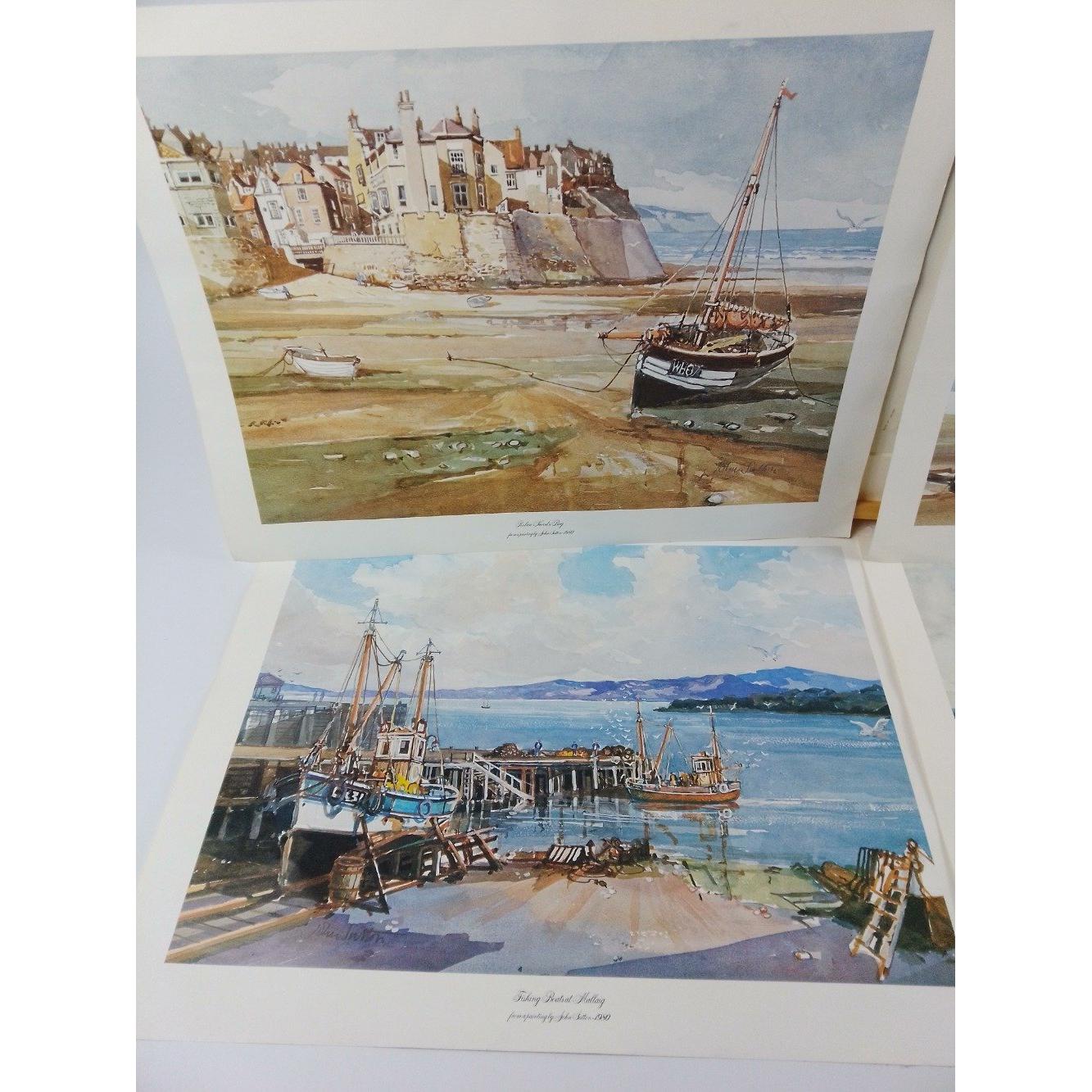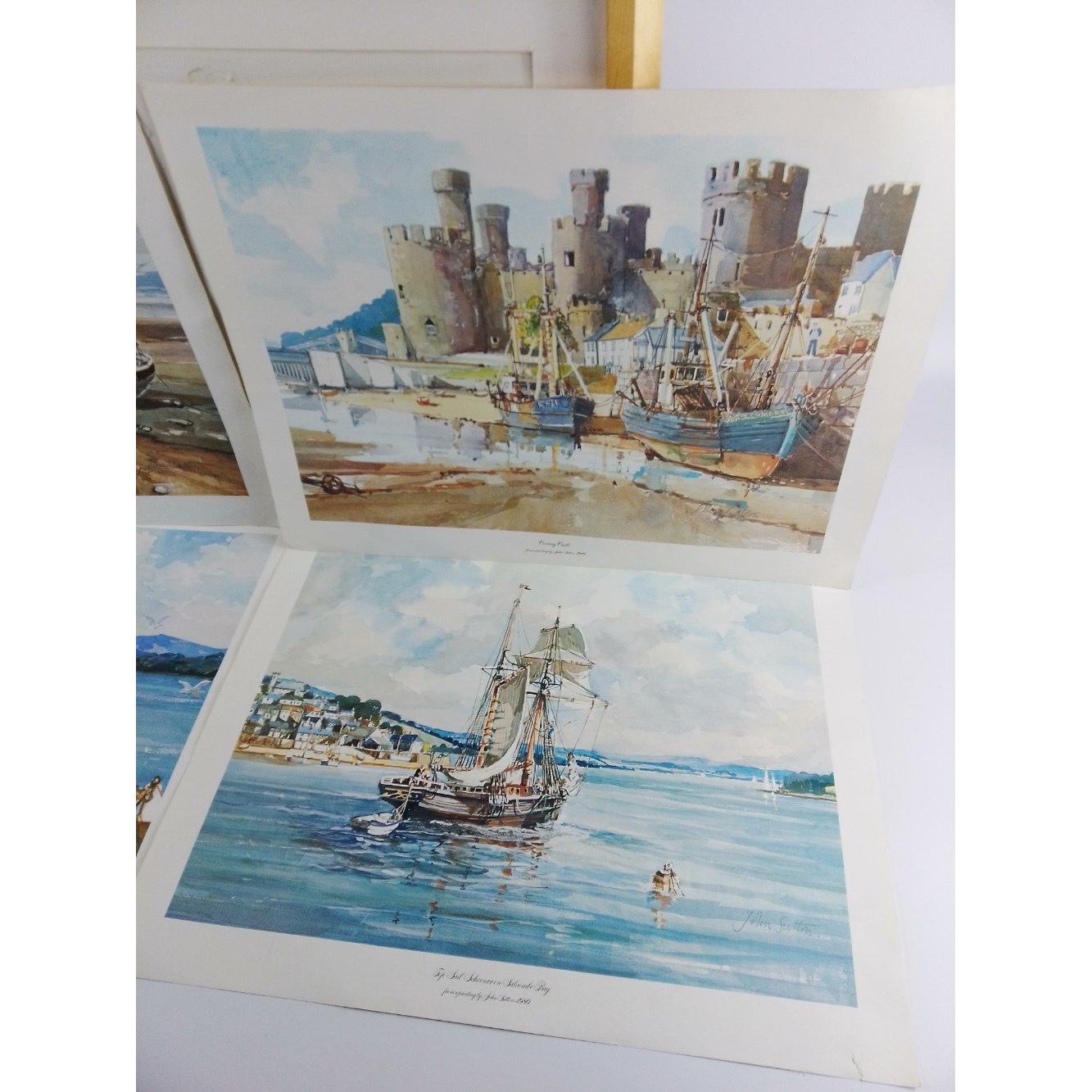 Four prints of Robin Hood Bay, Salcombe Bay, Conway Castle and Mallaig Bay, image of each size 40x 30cm approx all from paintings by JOHN SUTTON dated 1980 plus a glassless frameApprox 4 pieces