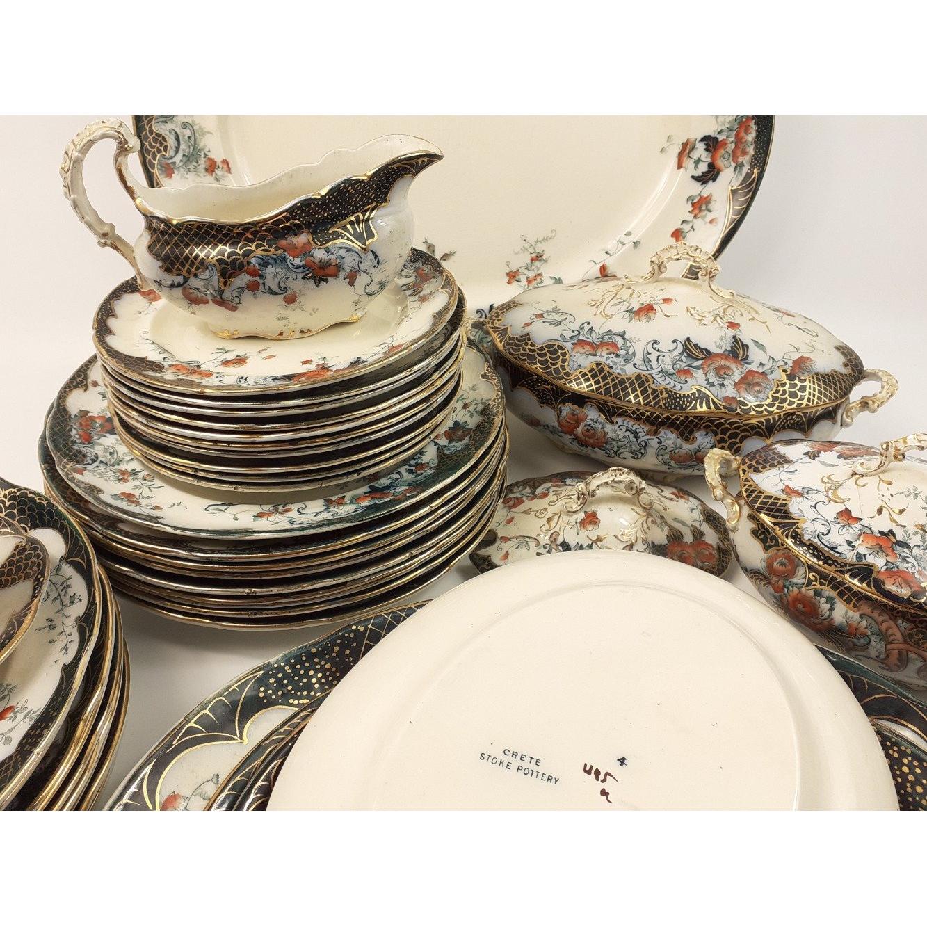 A vintage STOKE POTTERY dinner service in the Crete pattern to include 10 x 20cm plates, 9 x 25cm plates, 9 x 27cm plates, 3 ashets 27cm, 29cm and 32cm plus a sauceboat with underplate. Some wear to ashets, otherwise good condition for their age,