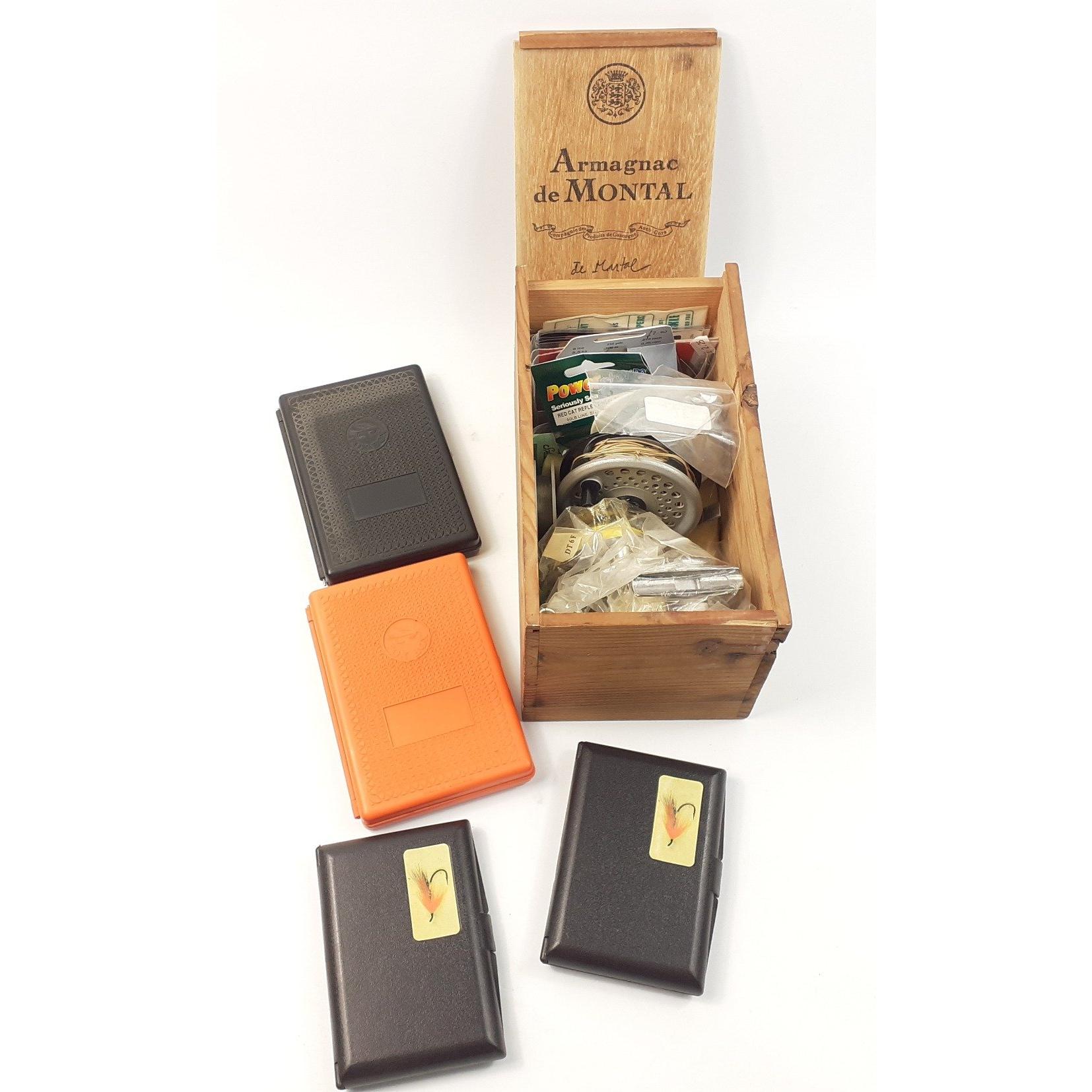 A collection of fisherman's equipment to include a John Norris Superlite Fly Box with 50 flies, plus one other part-used box of the same, a Fox Box wiyj selection of flies, plus one other of the same with 9 flies, plus a wooden box filled with reels, including a SUMMIT 2686000 reel and various other reels and lines. A useful lot
