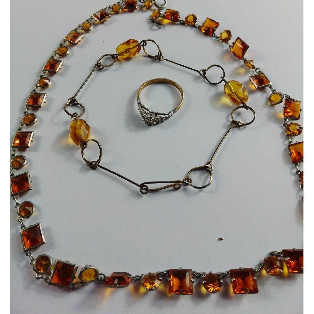 An unusual necklace with mounted square and circular set amber stones stamped 'Platinim'. With similar unmarked bracelet. Lot includes an FM marked yellow metal ring with marcasite shoulders and non diamond centre stone.