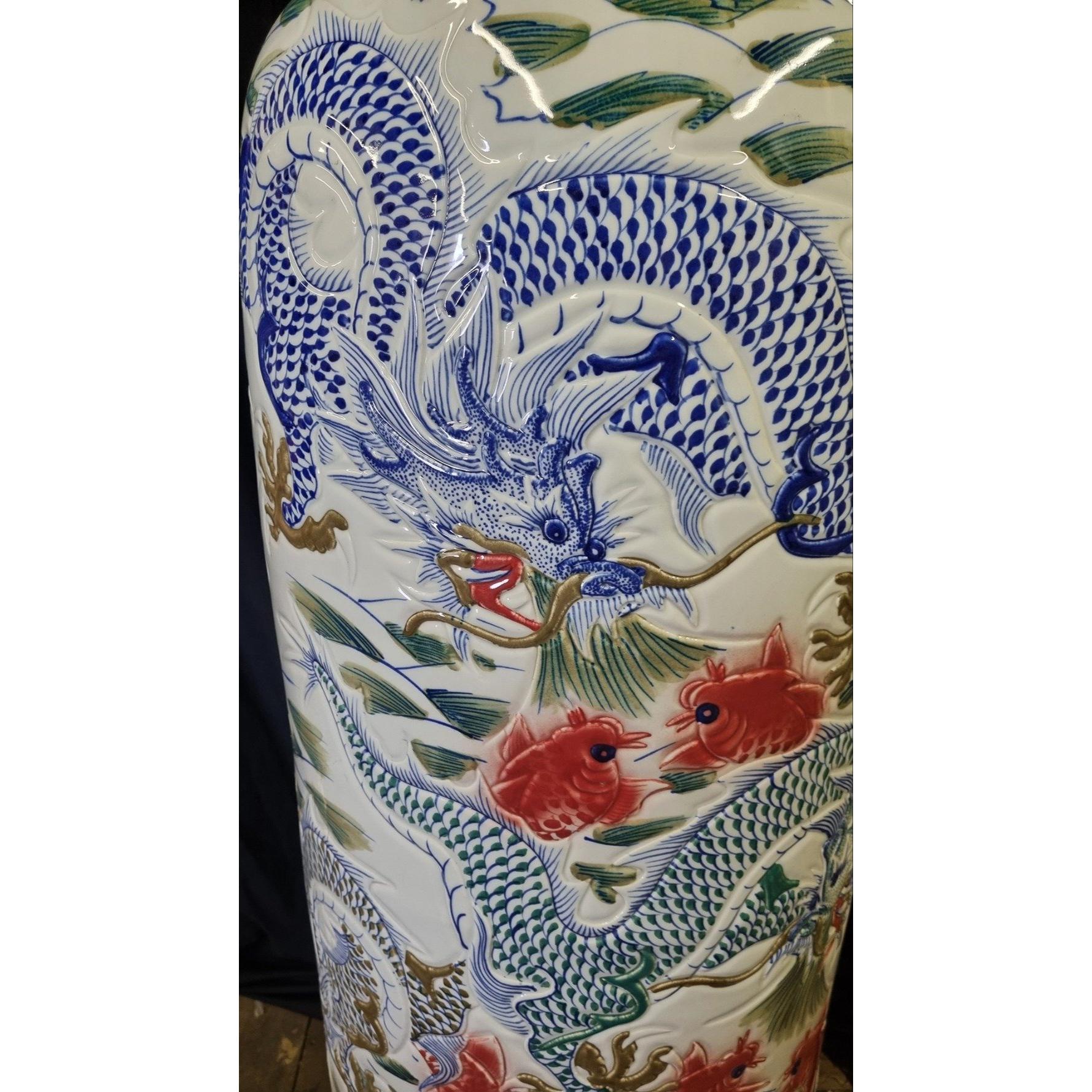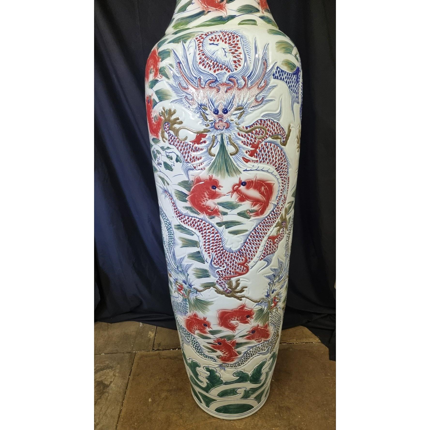 An absolutely stunning original handmade porcelain vase which stands just over 7ft. The vase has great detail with serpents and fish which are all embossed into the vase. This vase is in superb condition for its age and virtually looks new. Origin Foshan Guangdong Province China Circa 1970s.. H: 220cm W: 55cm D: 55cm