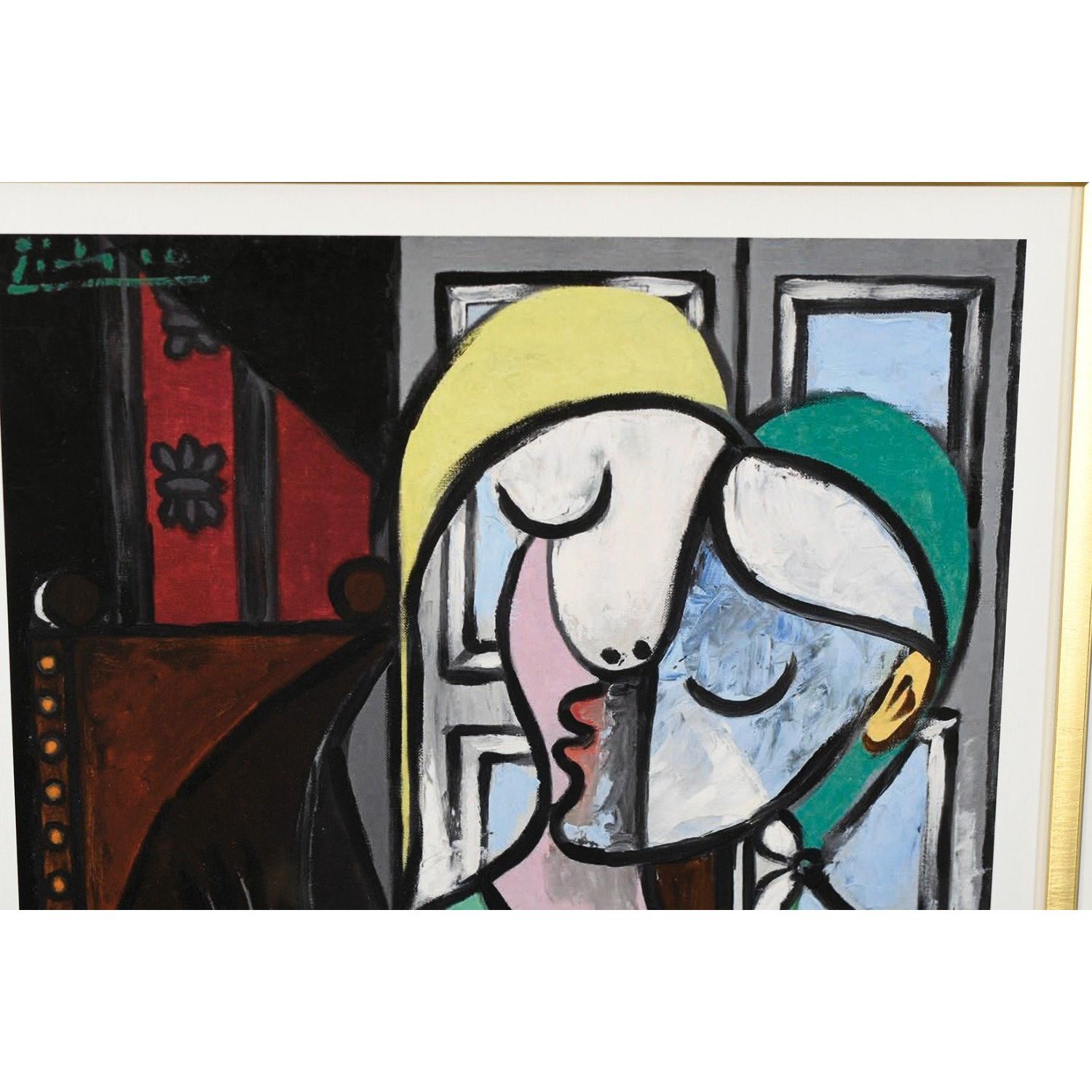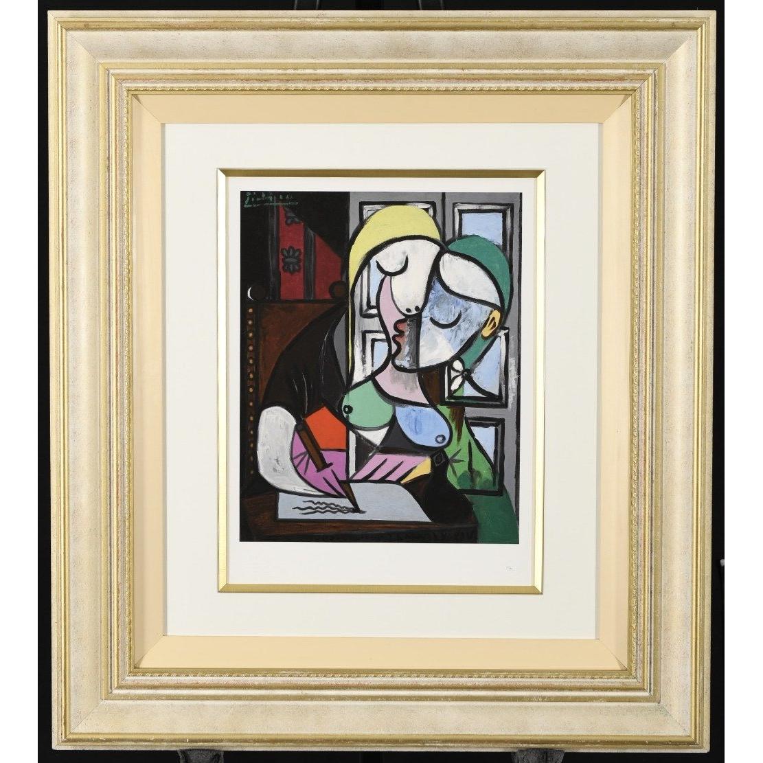 A limited edition print by PABLO PICASSO titled "Femme Ecrivant which has been professionally framed in an expensive hand made frame and Art mounted. Supplied with signed certificate of authenticity (signed by the Master Printer) and numbered in the embossed stamp, one of only 91 published Worldwide. Note: supplied with a replacement valuation certificate for £1800 along with biographical details on the artist (free of charge). During the years 1927 until 1935, Picasso was besotted by Marie Therese. For him, she had a very arresting face with a Grecian profile and he adored her blonde hair, so she became not only his muse but a great model. During this period, Picasso had an amazing creative explosion of work, due to her youthful innocence, undying devotion and great vitality and his work became an expression of his love and worship for her. The painting was created at a picturesque chateau in a small Normandy village which Picasso had purchased in 1930 and there Marie-Therese spent the week whilst Picassos wife Olga was only there at the weekends. Pablo Picasso was undoubtedly the most influential artist of the twentieth century and perhaps the greatest artist of all time. During his lifetime, his personality dominated the development of visual arts and he provided the inspiration or most of the enormous and revolutionary changes which took place. Picasso was born in Spain in 1881 and began to paint precociously at the age of seven under his father's tutelage. He studied at the Barcelona School of Fine Arts and by the turn of the century he was shuttling between Barcelona and Paris establishing his reputation. He is perhaps best known for co-founding the "Cubist" movement but his work embraced and inspired an enormous variety of styles and techniques, ranging from painting and sculpture to etching and lino-cutting. Picasso was married twice and had four children by three women; he also maintained a number of mistresses, some of whom played a significant role in the development of his work. He died in April 1973, unquestionably the most significant name in twentieth century art.. H: 85cm W: 76cm D: 6cm