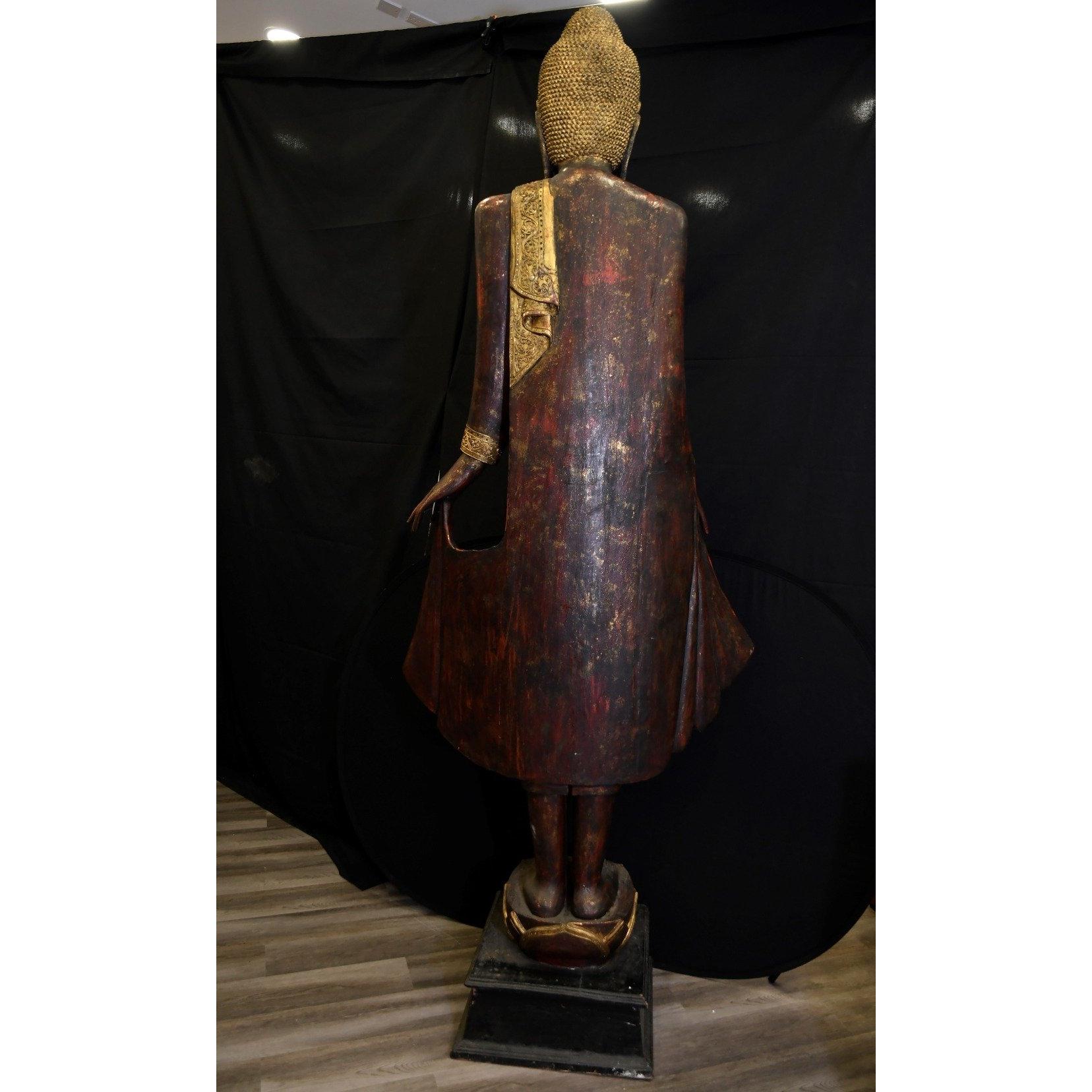 An incredible 9ft high hand made wood carving of a Buddha hand decorated and finished with gold detail. This piece is carved from solid wood. Origin Thailand Circa 1980 Condition Good. H: 280cm W: 103cm D: 56cm