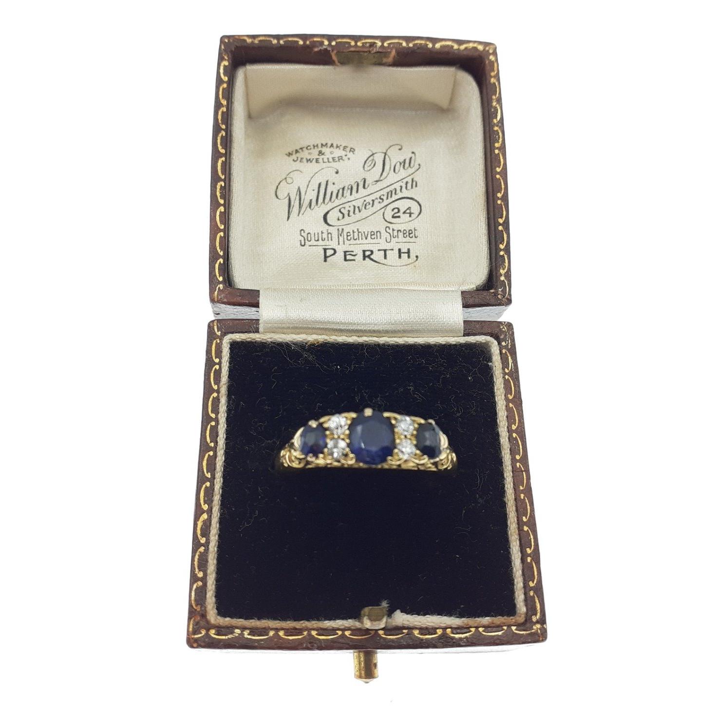 SCINTILLATING SAPPHIRE and DIAMOND (tested) combination ring - ring size P/Q - gross weight 3.88g approx - larger SAPPHIRE dimensions 5mm x 4mm approx Hallmarks indistinct/rubbed - comes with a charming vintage jeweller's box