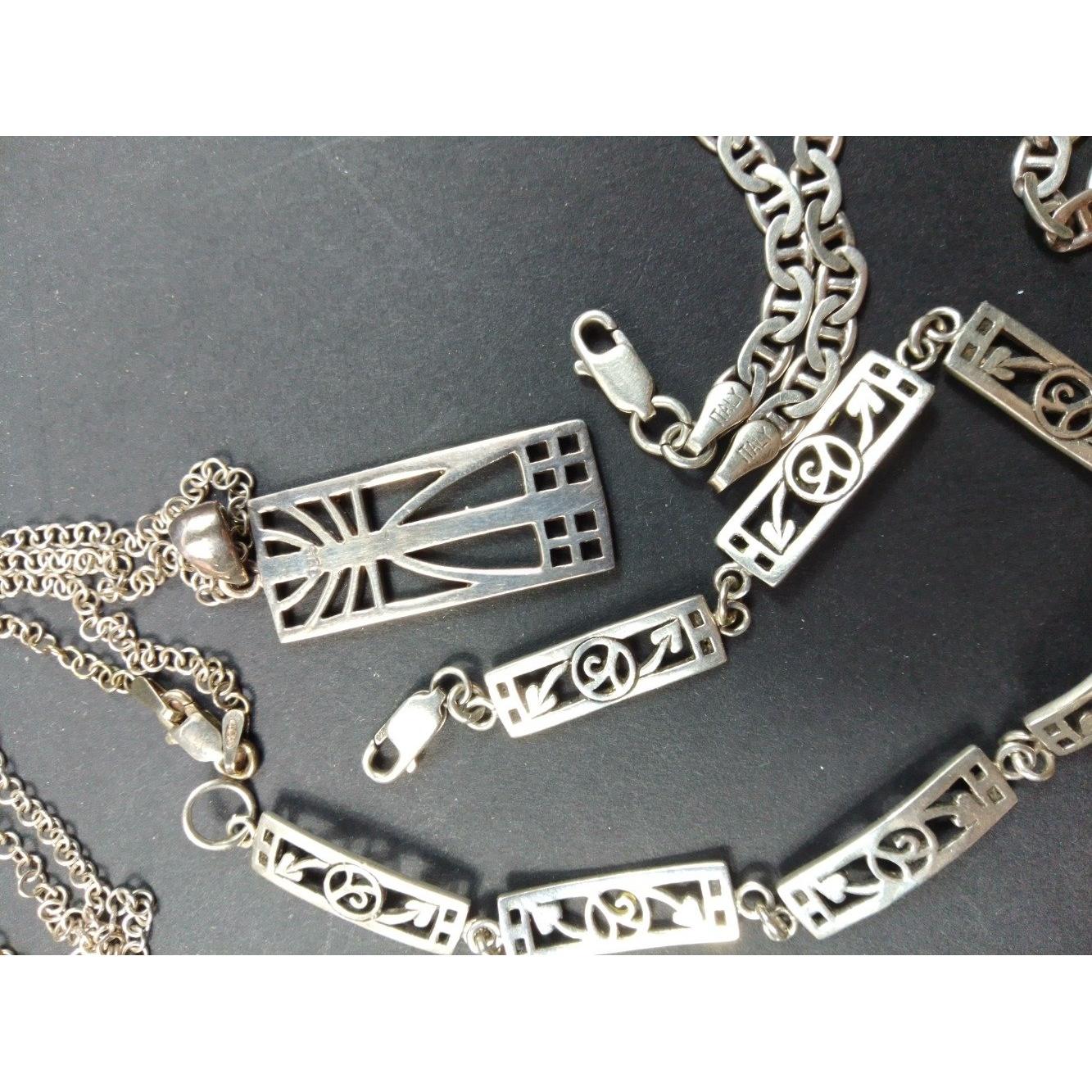 A RENNIE MACKINTOSH style pendant stamped 925, 30mm long on a 925 stamped chain (44cm approx) plus 2 x 925 stamped bracelets 18cm long approx, weight 19.35g approxApprox 3 pieces