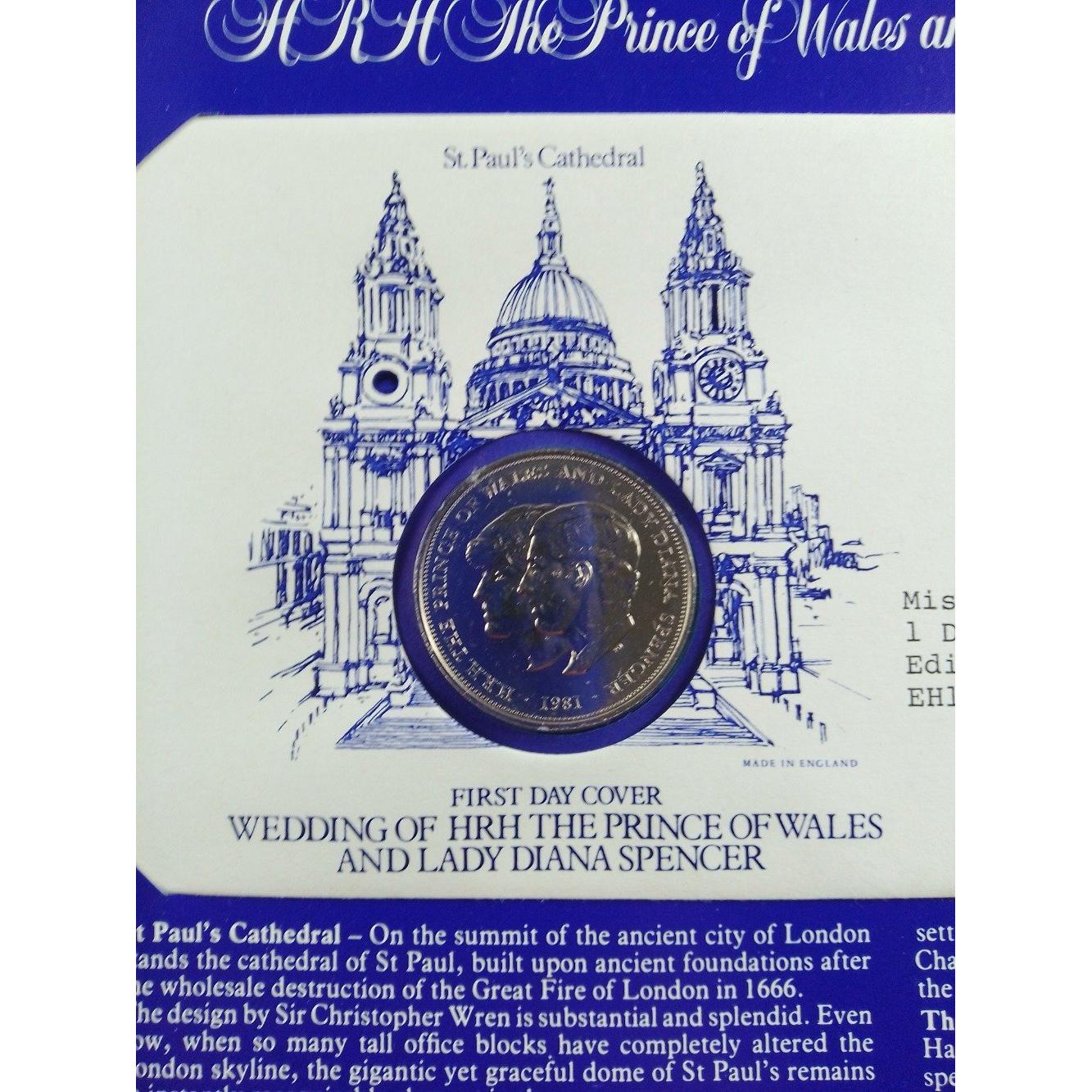A DANBURY MINT Commemorative First Day Cover stamps and Crown coin wedding of HRH Prince Of Wales and Lady Diana Spencer 1981 all within a presentation card and within its original postage card envelope