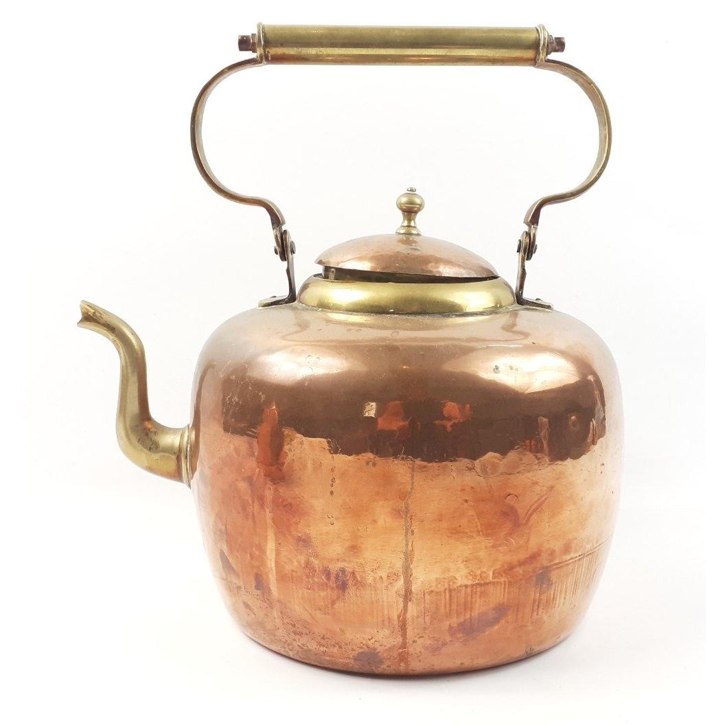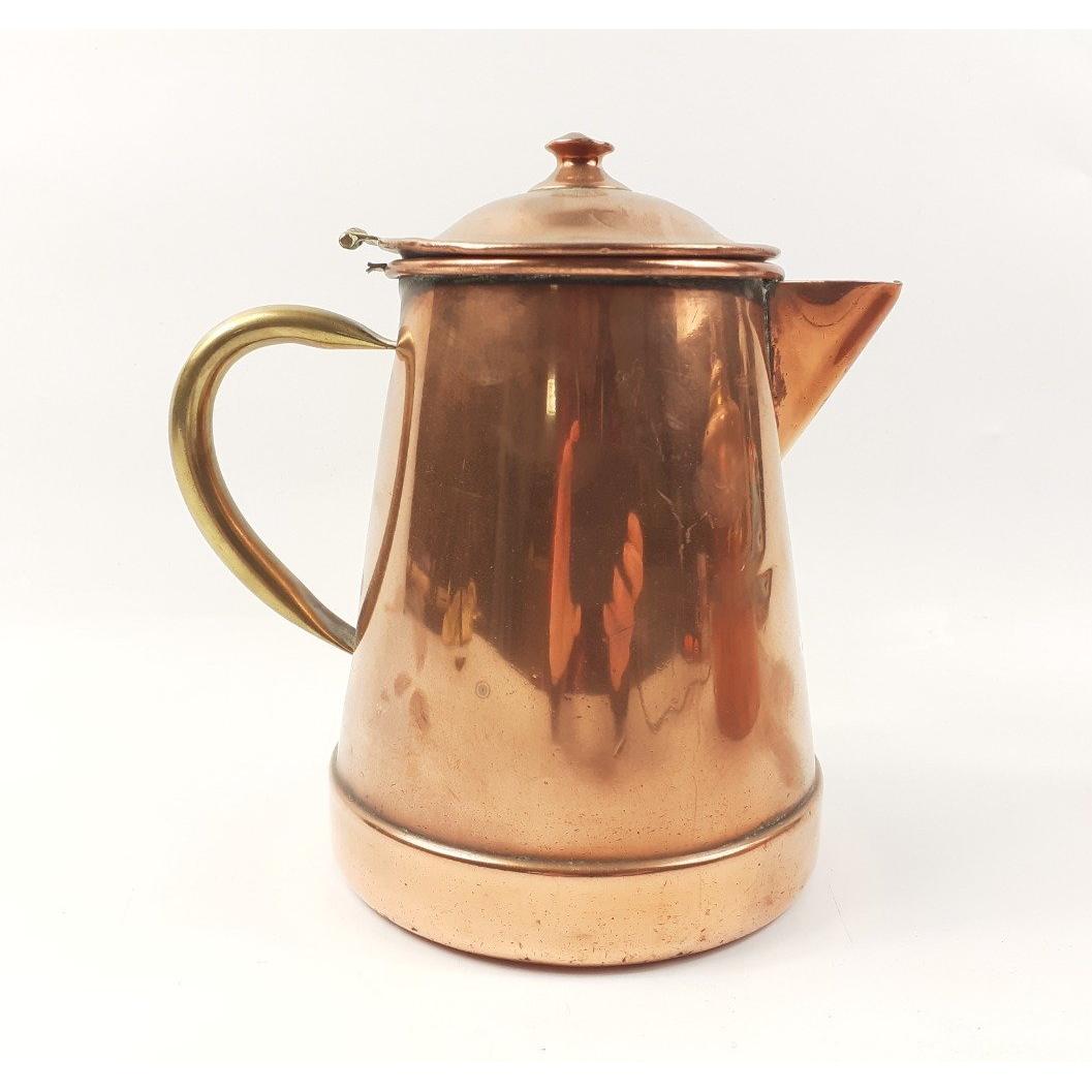 VINTAGE! A large and imposing copper and brass-handled kettle (28cm high to top of handle), also includes a similar coffee pot, needing new pin in lidApprox 2 pieces