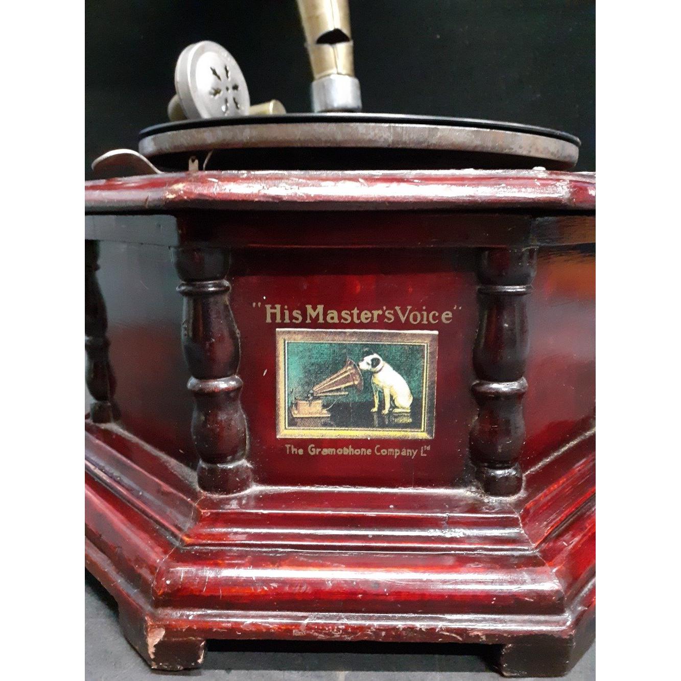An HMV gramophone in working order with large brass horn and winding handle on an octagonal wood varnished base with lovely original Nipper logo. Comes with one 75rpm shellac diskApprox 1 pieces