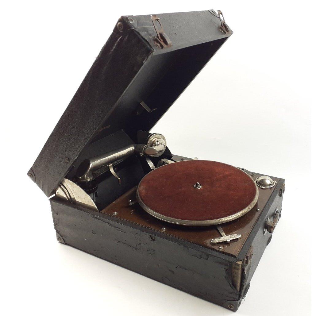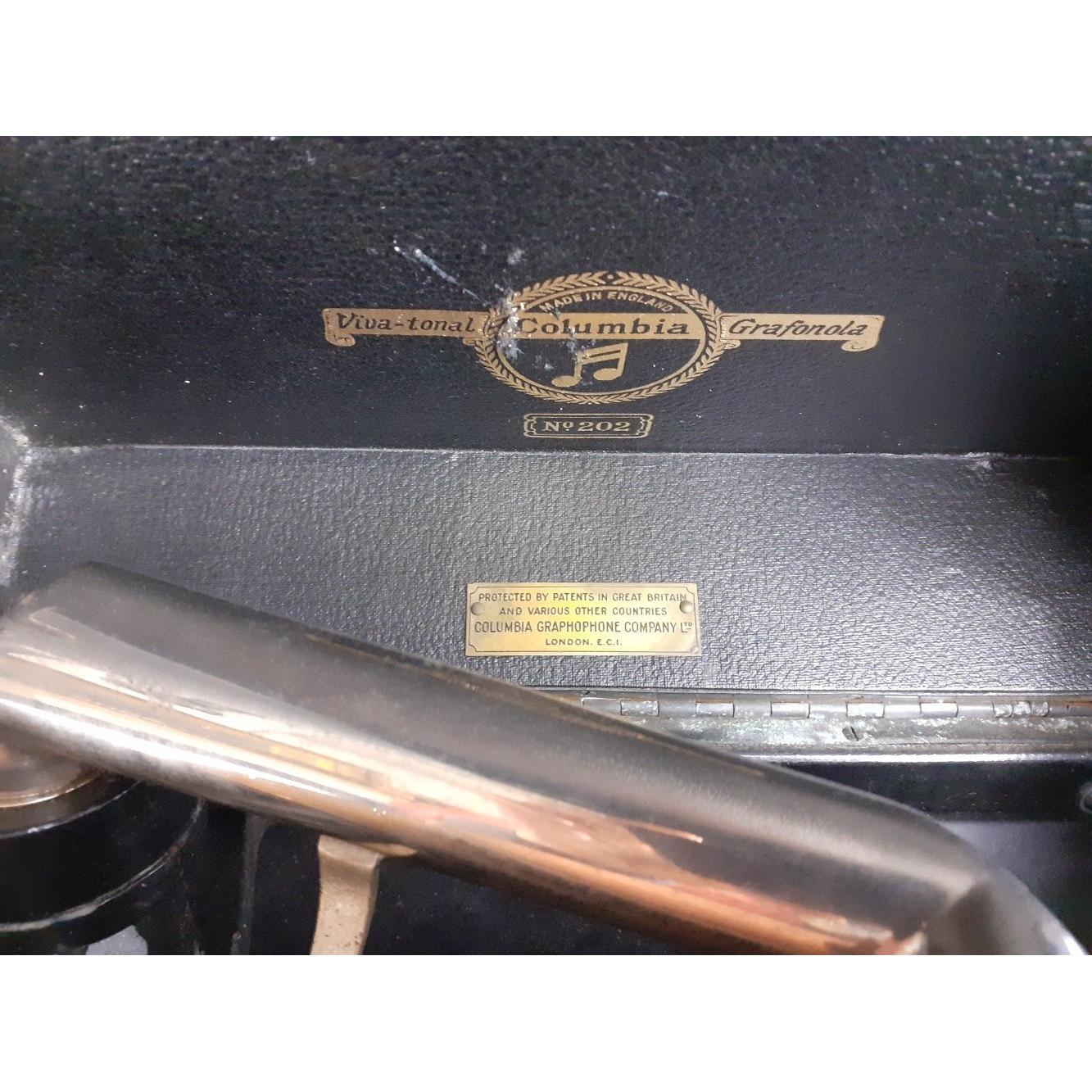 A COLUMBIA GRAFONOLA portable record player model 202 thoroughly refurbished in 2010 when the winding handle was replaced, a reconditioned soundbox for the tone arm was added and new carrying handle also added