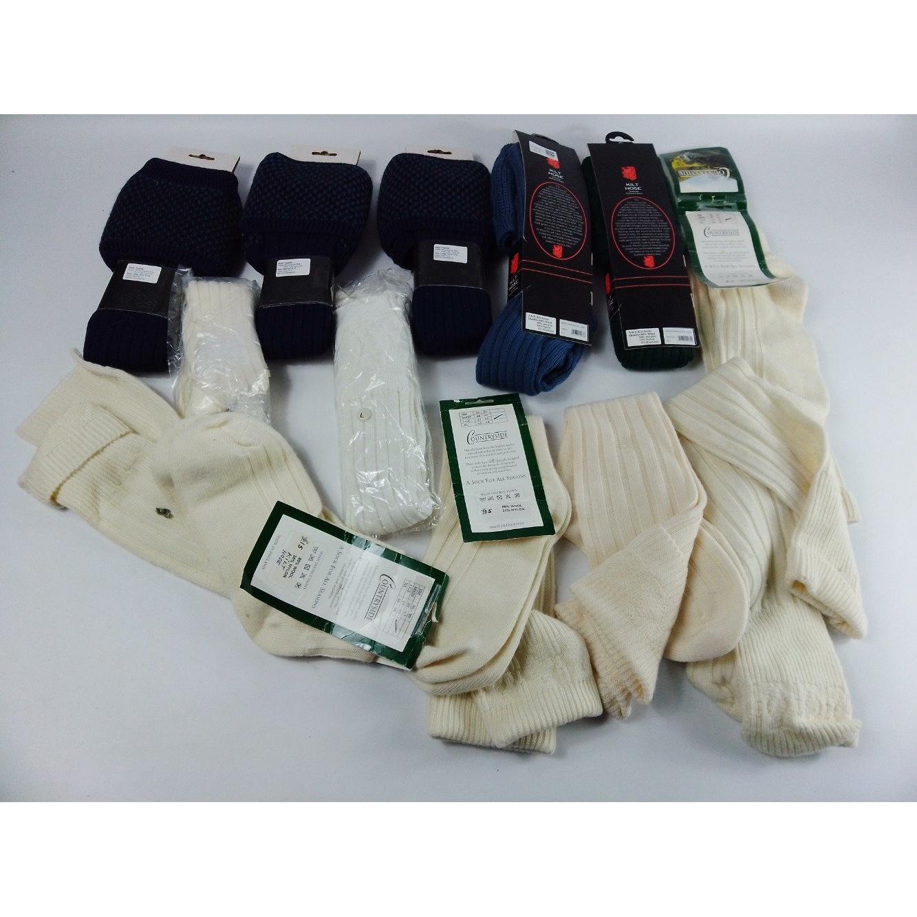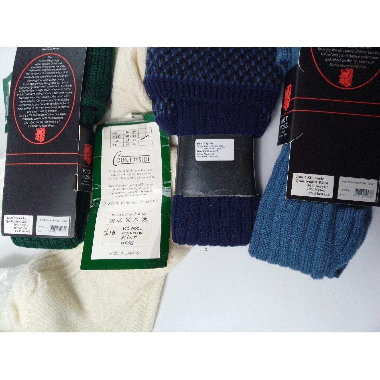 Warm socks for cold days with 4 pairs of COUNTRYSIDE kilt hose - 1 size medium (40-42) and 3 size large (43-45), 3 pairs of TAYSIDE navy blue socks (1size medium and 2 size large), 1 pair of lovat blue size 9-13 kilt hose, 1 pair of bottle green kilt hose size 6-9 plus 3 others unlabelled. All unused