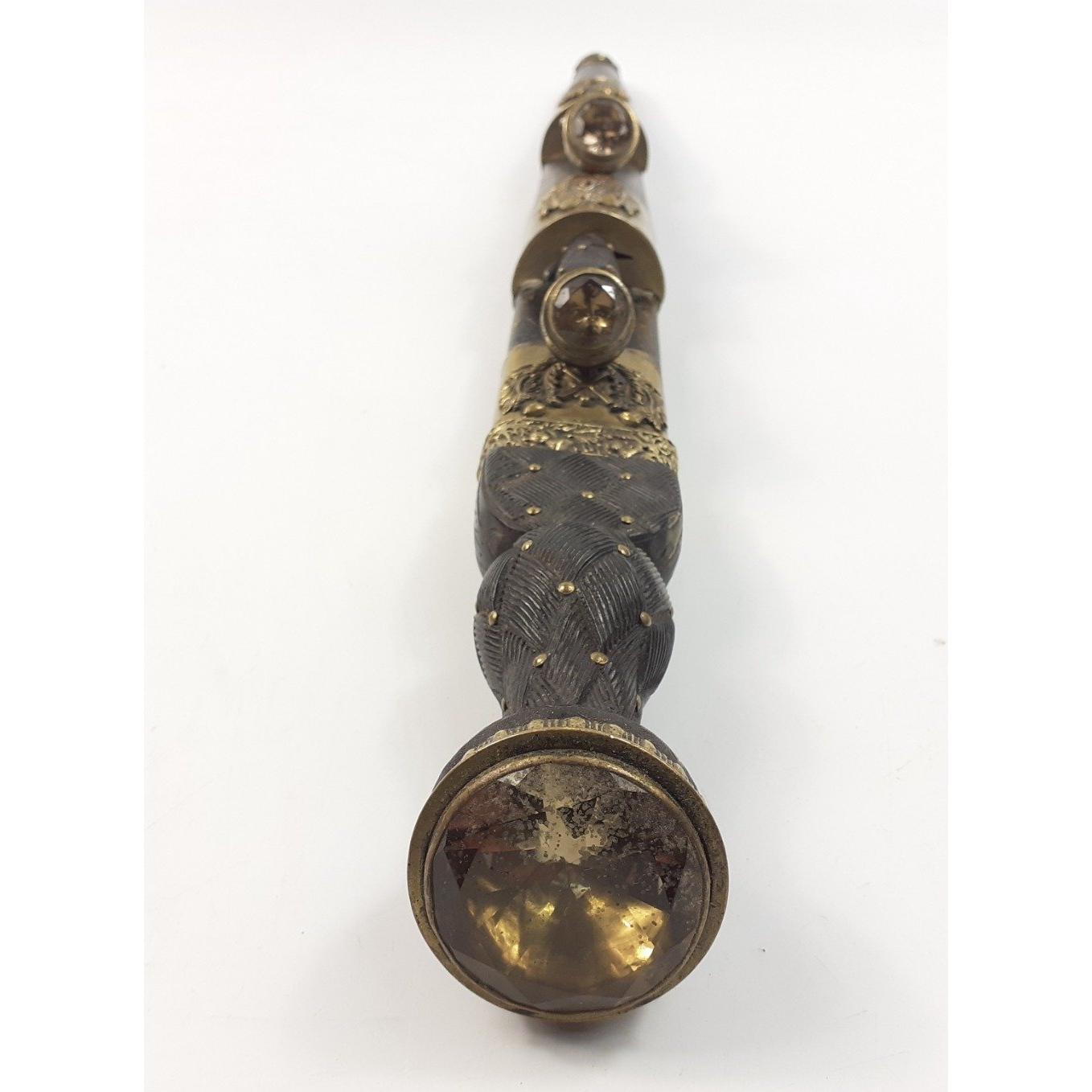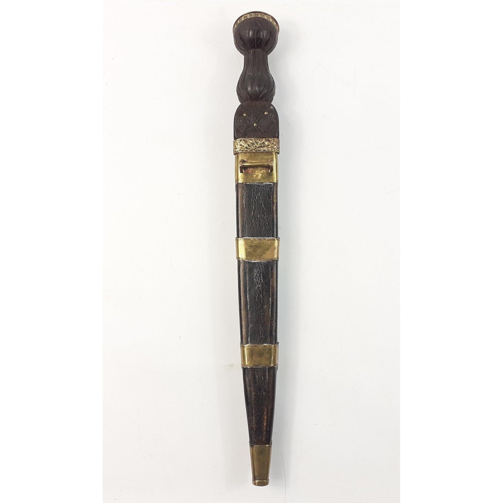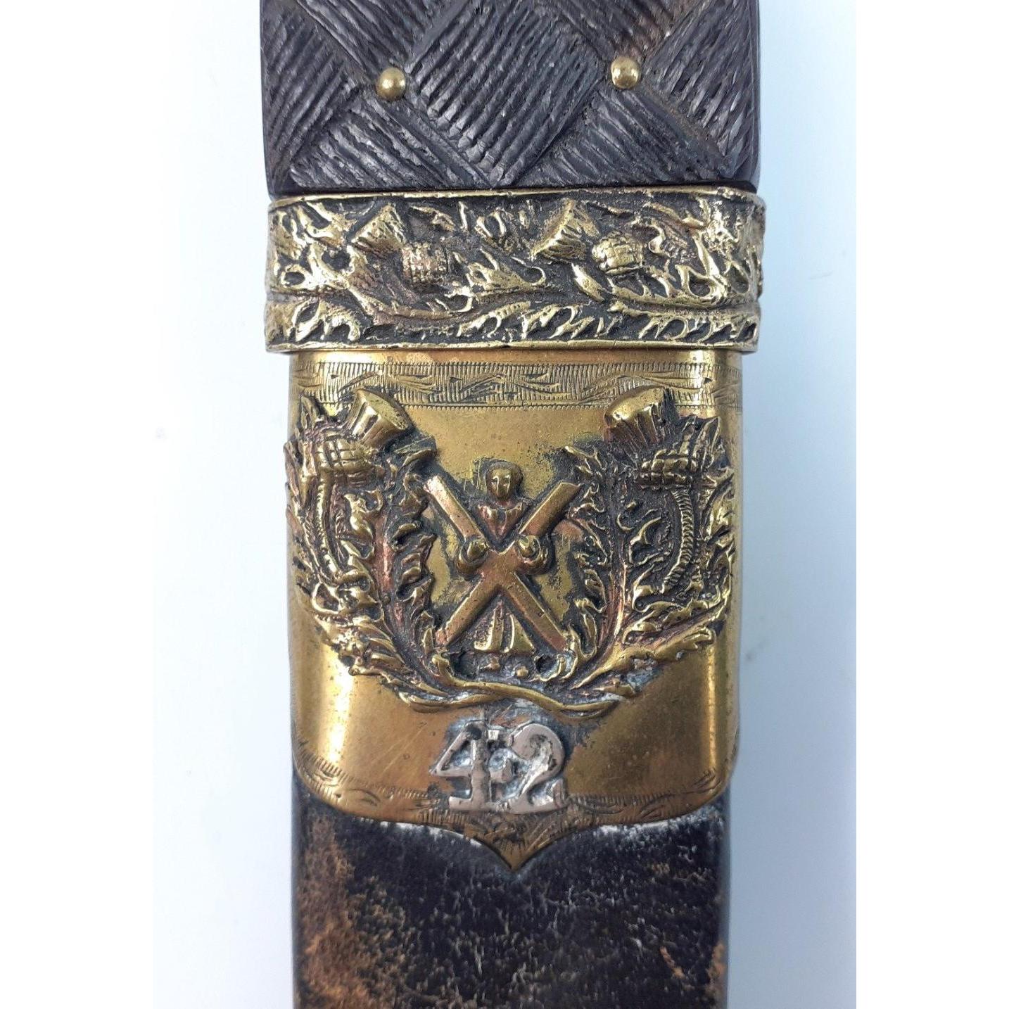 SCOTTISH INTEREST - An ANTIQUE Brass Mounted 19th Century Scottish Highland Dagger Sgian Dubh, heavily embossed bands on the scabbard and with a lovely large SMOKEY QUARTZ 4cm stone. Knife and fork present and in good order both with nice matching stones to top. Blade fullered with notched top and is in excellent order as is the scabbard. 44cm long. A beautiful piece and uncleaned. Carries regimental crest with 42 below, Black Watch interest.