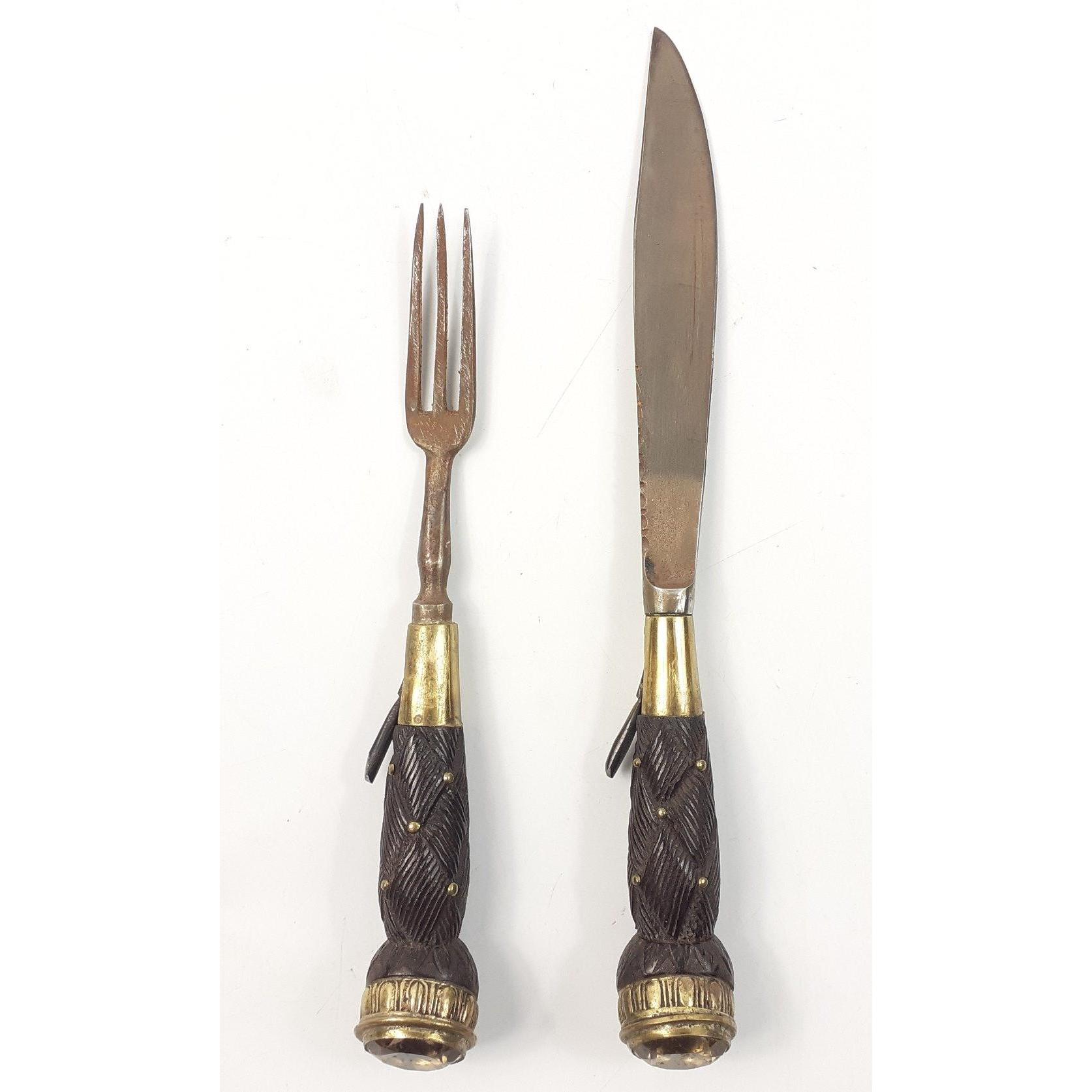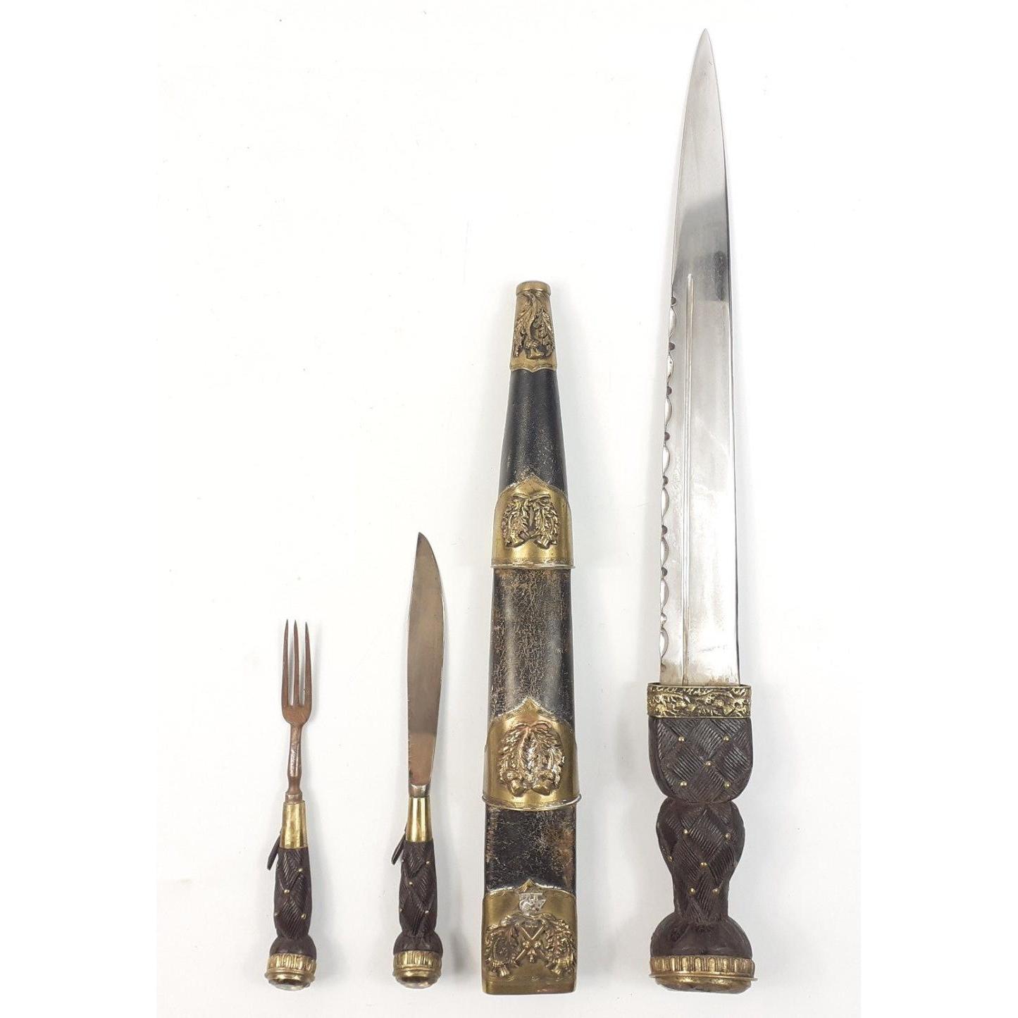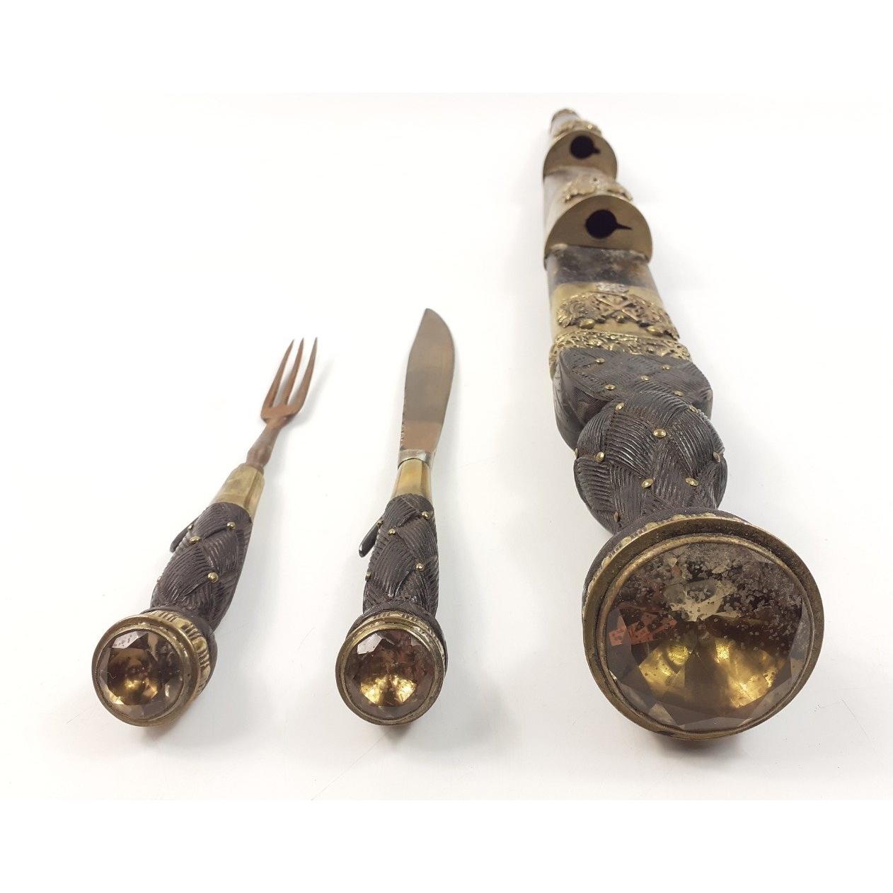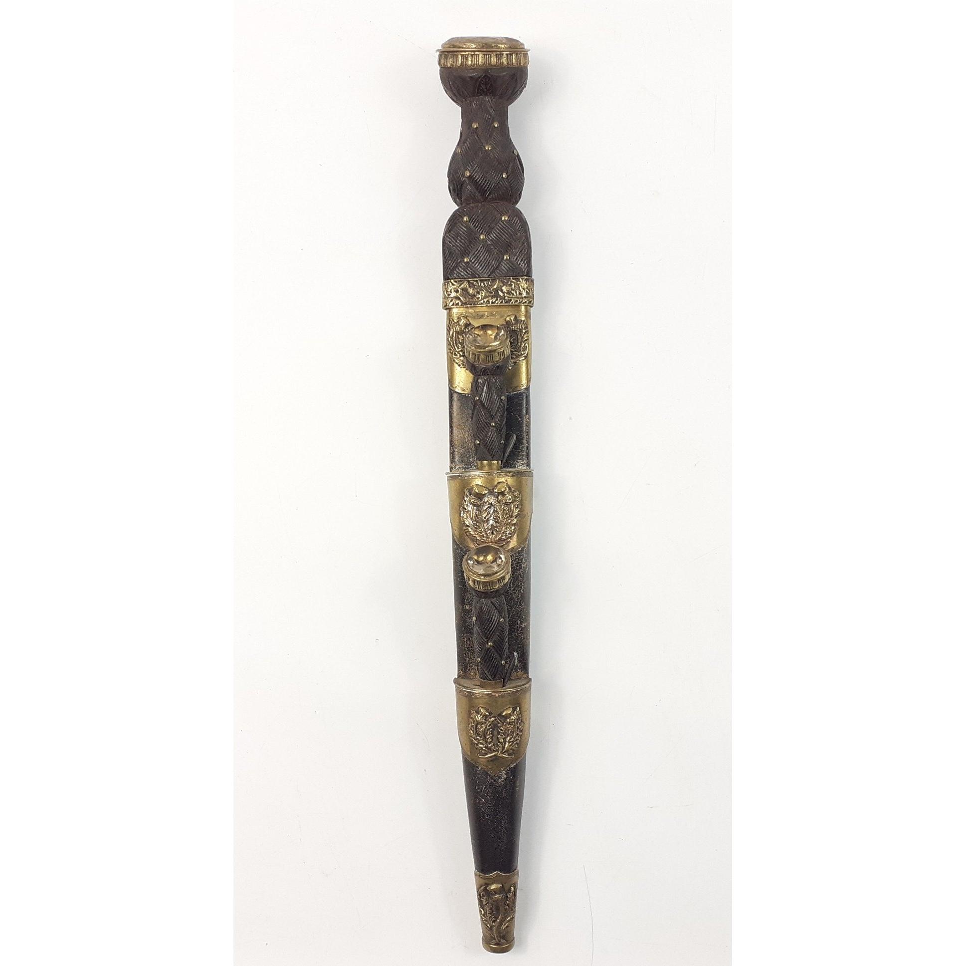 SCOTTISH INTEREST - An ANTIQUE Brass Mounted 19th Century Scottish Highland Dagger Sgian Dubh, heavily embossed bands on the scabbard and with a lovely large SMOKEY QUARTZ 4cm stone. Knife and fork present and in good order both with nice matching stones to top. Blade fullered with notched top and is in excellent order as is the scabbard. 44cm long. A beautiful piece and uncleaned. Carries regimental crest with 42 below, Black Watch interest.