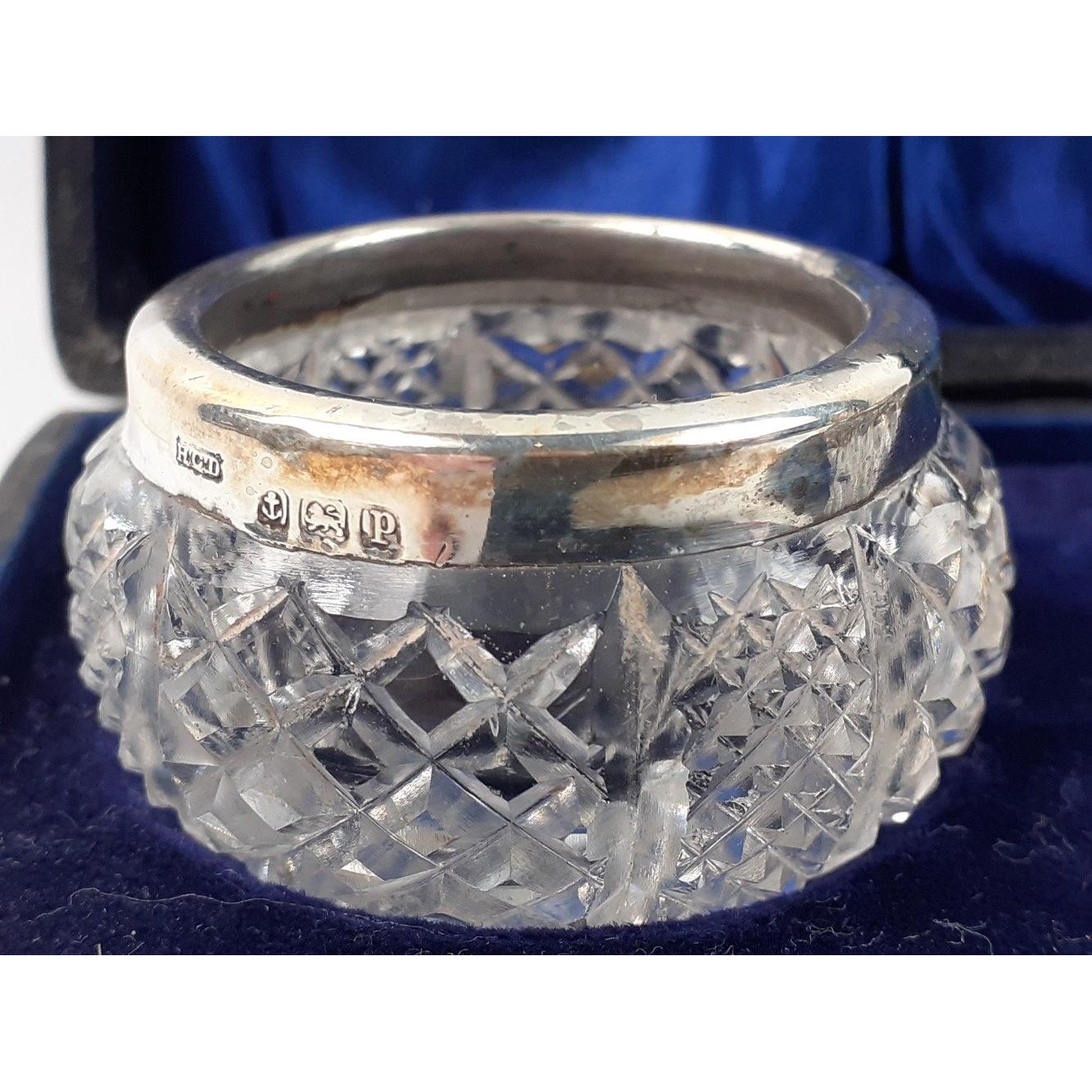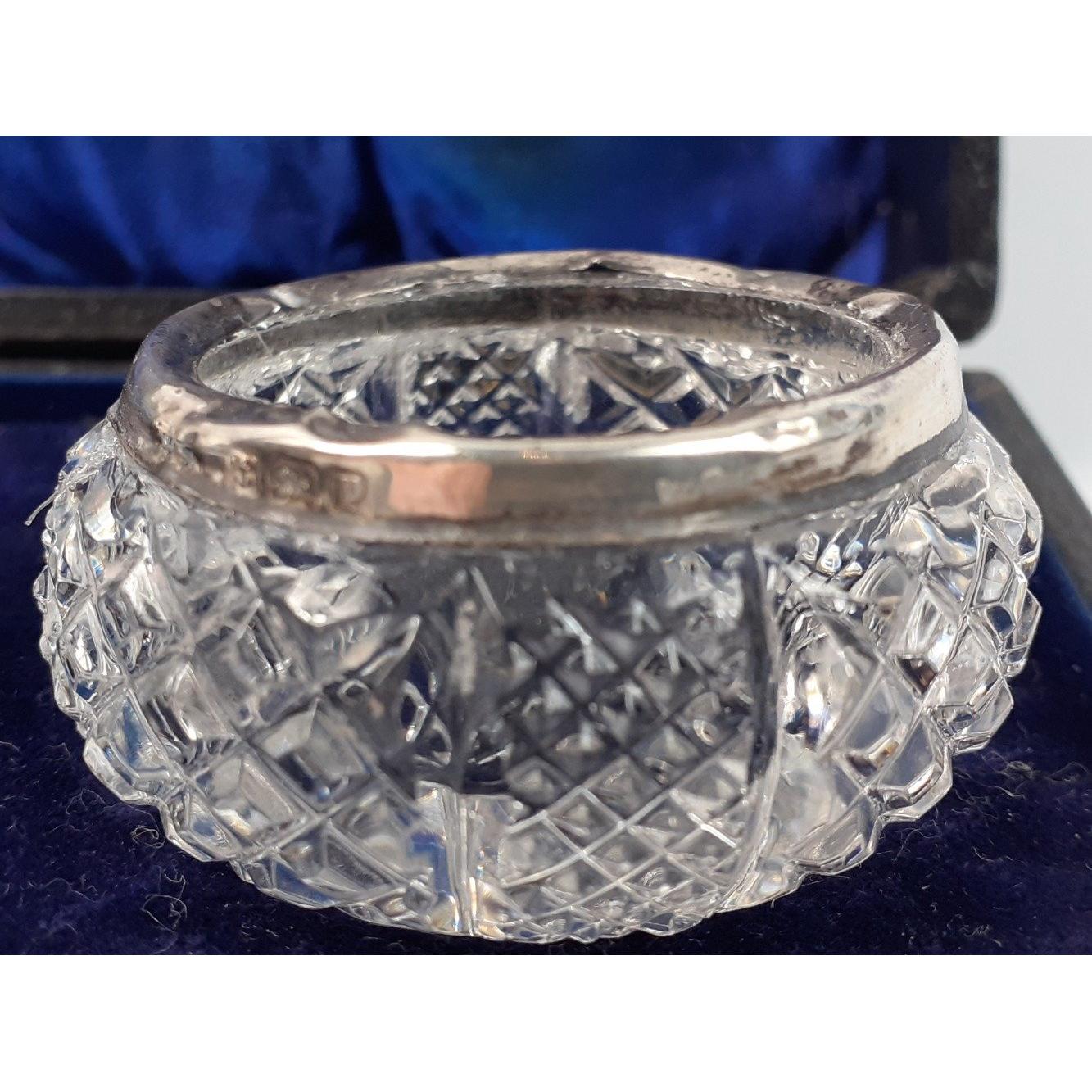 A box with 2 silver collared condiment dishes, hallmarked Birmingham with letter small P. Collars do have some damageApprox 1 pieces