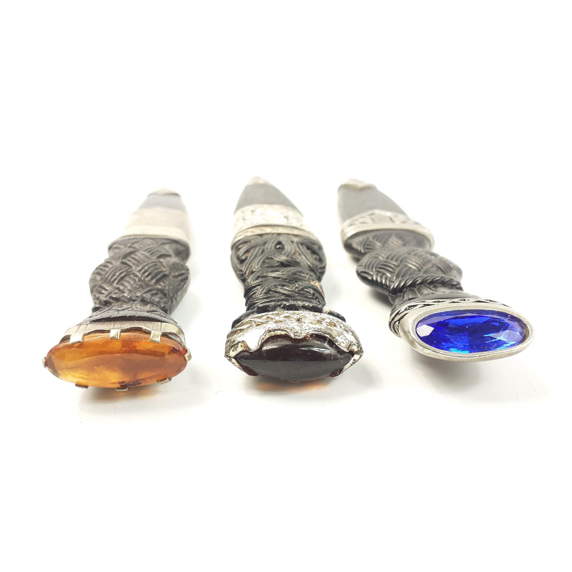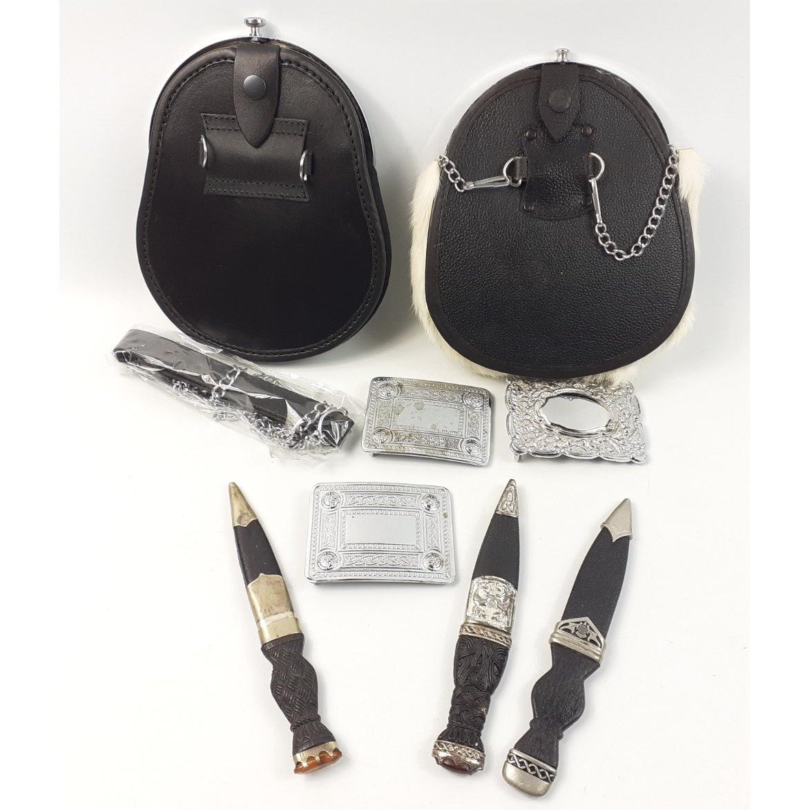 Scottish Highland dress accessories to include a white fur sporran from Heritage of Scotland, Edinburgh, a sporran decorated with the Saltire, a black sporran, an unused sporran belt, 3 belt buckles and 3 sgian dubh