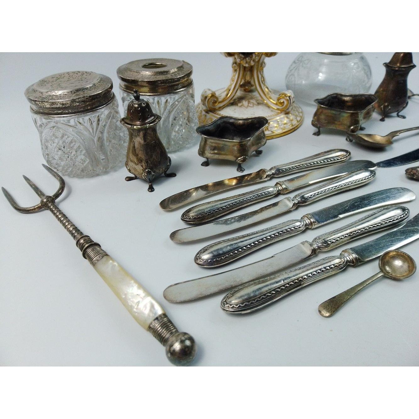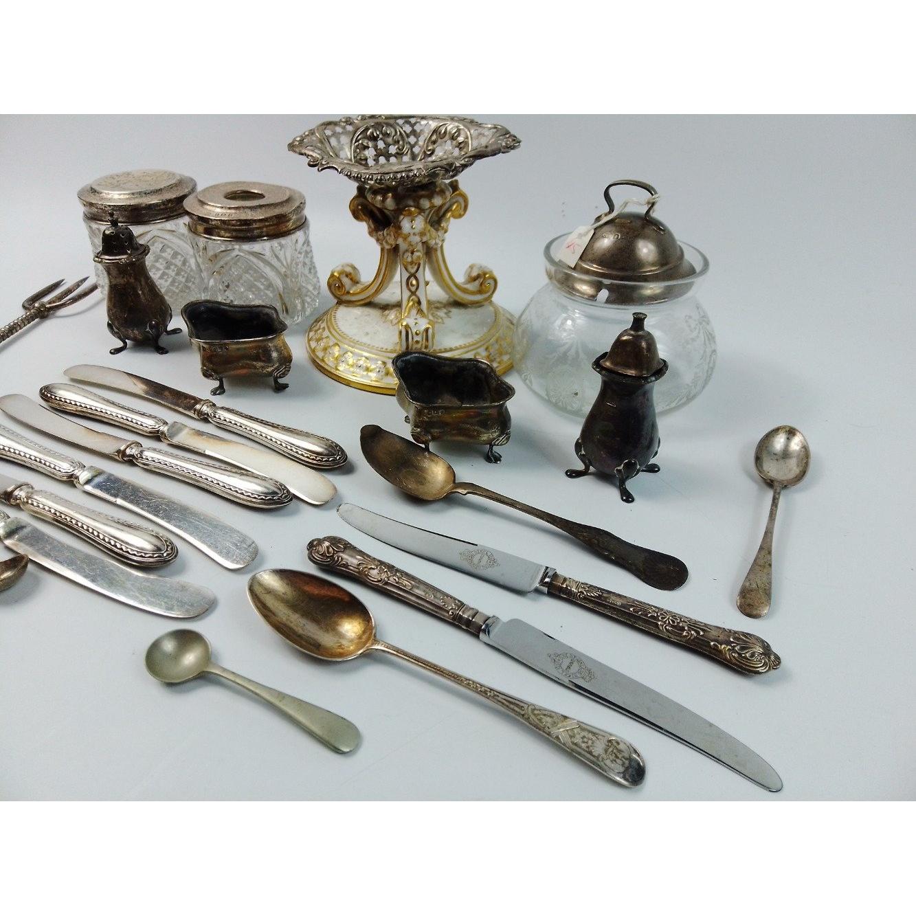 A small silver collection including 2 small glass jars with silver lids and gilt interior (27g approx), indistinct Birmingham hallmark, an etched glass jam pot with silver lid (Birmingham hallmark 22g), 2 spoons (1 with Sheffield mark), a 4 piece condiment set (Sheffield and Birmingham W&H marks weight 117g approx), a miniature toasting fork with mother-of-pearl on handle (Sheffield 1900 gross weight 61g approx), a teaspoon (Glasgow 1886 weight 16g approx), 2 butter knives with hallmarked handles (Sheffield 1966, gross weight 38g approx) 6 butter knives with hallmarked handles (indistinct Sheffield mark, gross weight 143g approx), and a small hallmarked dish (Birmingham 1905 11x8cm approx) attached to a ceramic base