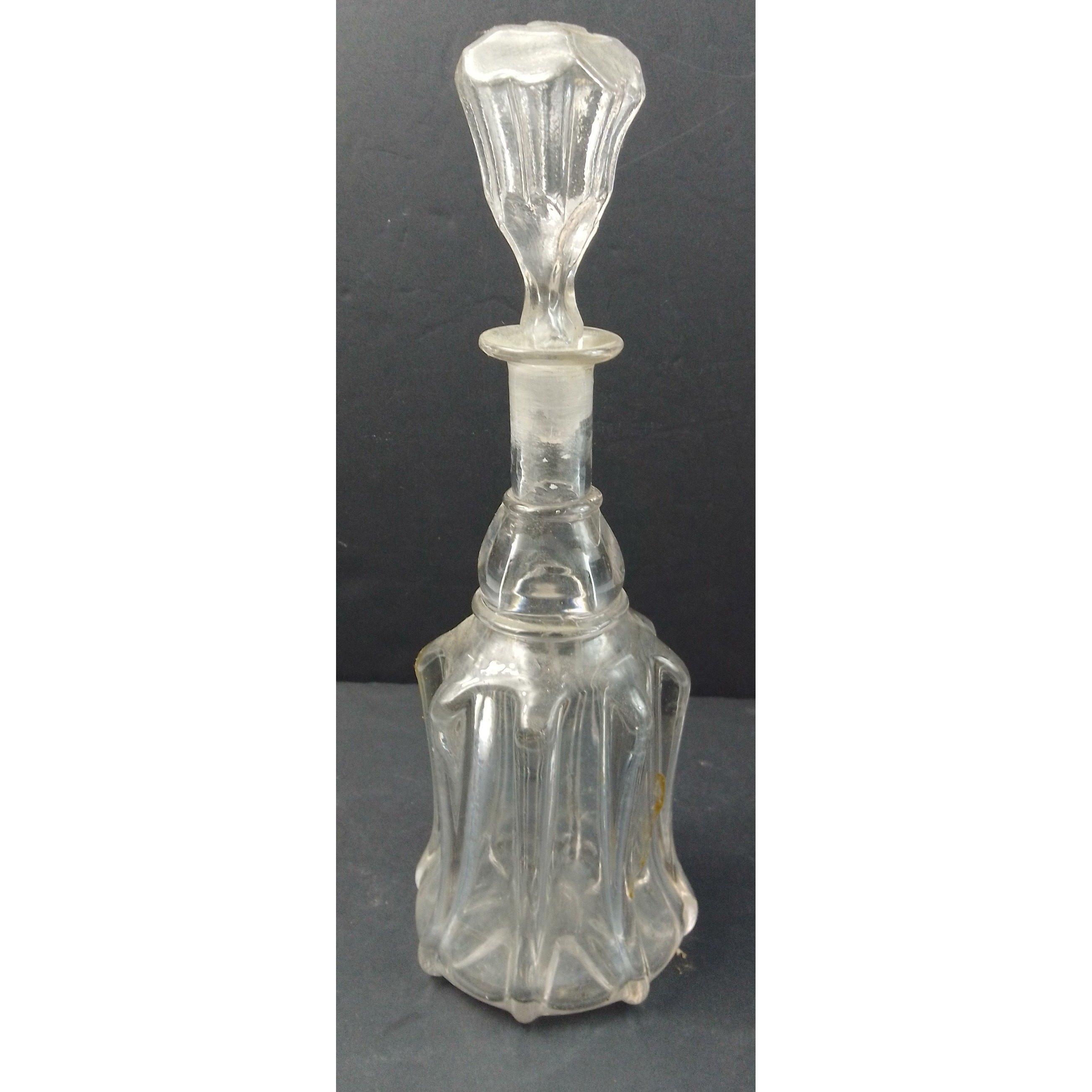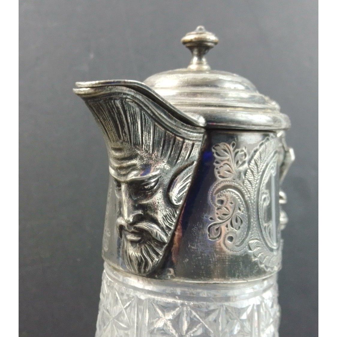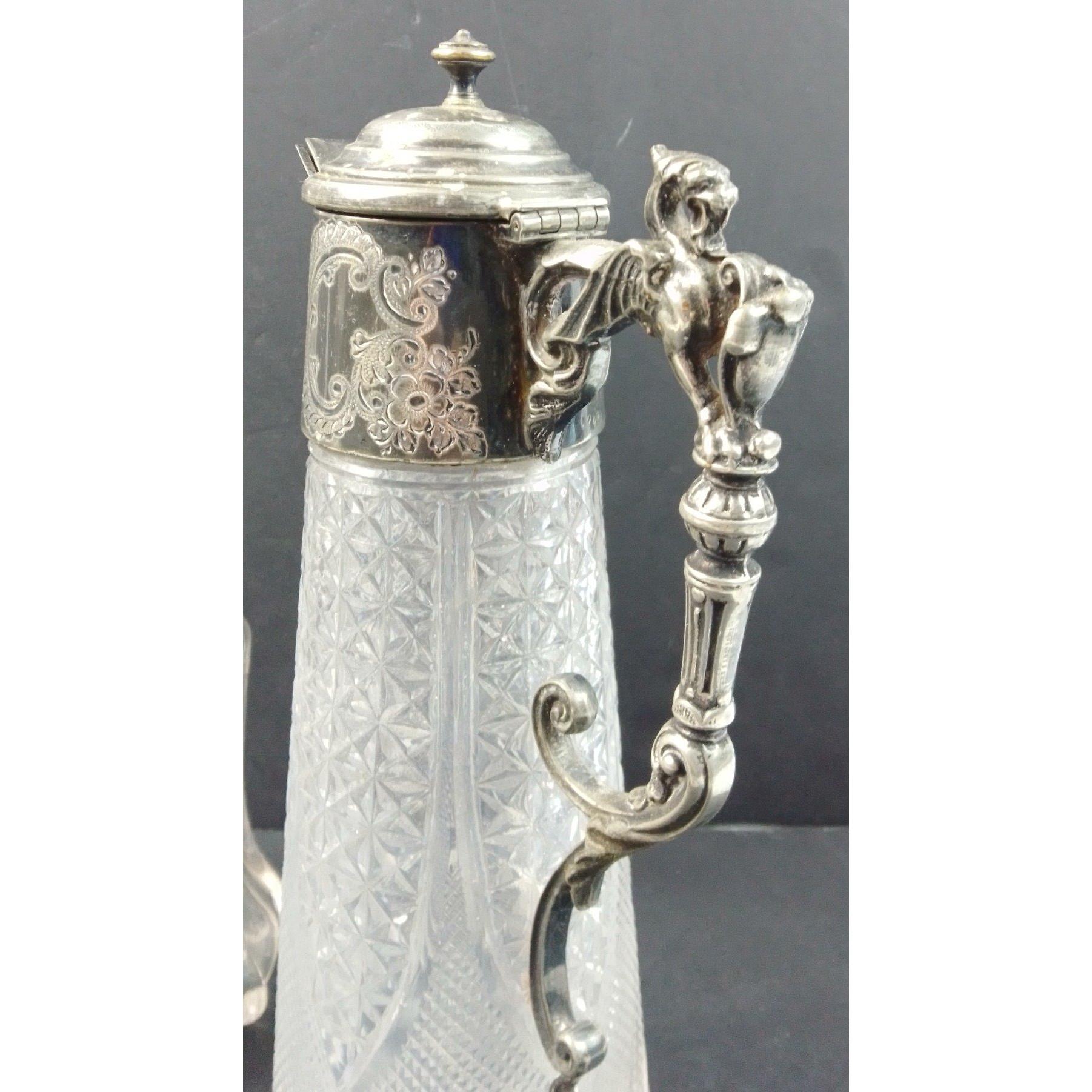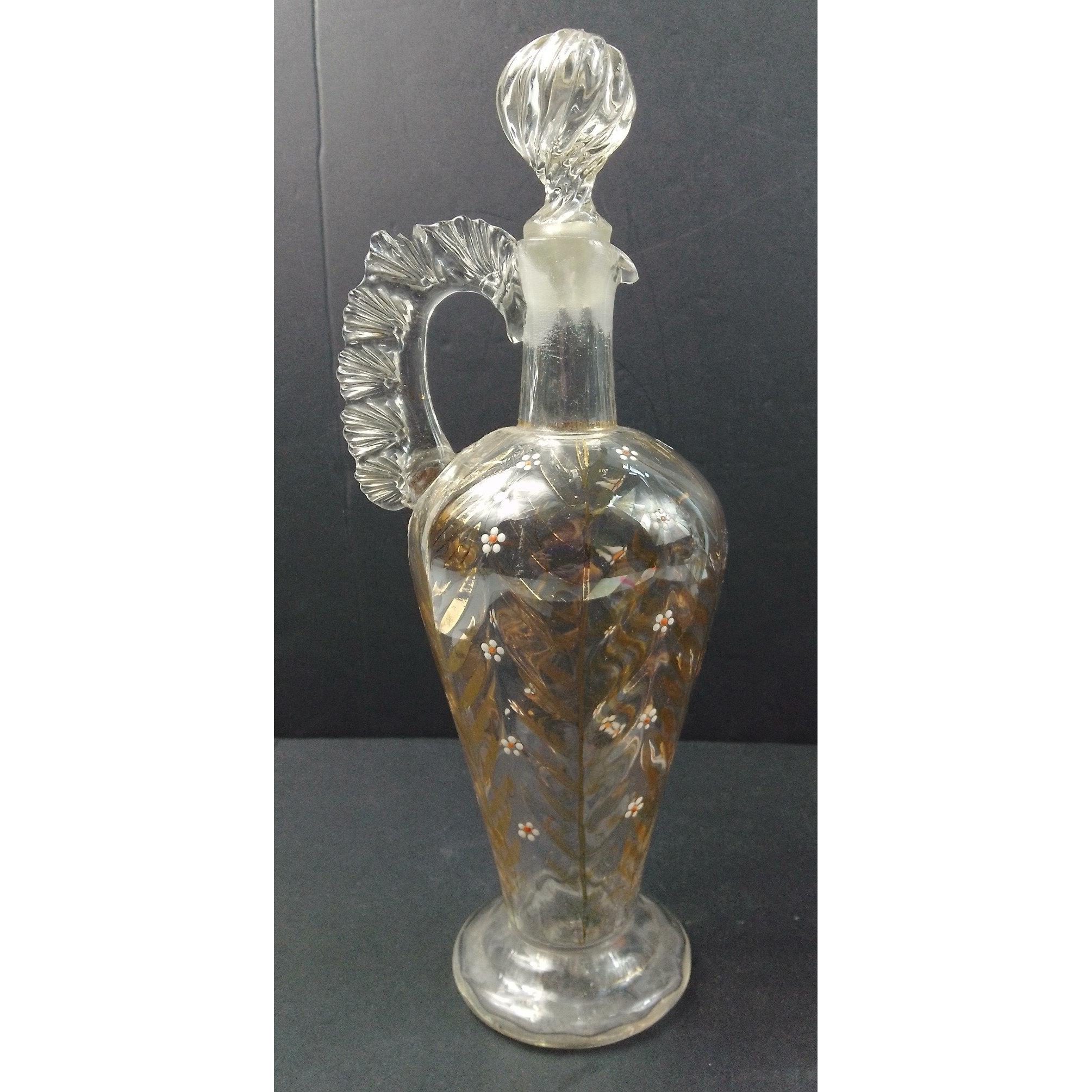 A vintage Bacchus faced glass claret jug with white metal lid (11" high), an unusual delicate hand-painted wine jug with stopper (12" high slight damage to handle) and a vintage decanter with protruding fins (12" high approx)