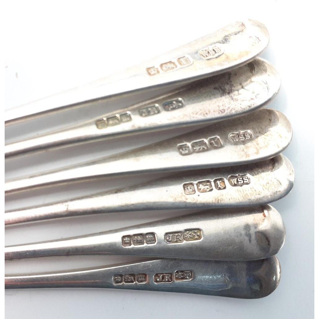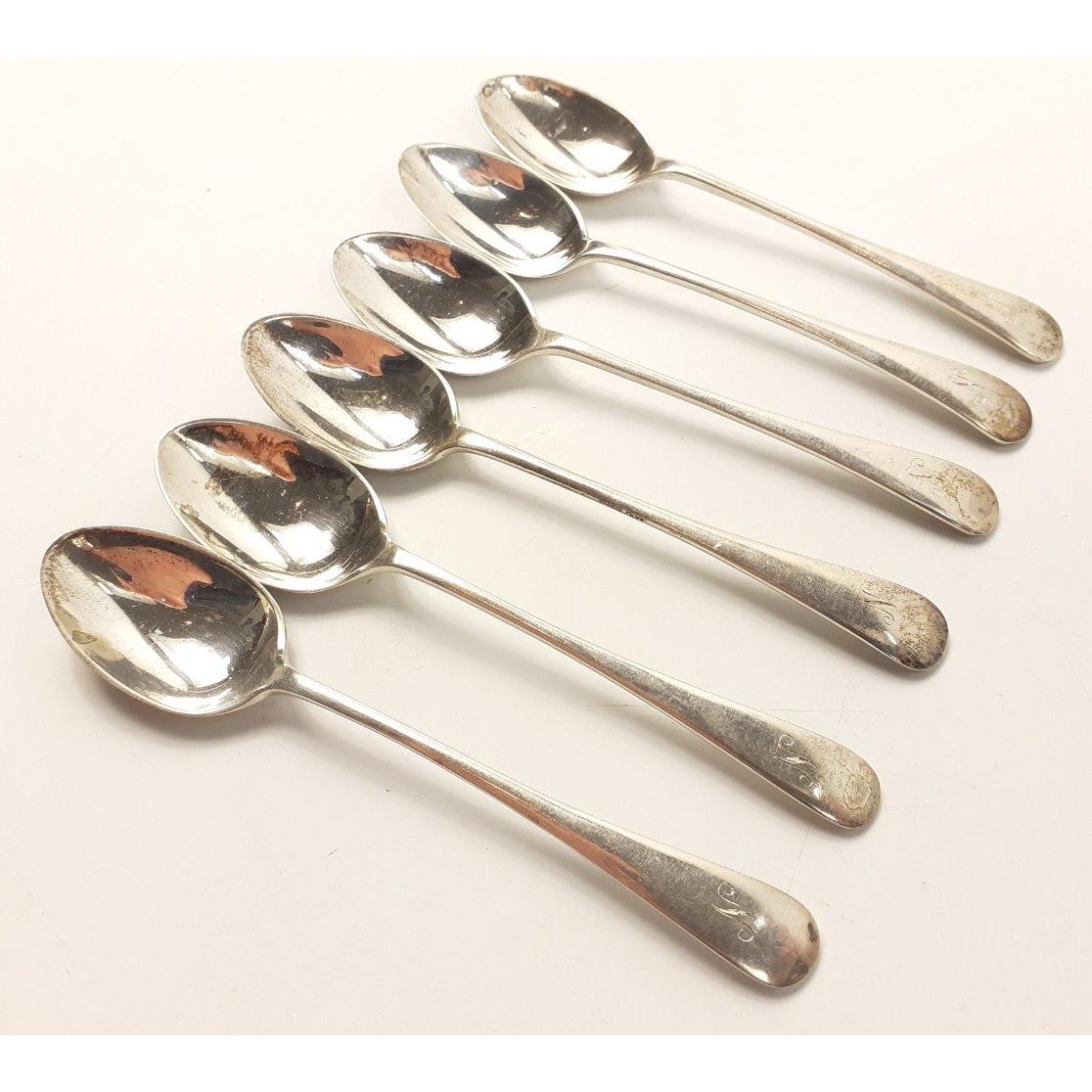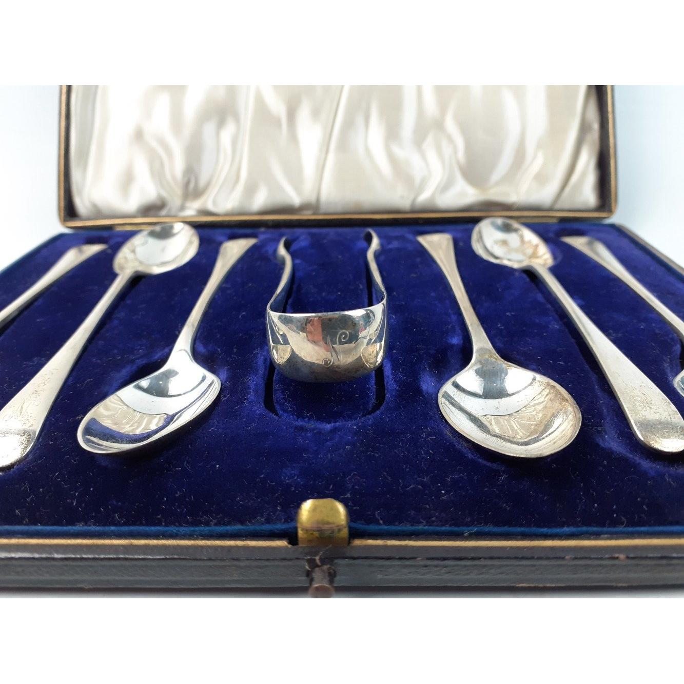 A boxed set of 6 coffee spoons with sugar snips, hallmarked Sheffield 1909 and 1904, with monogram N. Weight 89g approxApprox 1 pieces