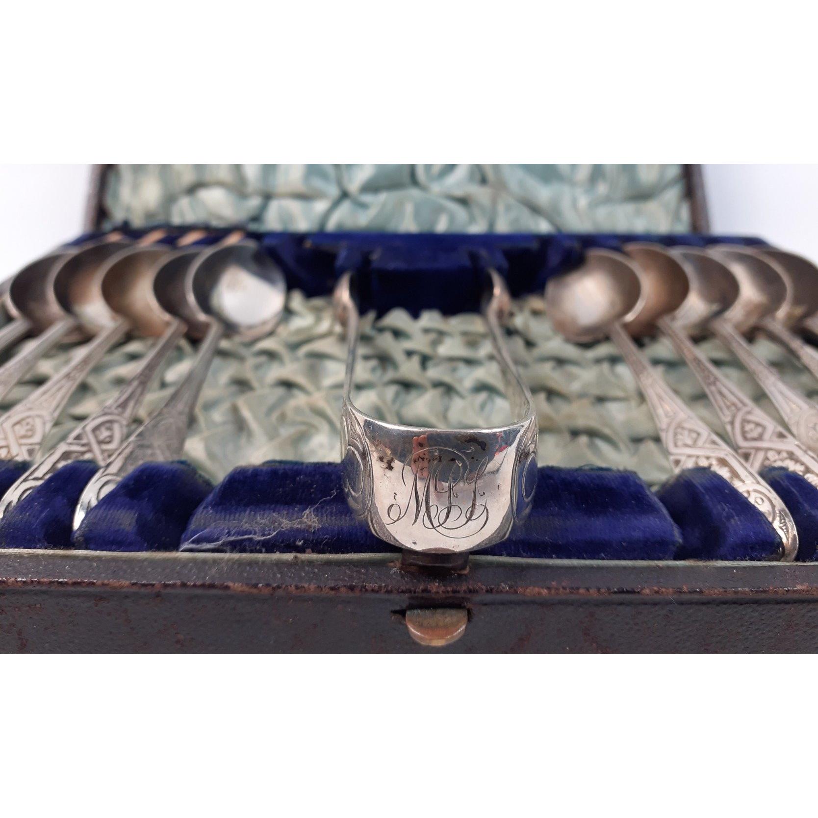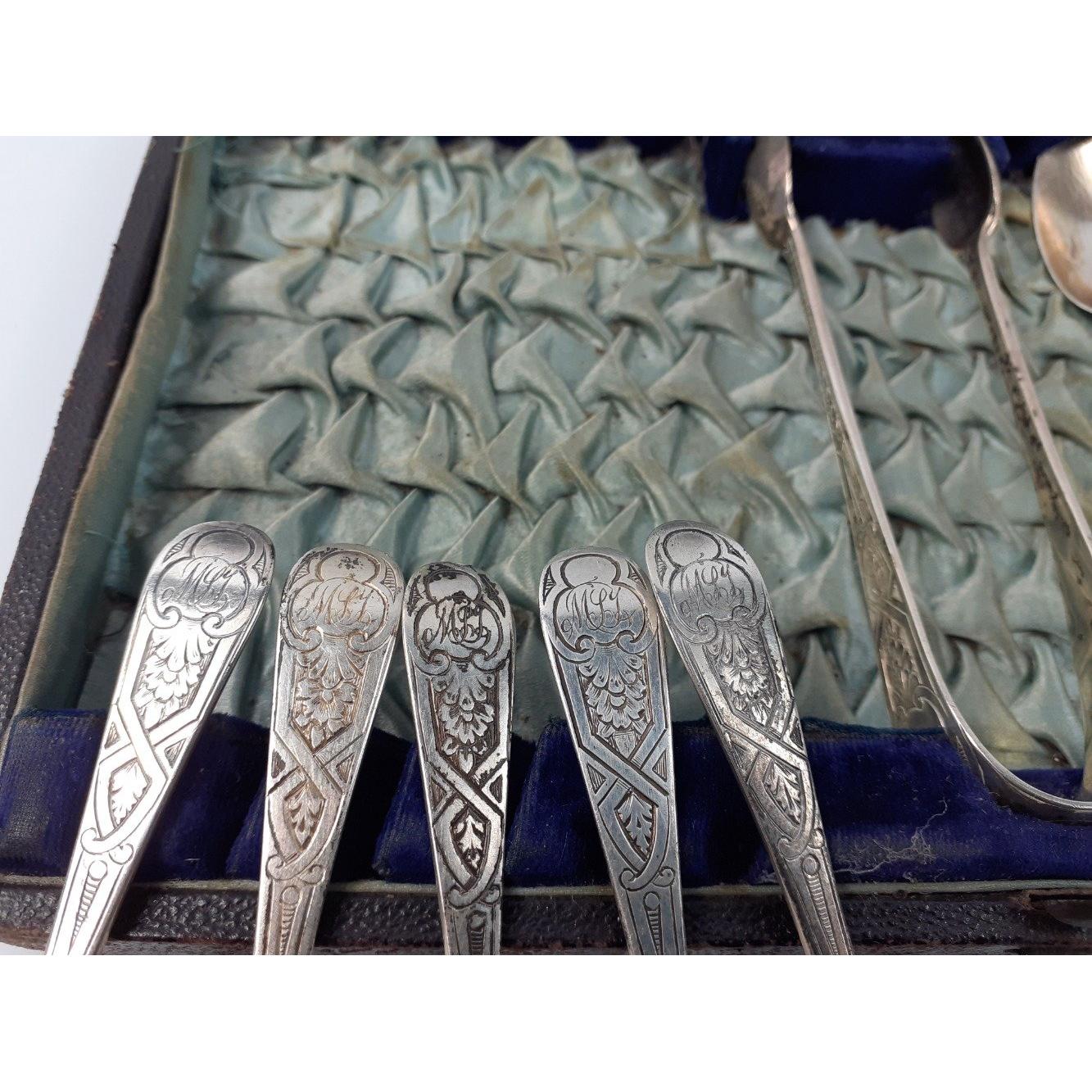 A boxed set of 10 monogrammed silver teaspoons and sugar tongs, carrying full GLASGOW 1886 hallmarks made by Kerr & Phillips, weight 185g approxApprox 1 pieces