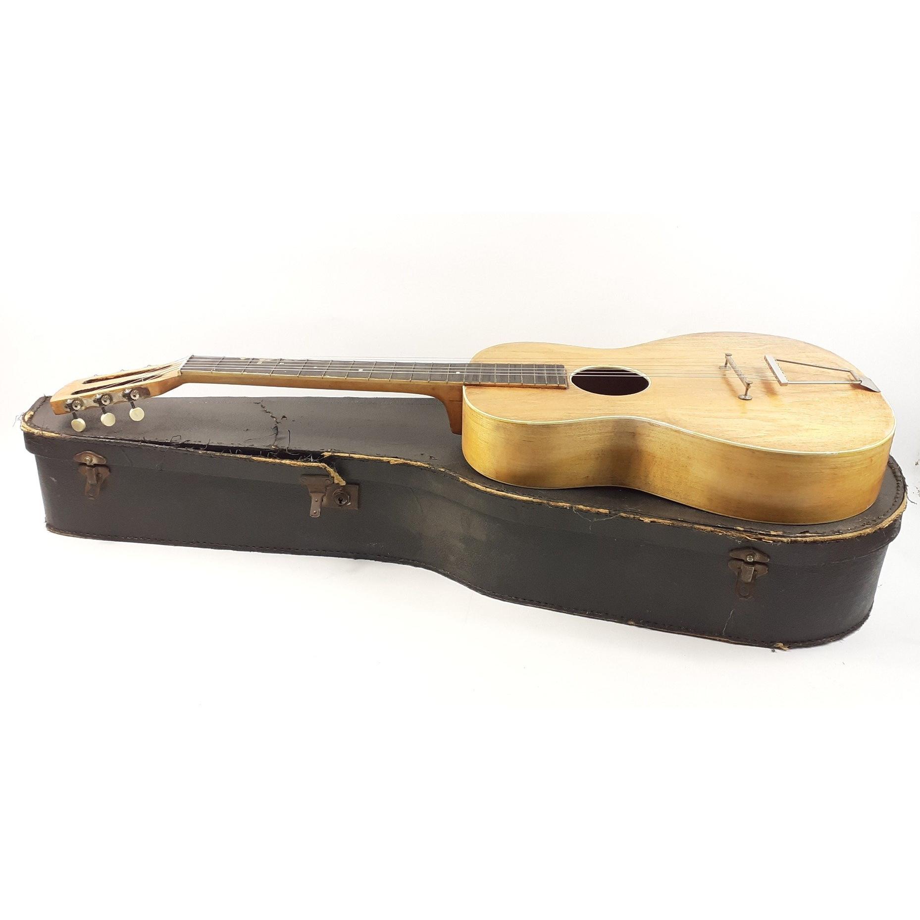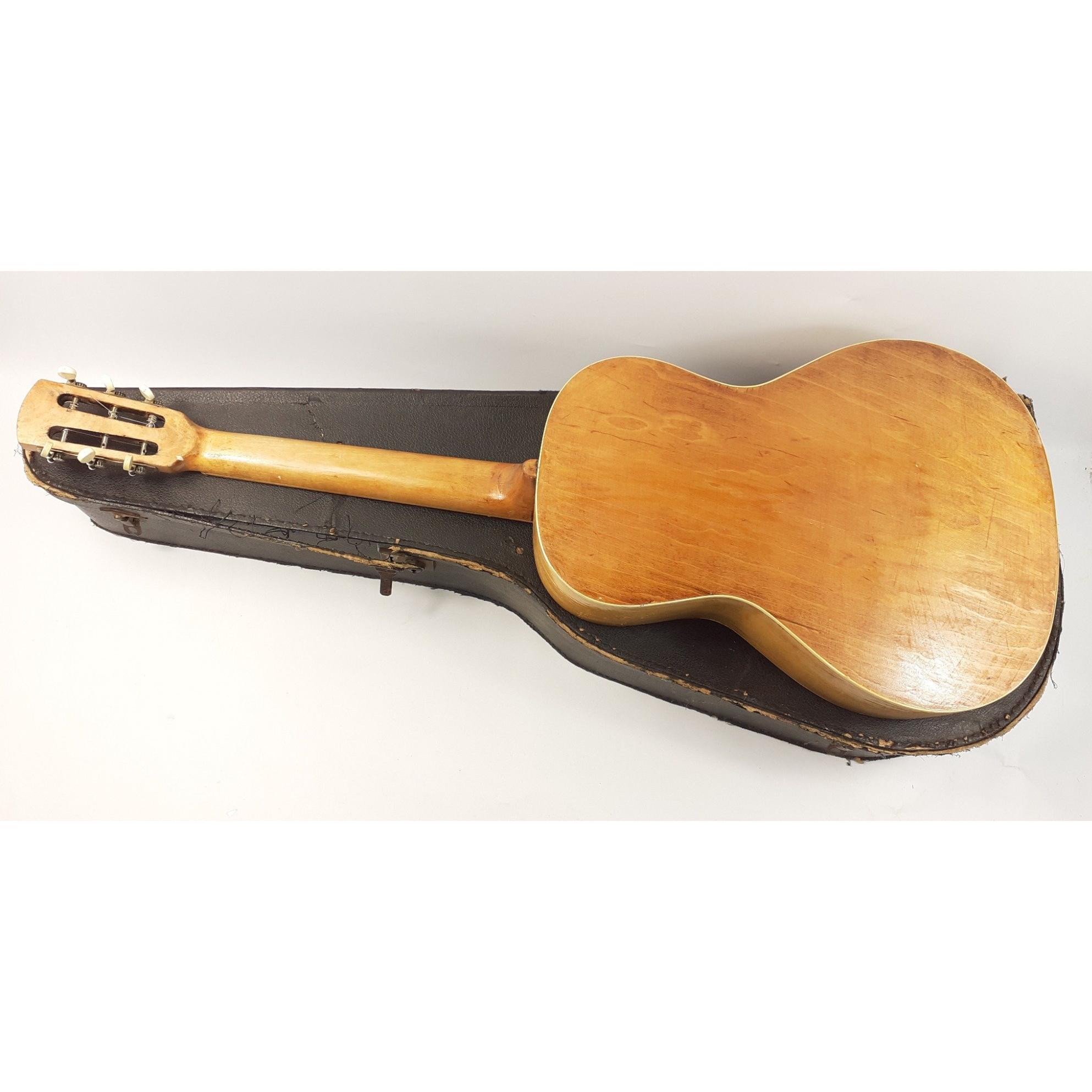 A basic model 6 string acoustic guitar in a worn distressed case