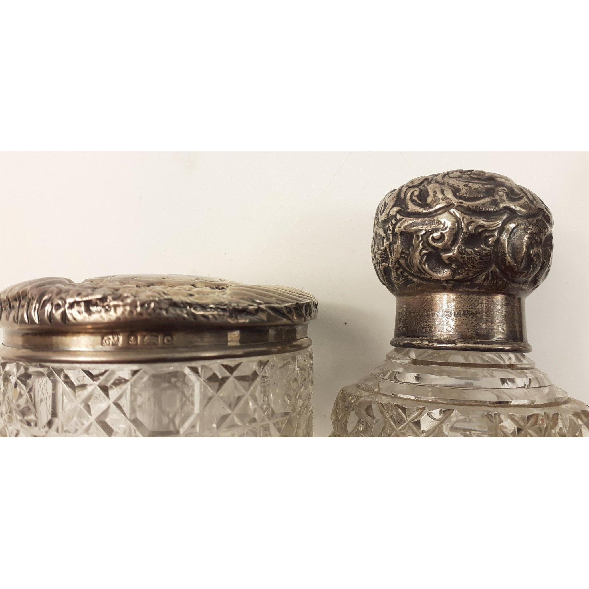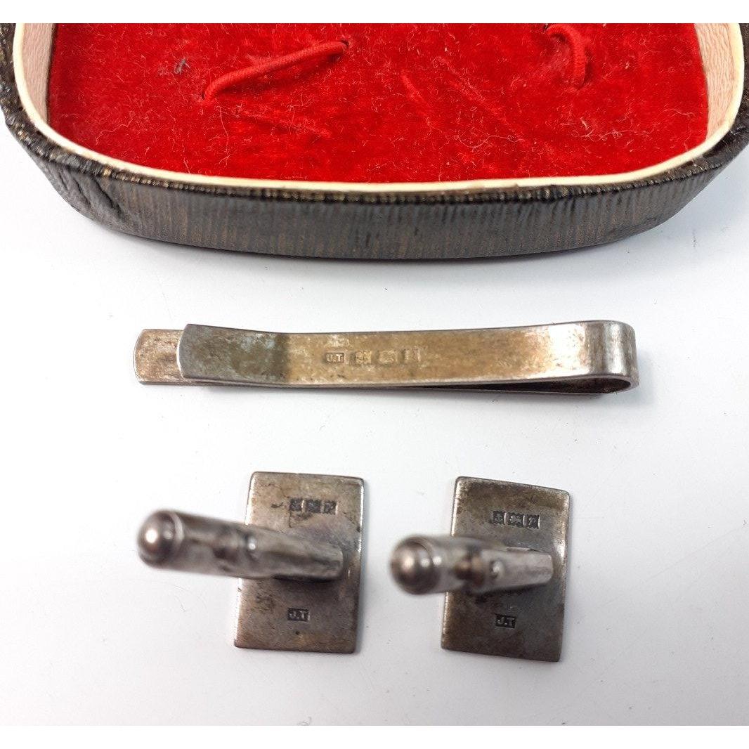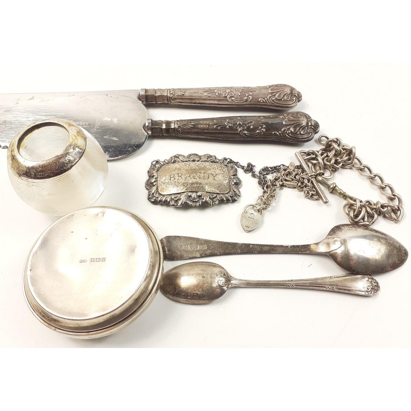 A silver Albert approx 30cm long all links hallmarked, 38g approx, a Sheffield Steel bread knife and cake slice with hallmarked silver handles (Sheffield), 2 glass jars with silver lids, a glass match striker with silver collar, a silver brandy bottle label, a small bowl (Birmingham 1962), a boxed set of hallmarked machine turned tiepin and cufflinks, a spoon etc