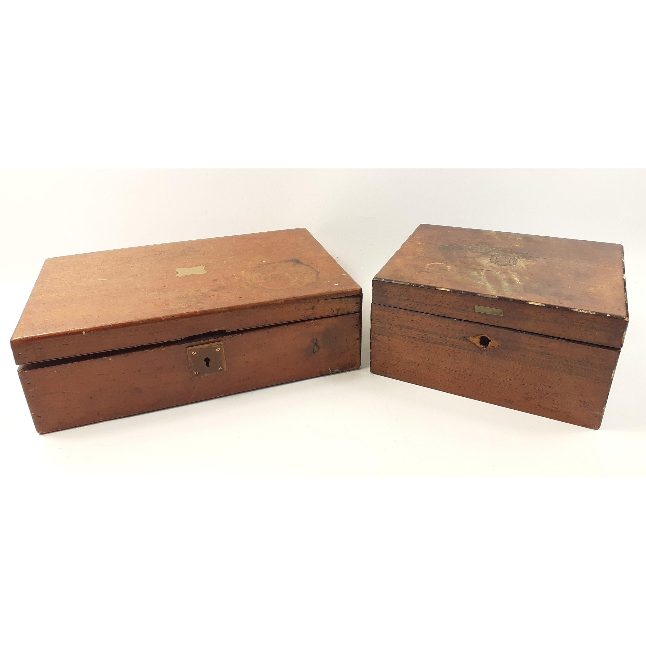 Two wooden boxes, one used as a sewing box 24x19x12cm and a writing slope in need of repair 35x23x10cmApprox 2 pieces