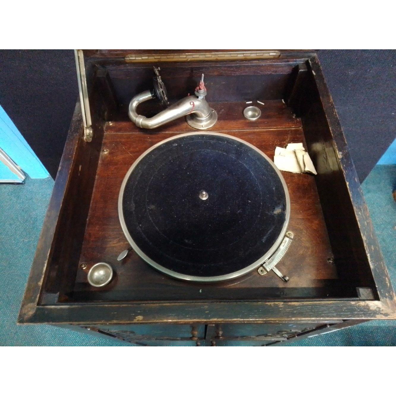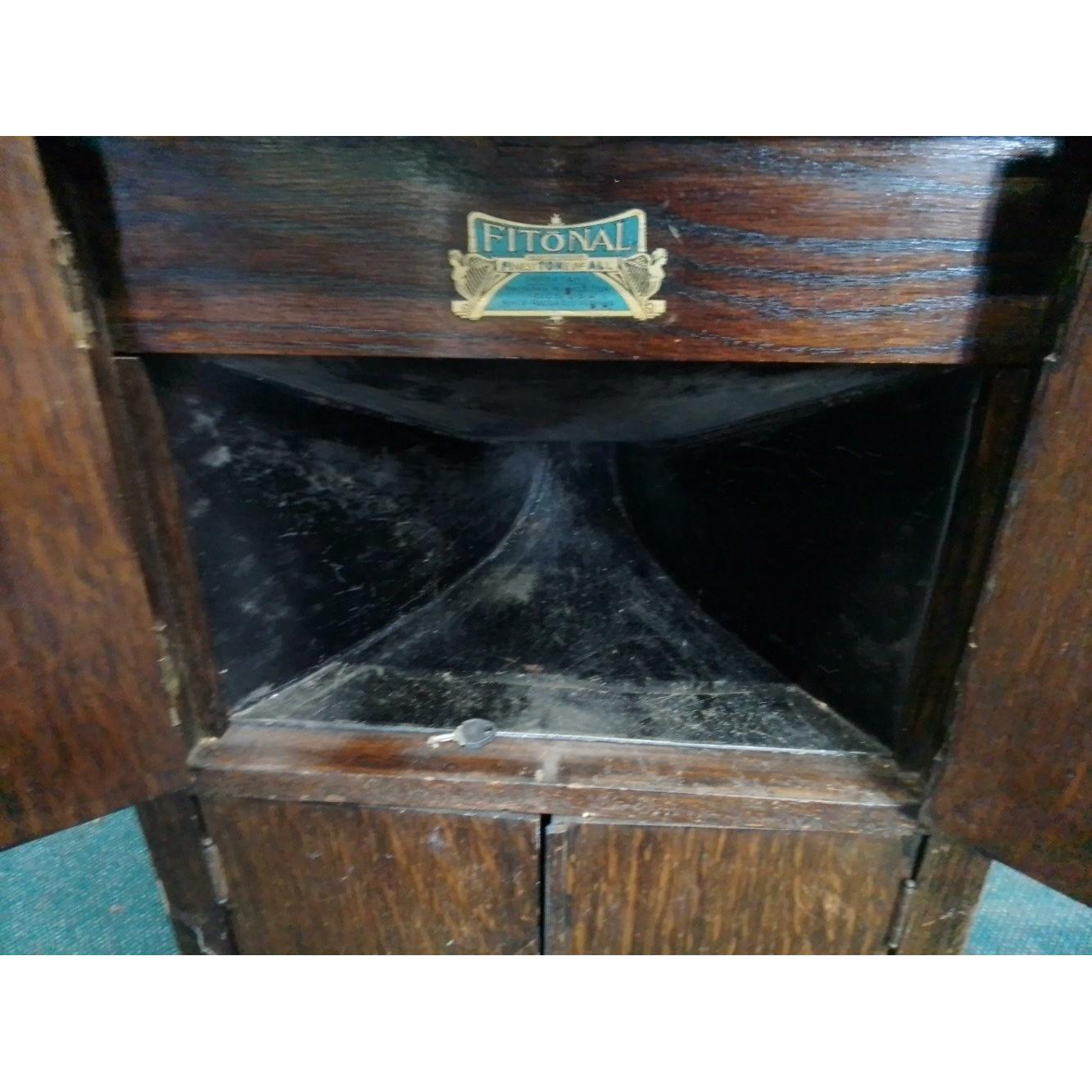 A FITONAL cabinet gramophone in need of some restoration. Cabinet stands approx 95cm high. In fairly distressed conditionApprox 1 pieces
