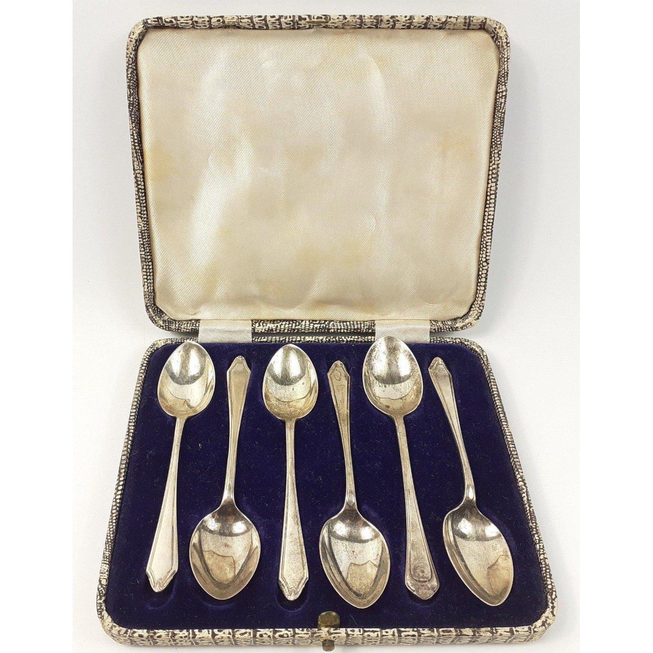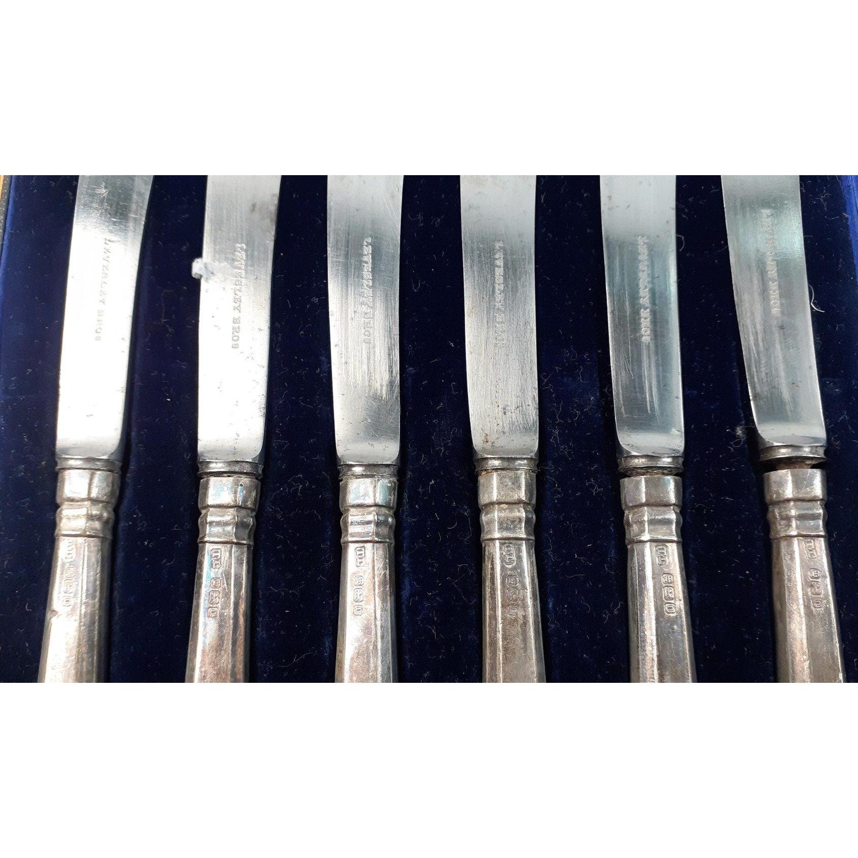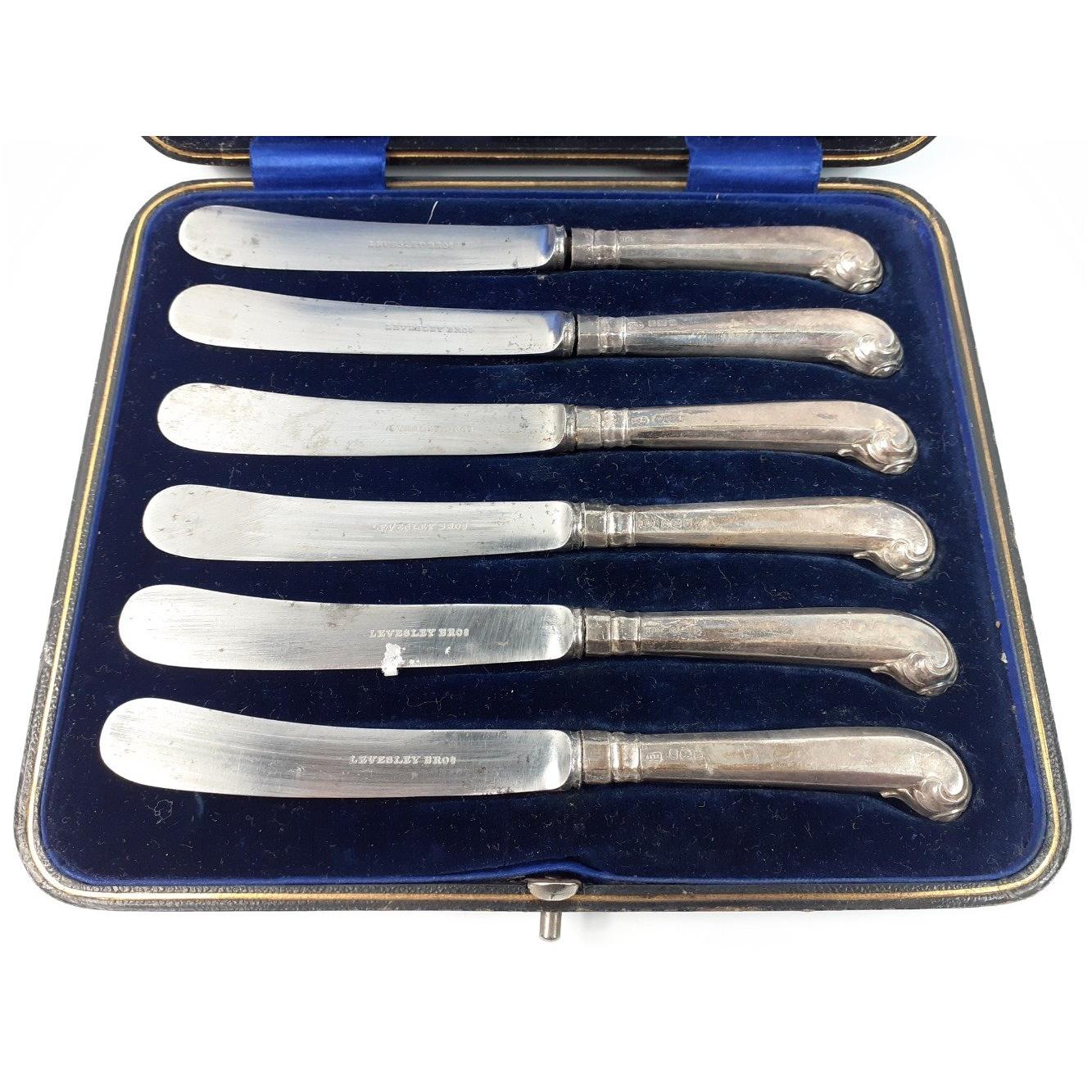 A set of 6 silver coffee spoons, hallmarked Birmingham 1936, weight 61g approx in presentation box and a boxed set of 6 butter knives hallmarked Sheffield 1906, gross weight 123g approxApprox 2 pieces