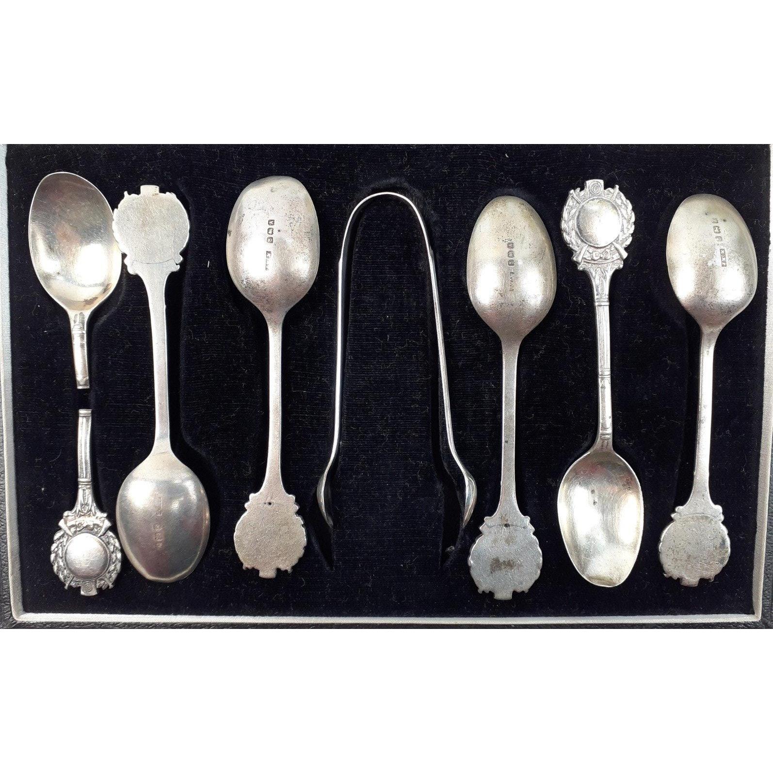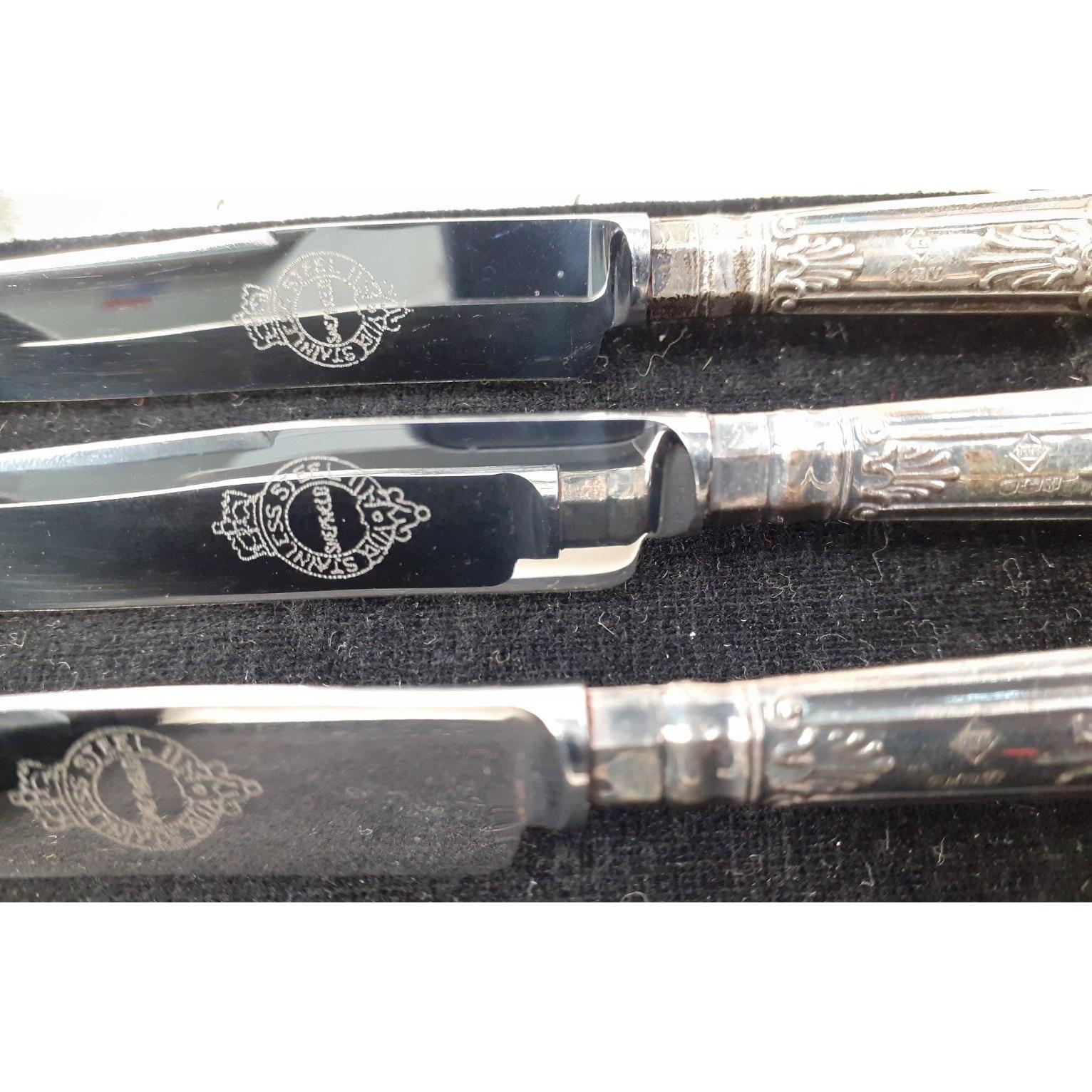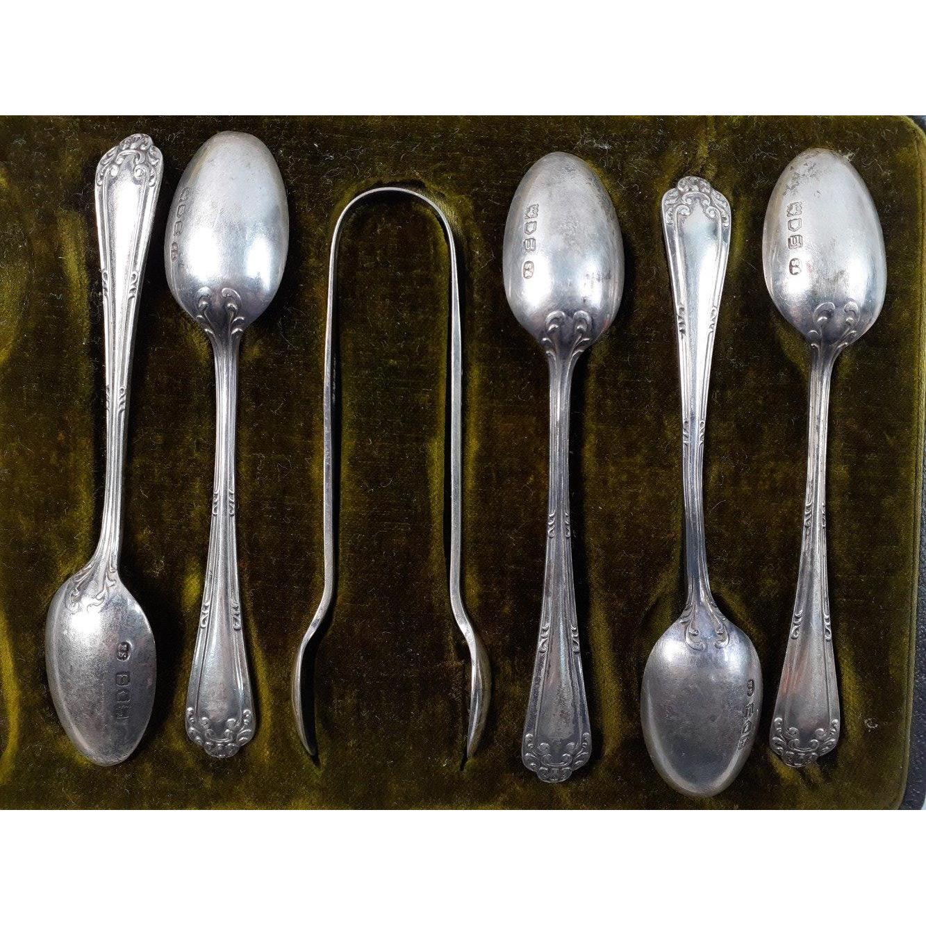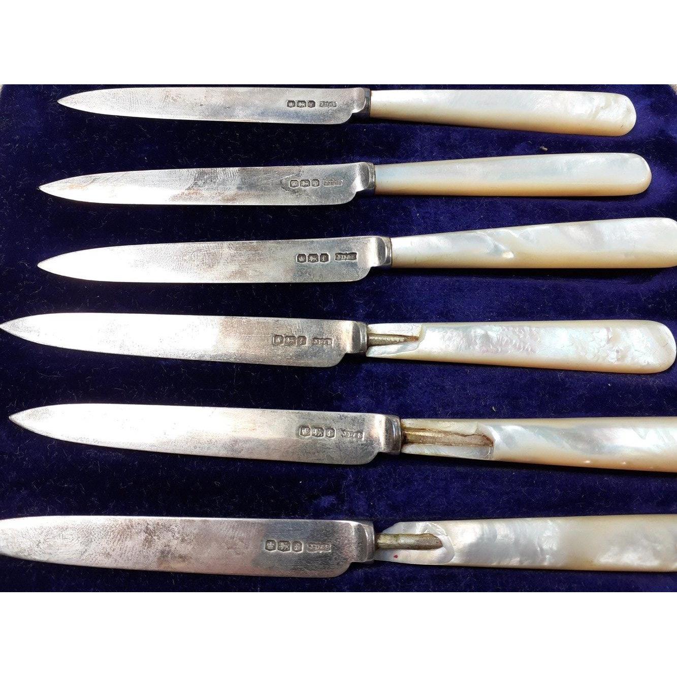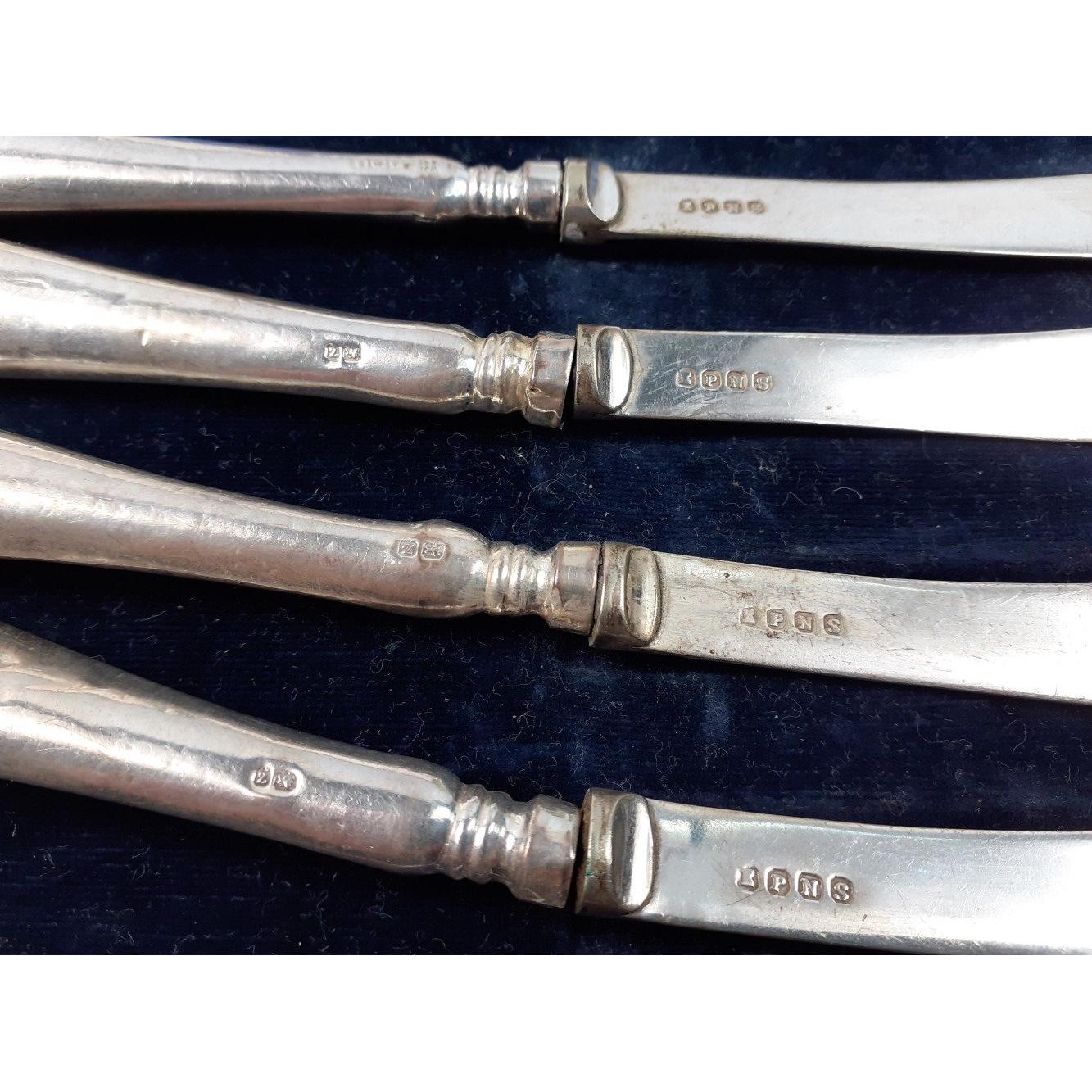 A collection of boxed sets of silver cutlery, all missing some parts to include 5 spoons, London 1915, weight 69g approx, 4 butter knives with silver handles, Birmingham 1924, gross weight 107g approx, a cake slice Sheffield 1961 weight 31g approx, 6 fruit knives with mother-of-pearl handles hallmarked Sheffield 1923 gross weight 102g approx, 6 spoons hallmarked Birmingham 1925 (one broken) and snips 108g approx, 3 butter knives with silver handles Sheffield 1963 58g approx.