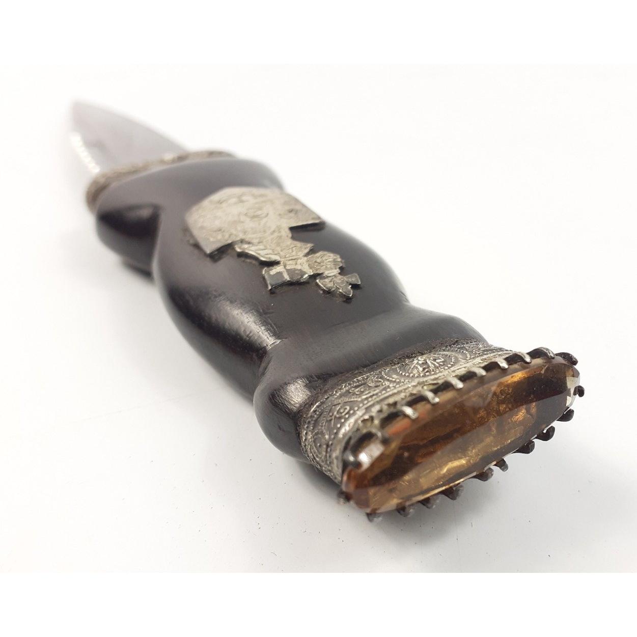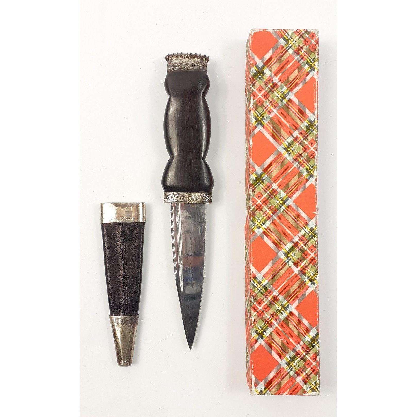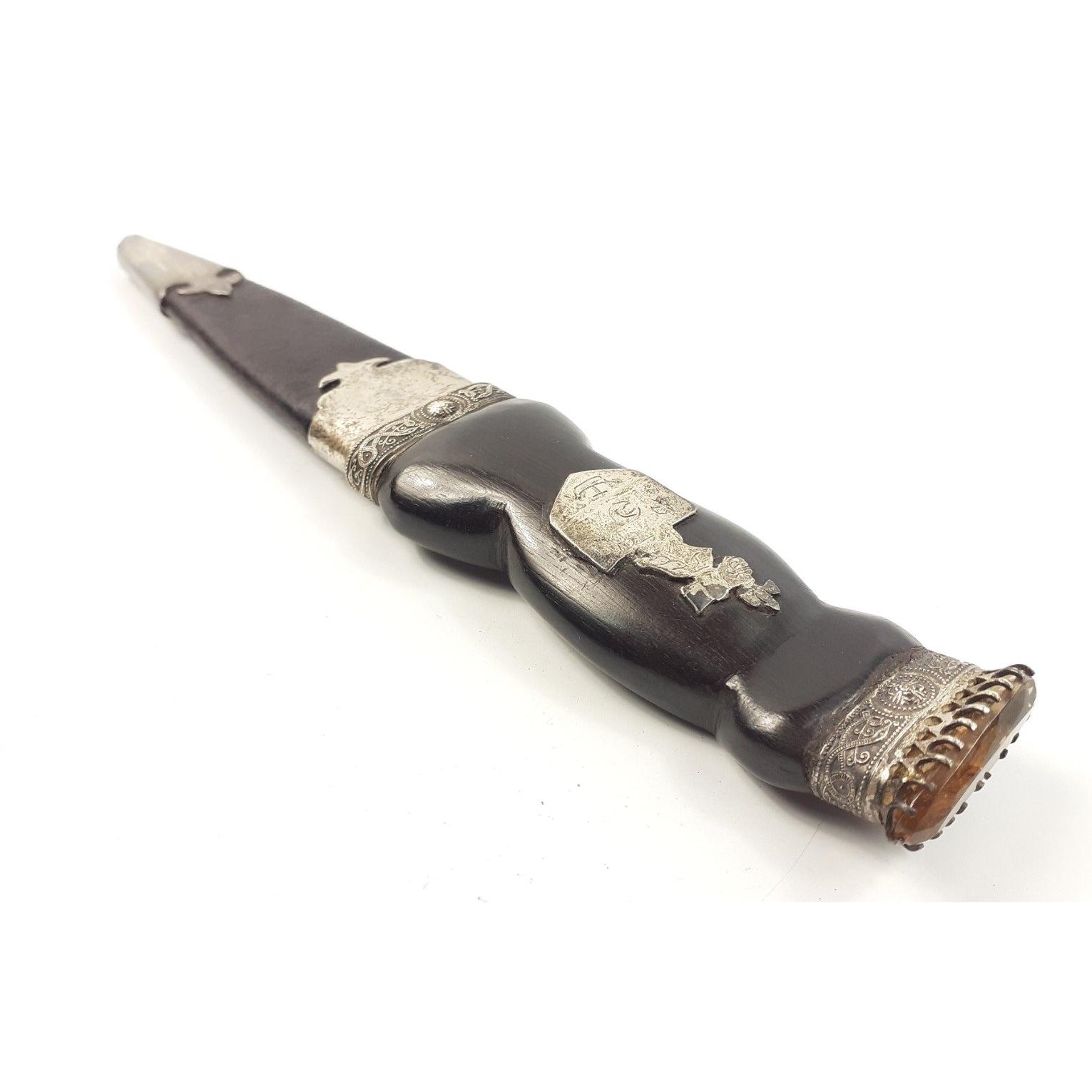 A Scottish Highland dress Skean Dhu, Sgian Dubh, silver mounts with Scottish hallmark maker F.G. indistinct year mark. Top mount with attractive light coloured oval Cairngorm. Blade inscribed Graham. 19cm long in total.