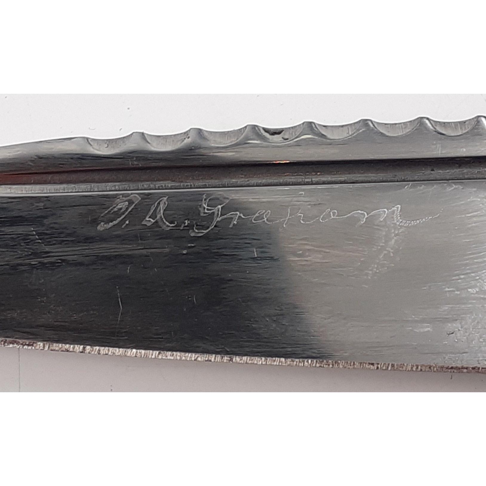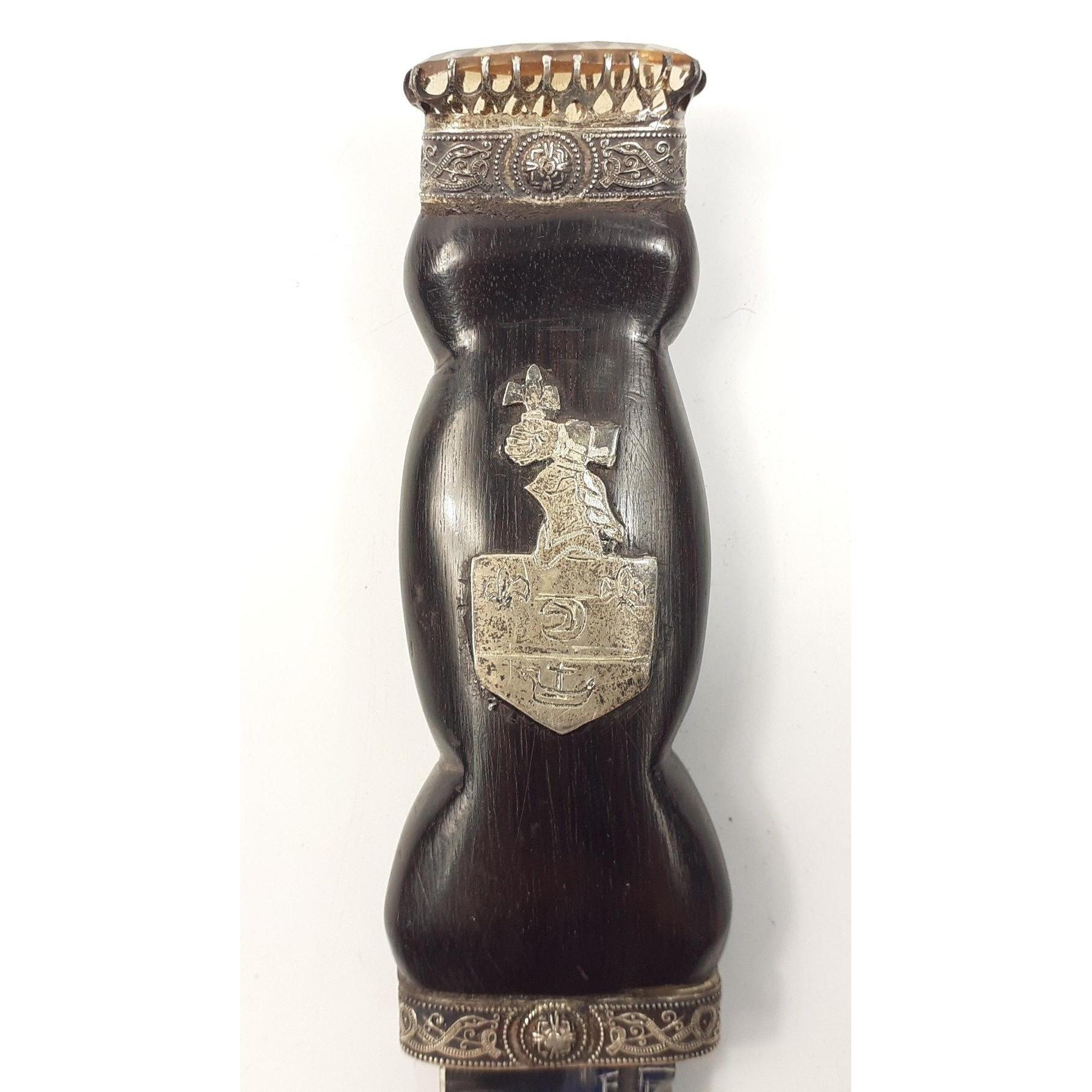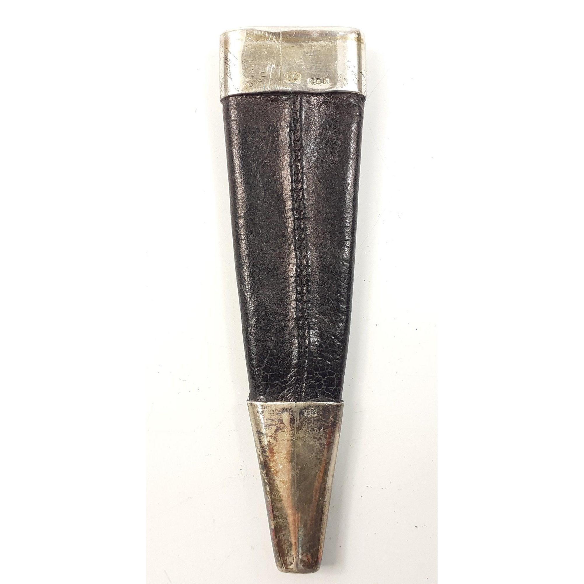 A Scottish Highland dress Skean Dhu, Sgian Dubh, silver mounts with Scottish hallmark maker F.G. indistinct year mark. Top mount with attractive light coloured oval Cairngorm. Blade inscribed Graham. 19cm long in total.