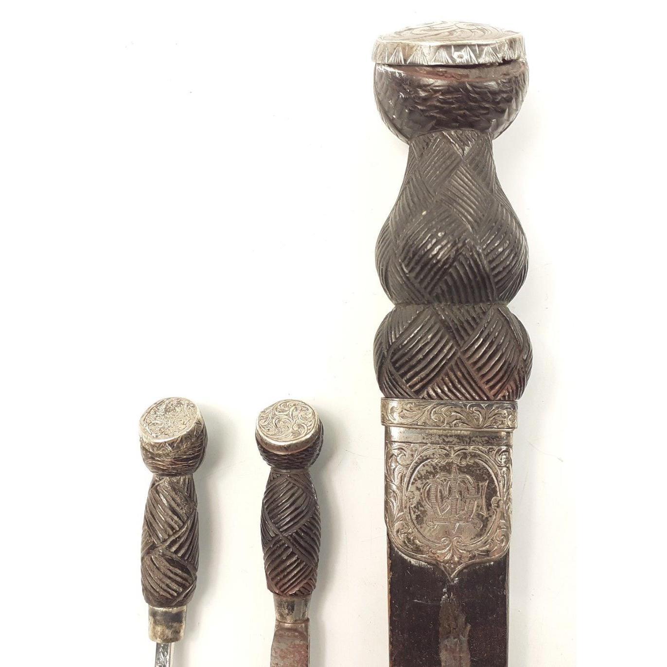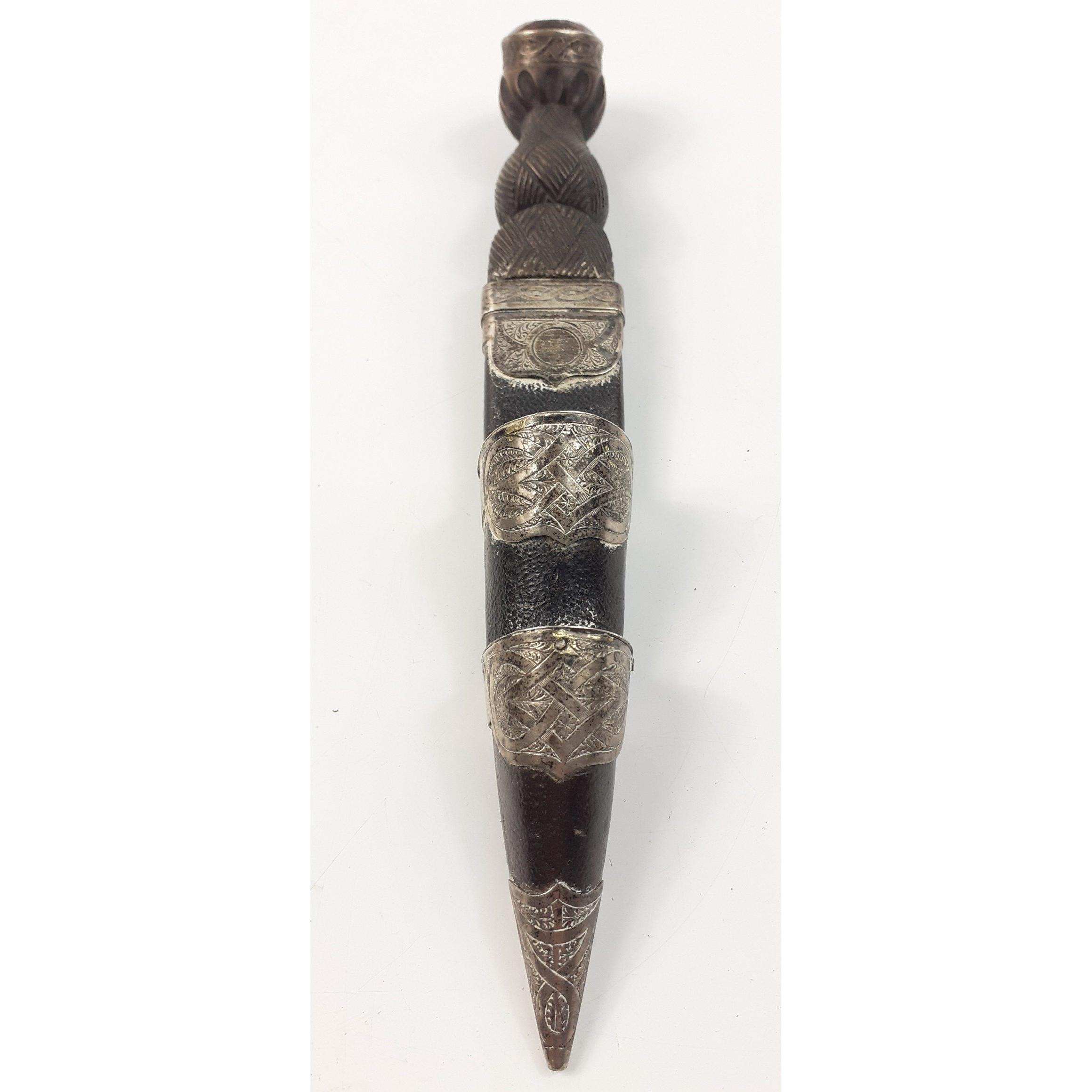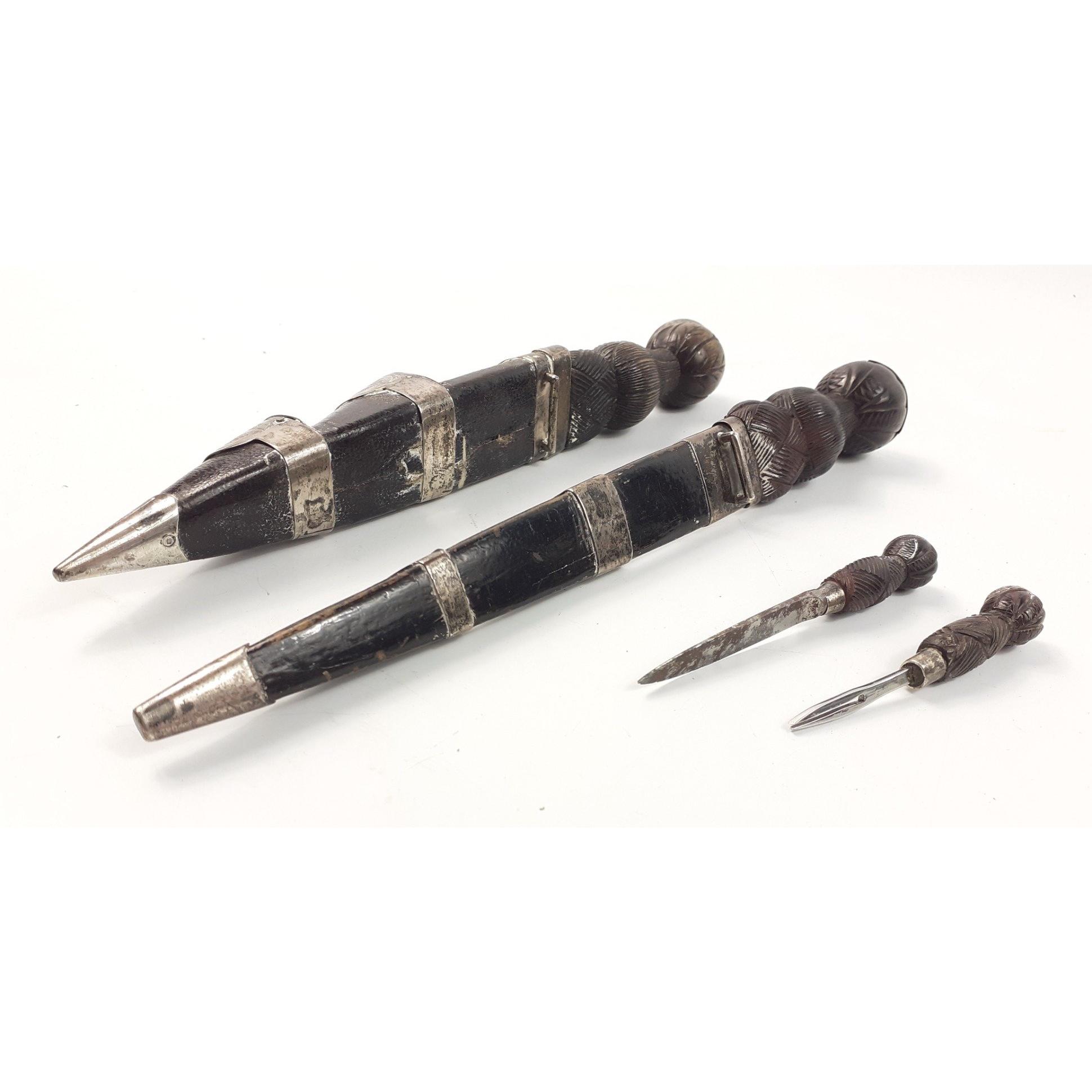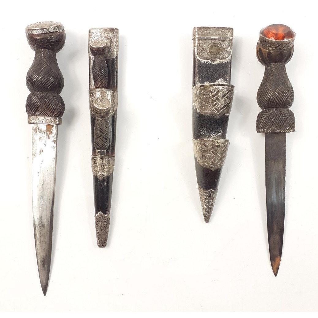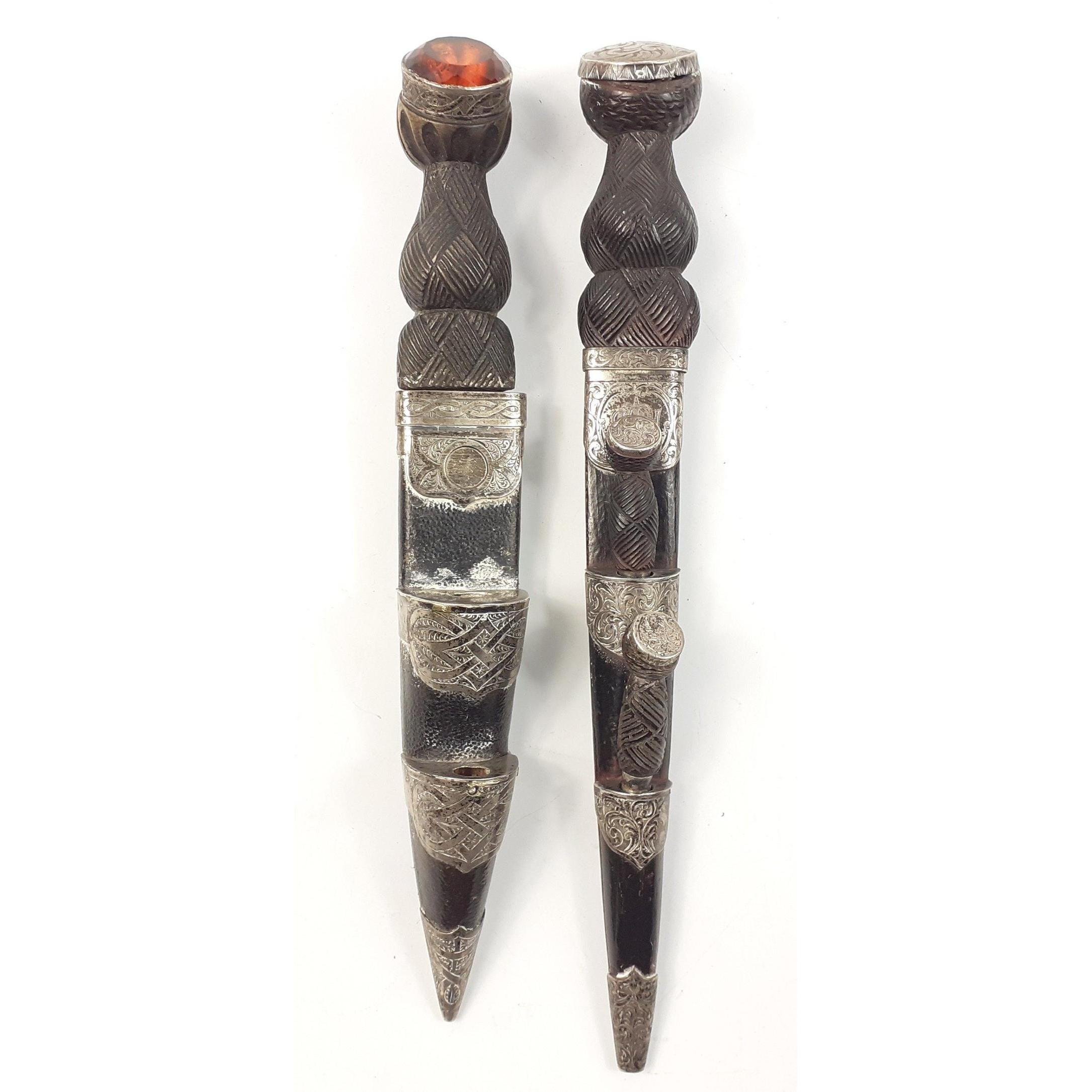 A pair of small children's size Scottish Highland dress Skean Dhu, Sgian Dubh. One plain topped the other with Cairngorm. Each with spaces for cutlery which is completely missing in one and the other with knife and fork but loose fitting. Both blades dirty with minor rust but no damage.