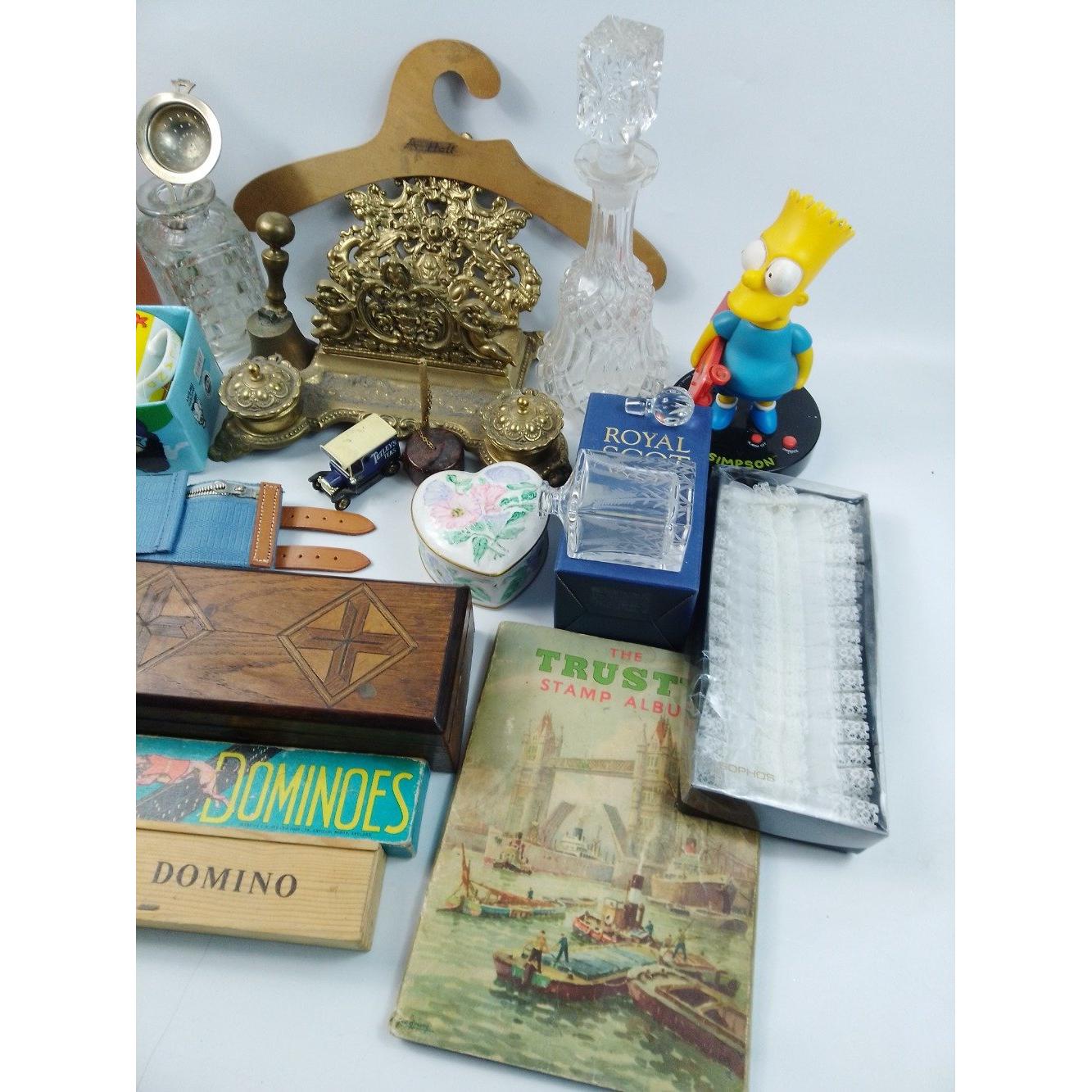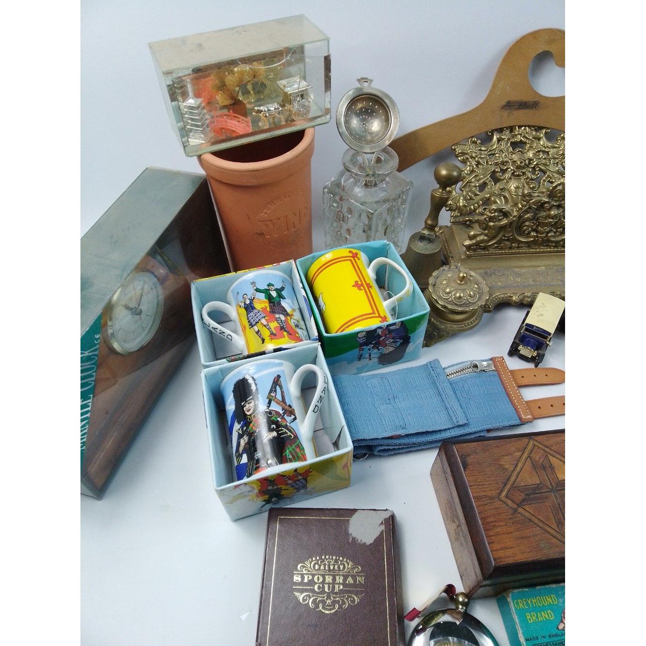 A mixed lot to include various boxed Scottish mugs, a solid wood mantel clock, a Japanese bullock cart diorama, a brass inkwell/letter rack (AF), a Portsoy marble desk pen stand, terracotta wine cooler, decanters, Bart Simpson alarm clock etc