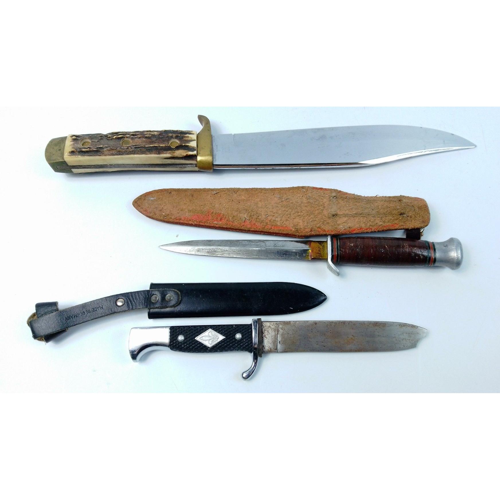 A substantial BOWIE knife 40cm, marked Whitby made in Solingen, etched blade has rust pitting, a German scout knife also marked Whitby made in Solingen, blade damaged but with scabbard, and a stiletto knife in sheath
