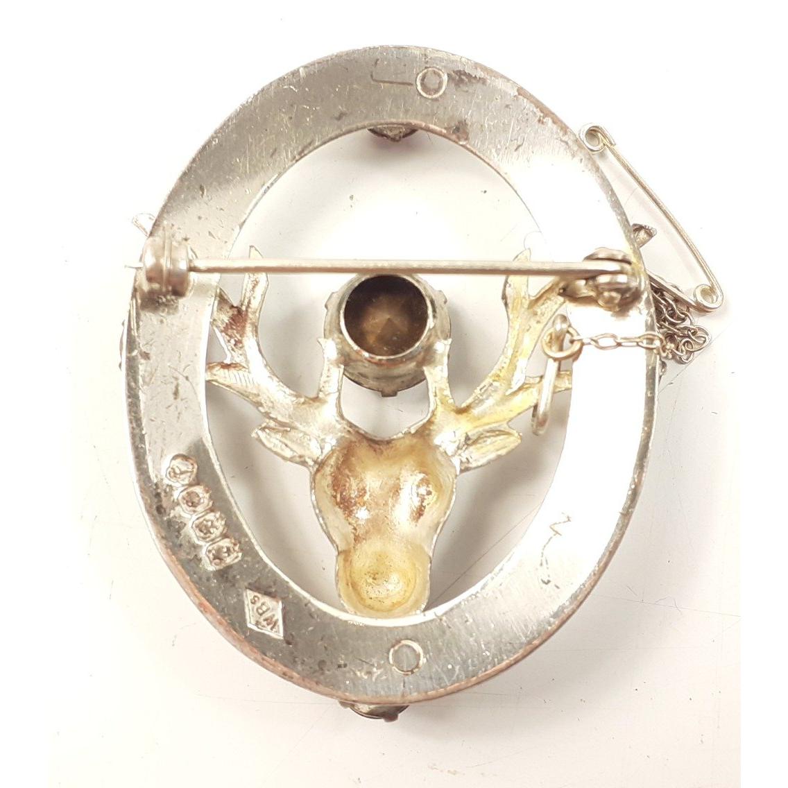 A lovely VINTAGE silver brooch, hallmarked GLASGOW 1954, made by Ward Bros, oval shaped with a stag's head and set with 5 AMETHYST stones and safety chain, 5cm long approx, gross weight 12g approx