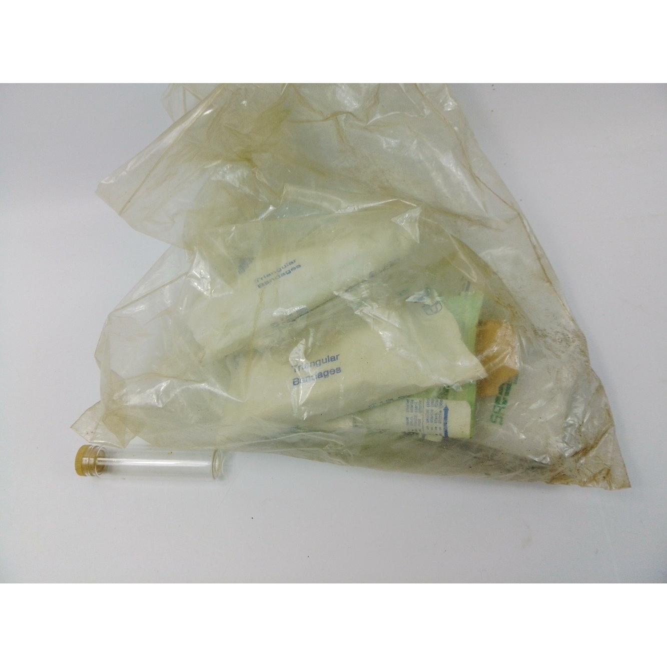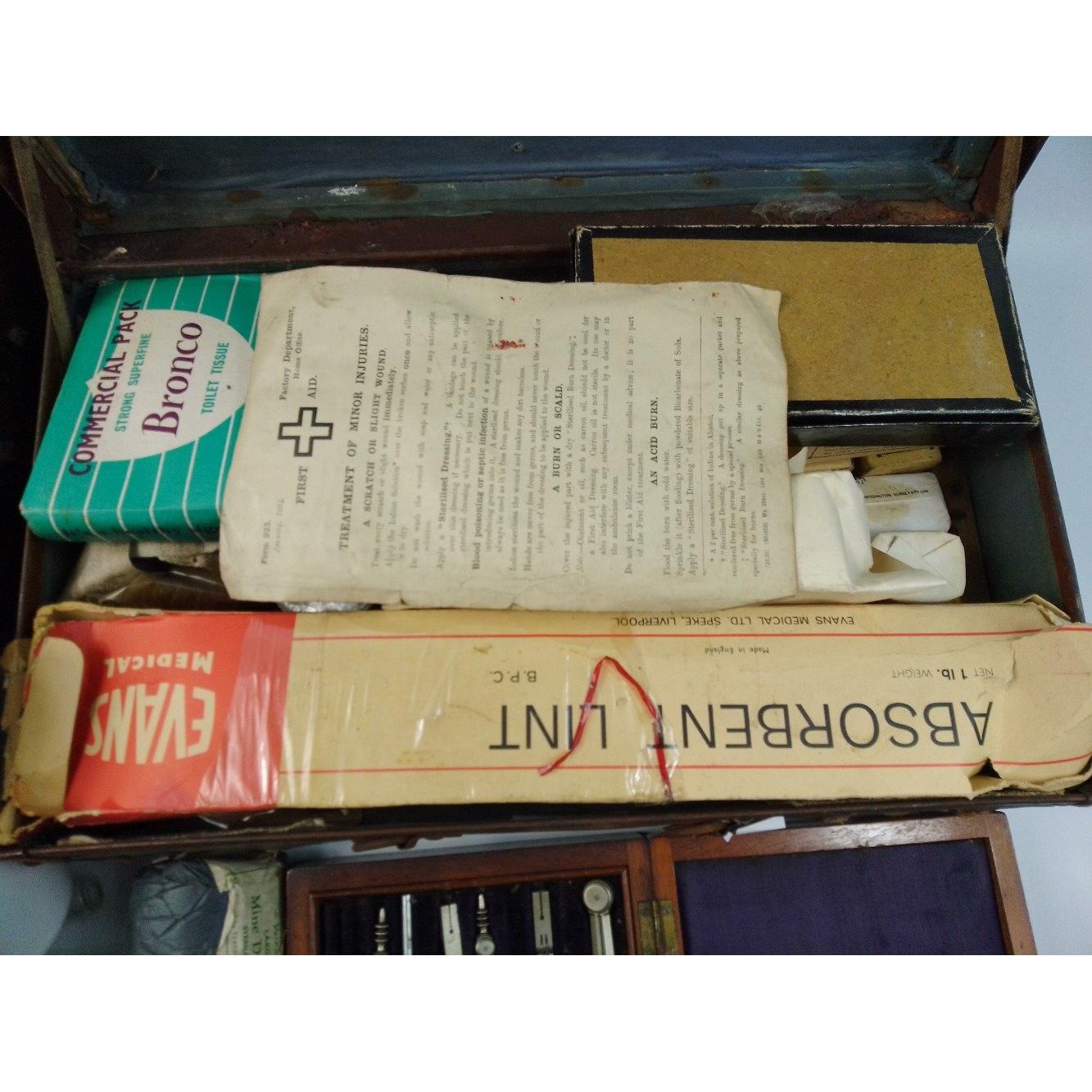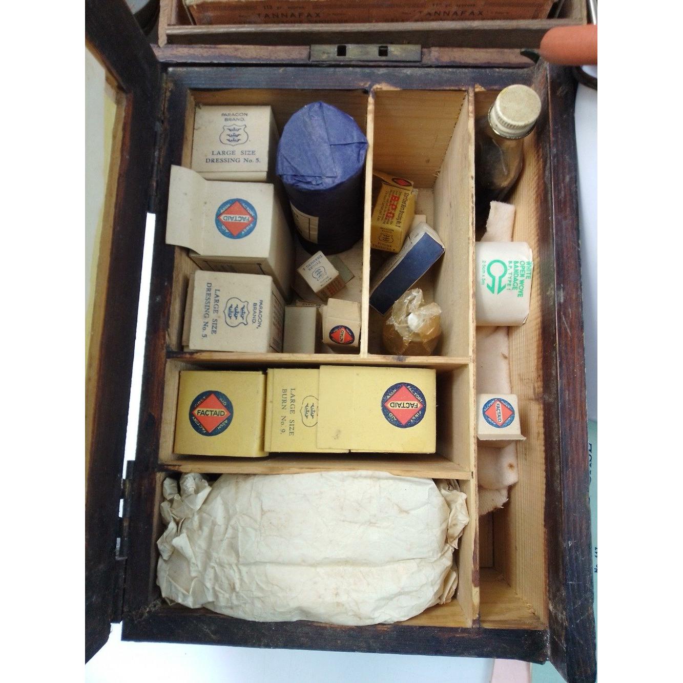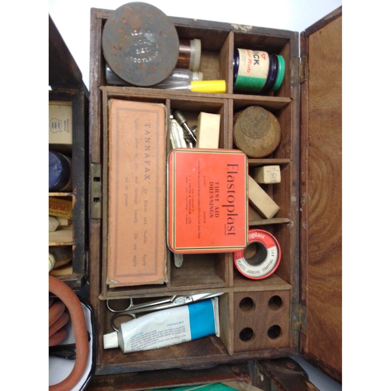 Three vintage wooden medical kits, one marked PARAGON with vintage contents to include bandages, hypodermics etc, also an enamel cup etcApprox 3 pieces