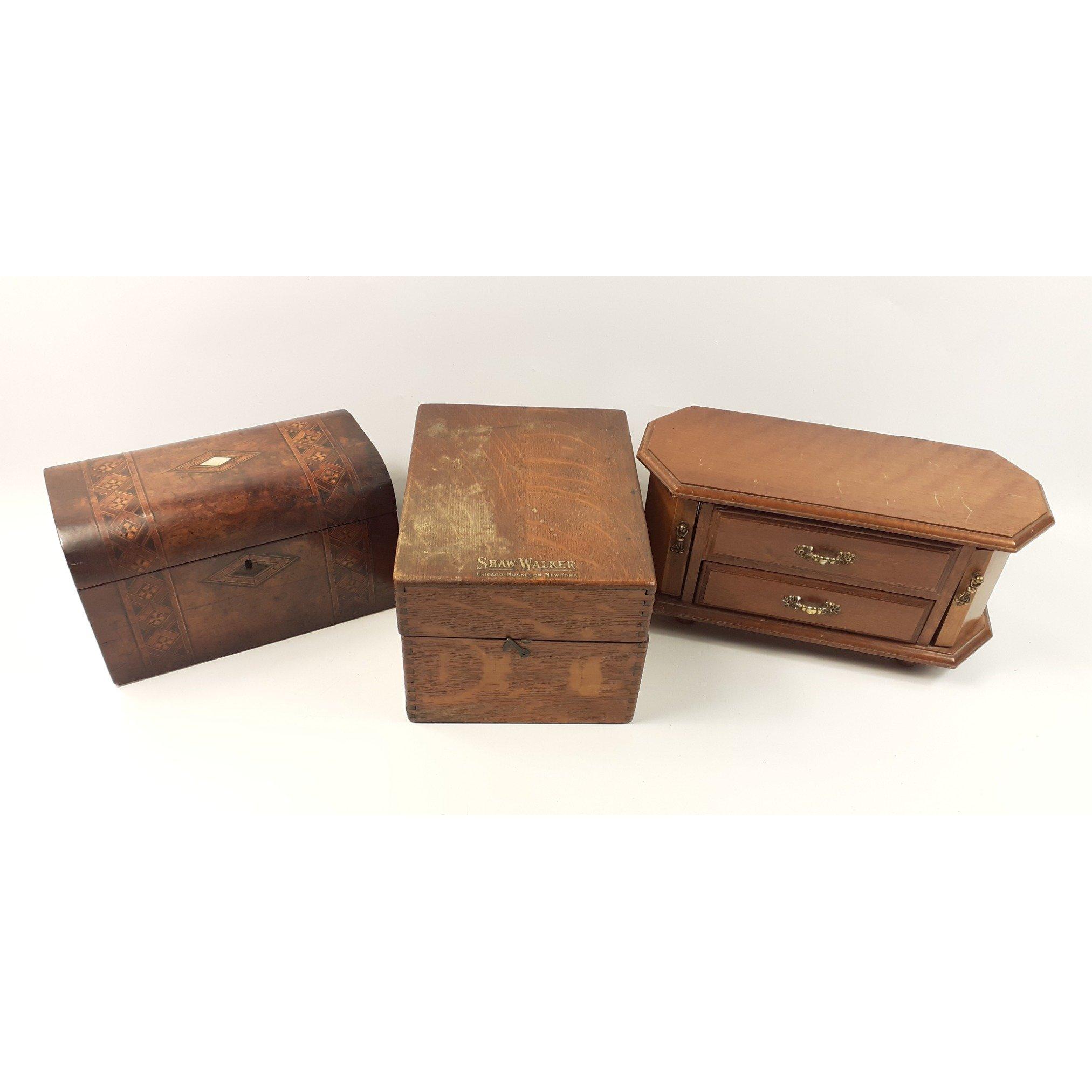 Three wooden boxes including an inlaid tea caddy (would look beautiful with some TLC), a Shaw Walker filing box and a more modern jewellery boxApprox 3 pieces