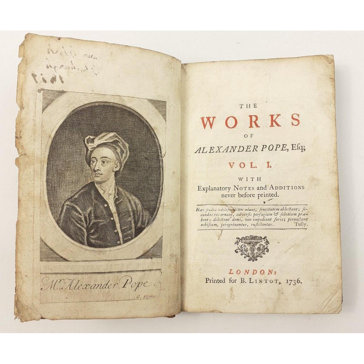 THE WORKS OF ALEXANDER POPE Esq, volume I printed for B Lintot 1736. Owner's name inscribed inside. Leather bound in moderate condition. Title page in red and black, engraved portraitApprox 1 pieces