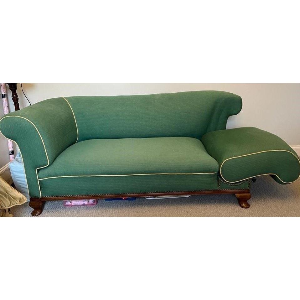 A VINTAGE CHESTERFIELD DROP-ARM sofa in green fabric with gold piping - a nice sofa but has a small hole in the fabric at the armrest, which does not detract from this lovely sofa - dimensions length 180cm x 85cm depth x 70cm height