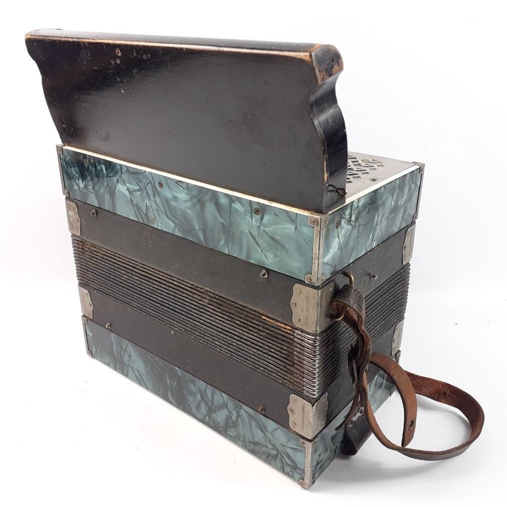 A German genuine piano action 13 key small accordion, grey pearl effect, bellows appear in good orderApprox 1 pieces