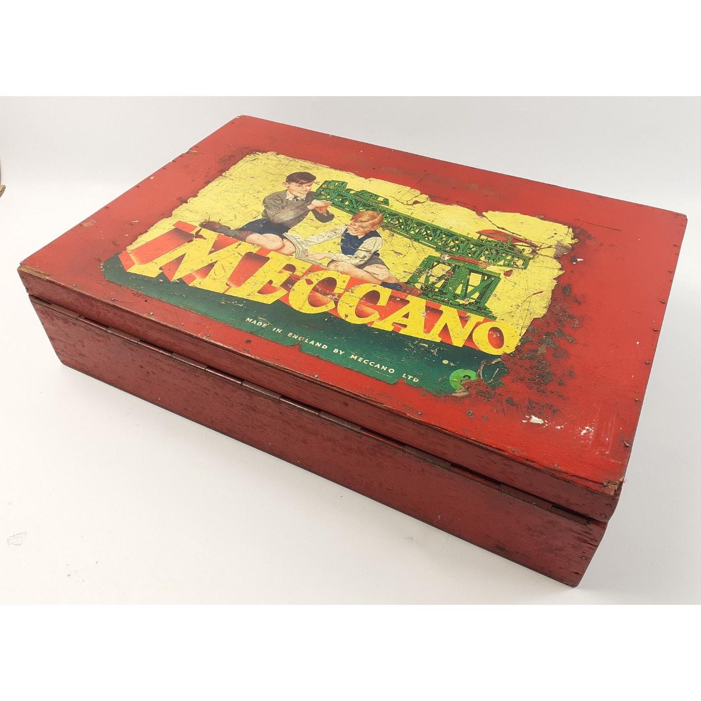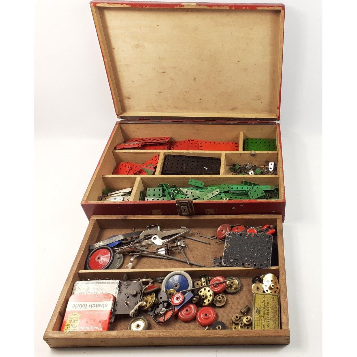 A vintage wooden MECCANO chest containing a useful selection of red, green and brass components including a clockwork motor. Useful lot in a nice vintage boxApprox 1 pieces