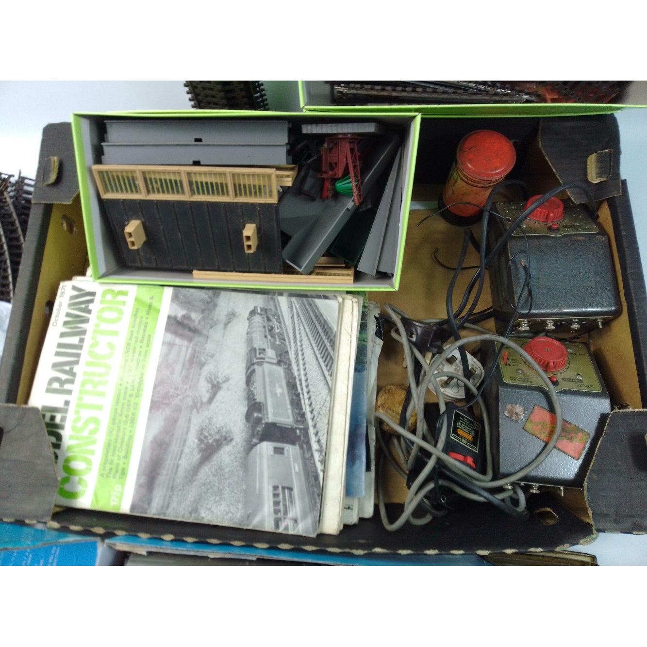 A cherished HORNBY layout to include a boxed D7063 diesel loco, an unboxed well-run Princess Elizabeth 462 with issues, and a 47606 tank loco and rolling stock. Other components include a quantity of track, two Tri-ang power units, various diorama and layout components and some model rail literature. Lot also includes some vintage small snooker balls