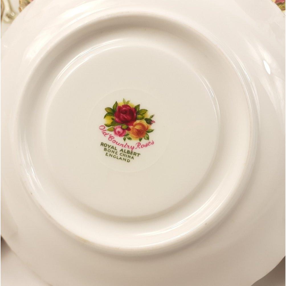 A ROYAL ALBERT Old Country Roses tea service comprising teapot in good condition, 2 tier cake stand, 6 side plates, 6 cups and saucers, a small bell, a small shoe (damaged)Approx 21 pieces