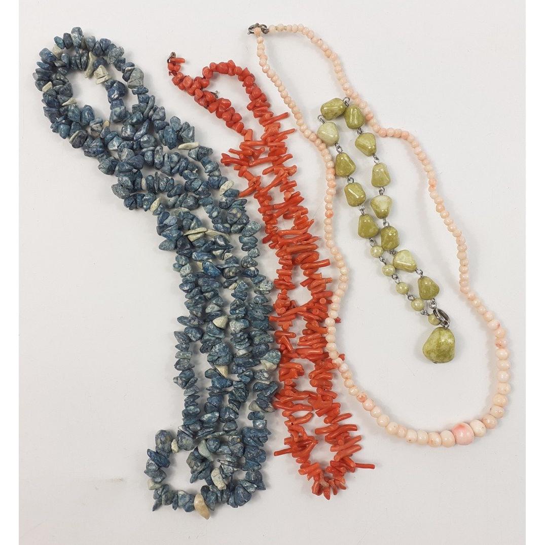 A coral necklace with working clasp, approx 40cm long, plus a blue stone necklace approx 86cm long, a pink stone necklace and a green stone braceletApprox 4 pieces