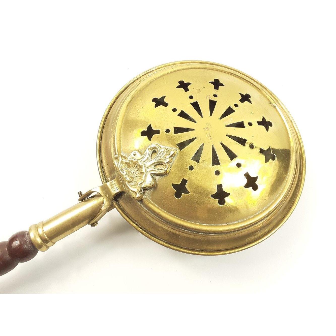 A brass bed-warming pan with pierced design total length 85cm