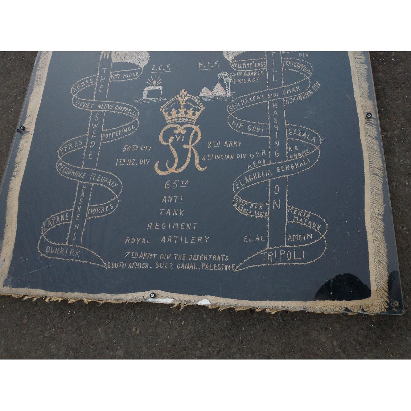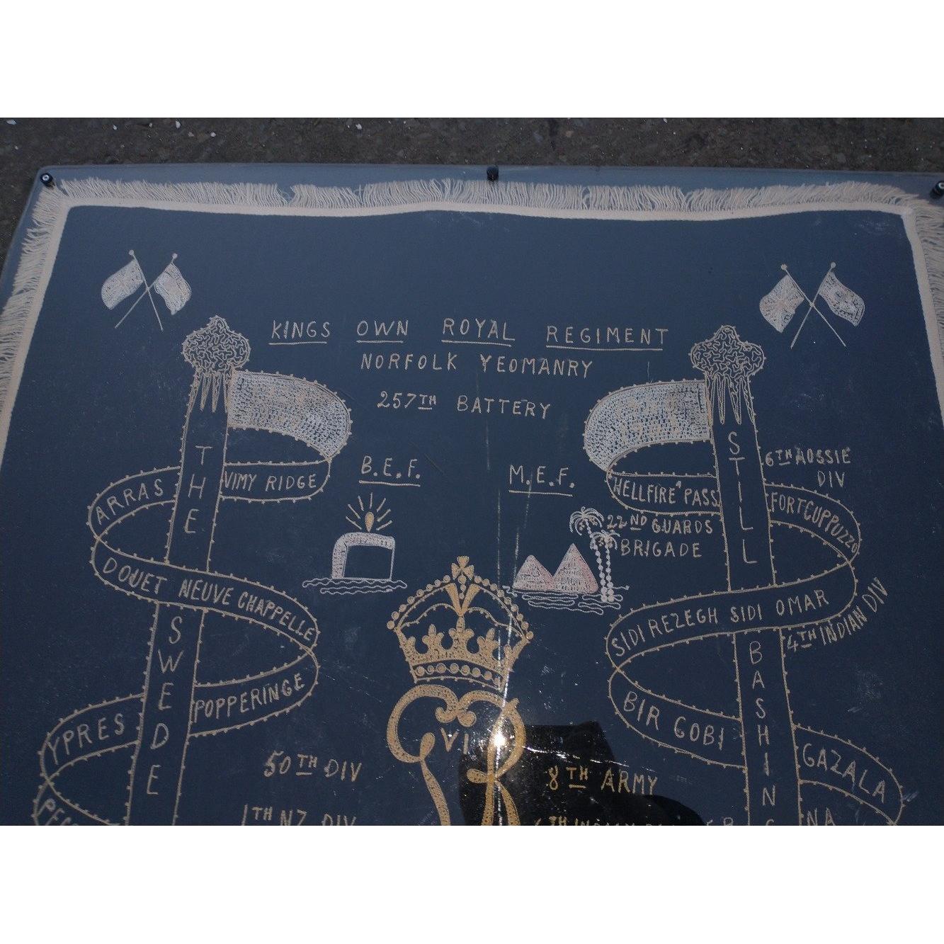 A commemorative military silk in very heavy huge Perspex frame (could be removed if required). KING'S OWN ROYAL REGIMENT, Norfolk Yeomanry 257th battery, 56th anti-tank regiment, 7th army division of the Desert Rats. Beautifully embroidered, WWI and WWII battle honours display piece 90 x 90cm approx. An amazing and possibly unique item.