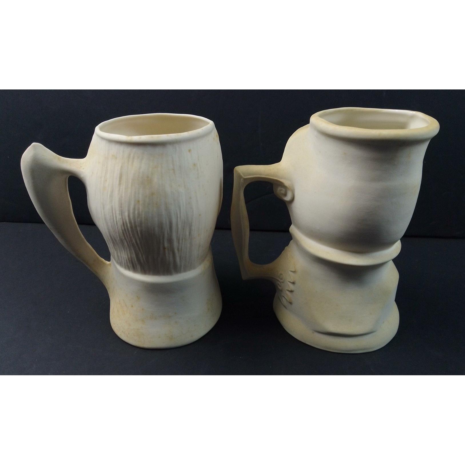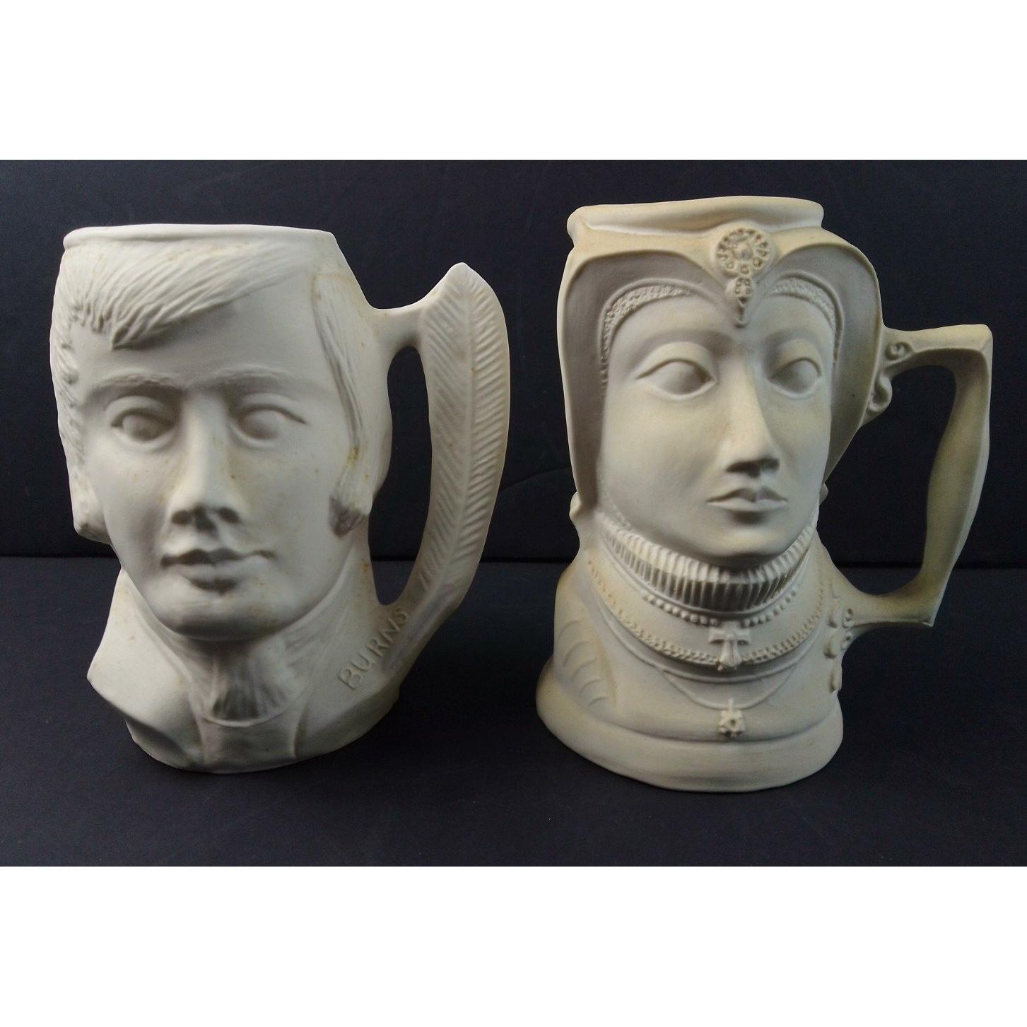 Two unglazed tankards of Burns and Mary Queen of Scots, each 17cm high plus a large modern pottery ribbed vase standing 50cm tallApprox 3 pieces