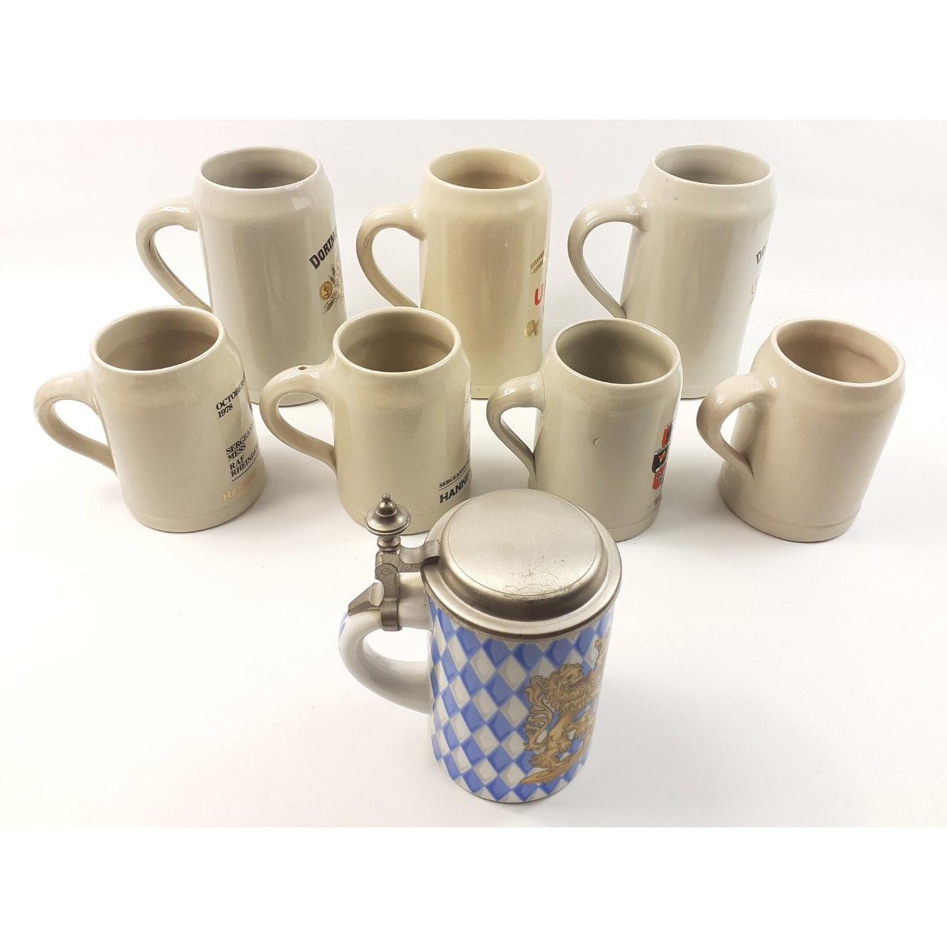 A collection of German stoneware steins comprising 3 x 1l Dortmunder Union mugs and 4 half litre mugs including 2 from 1978 and 1980 RAF sergeants' mess October-fest, also a lidded half-litre lidded stein. One mug has a crack in handle