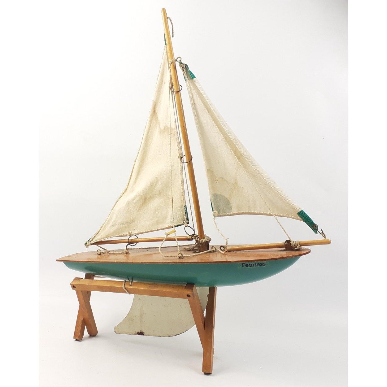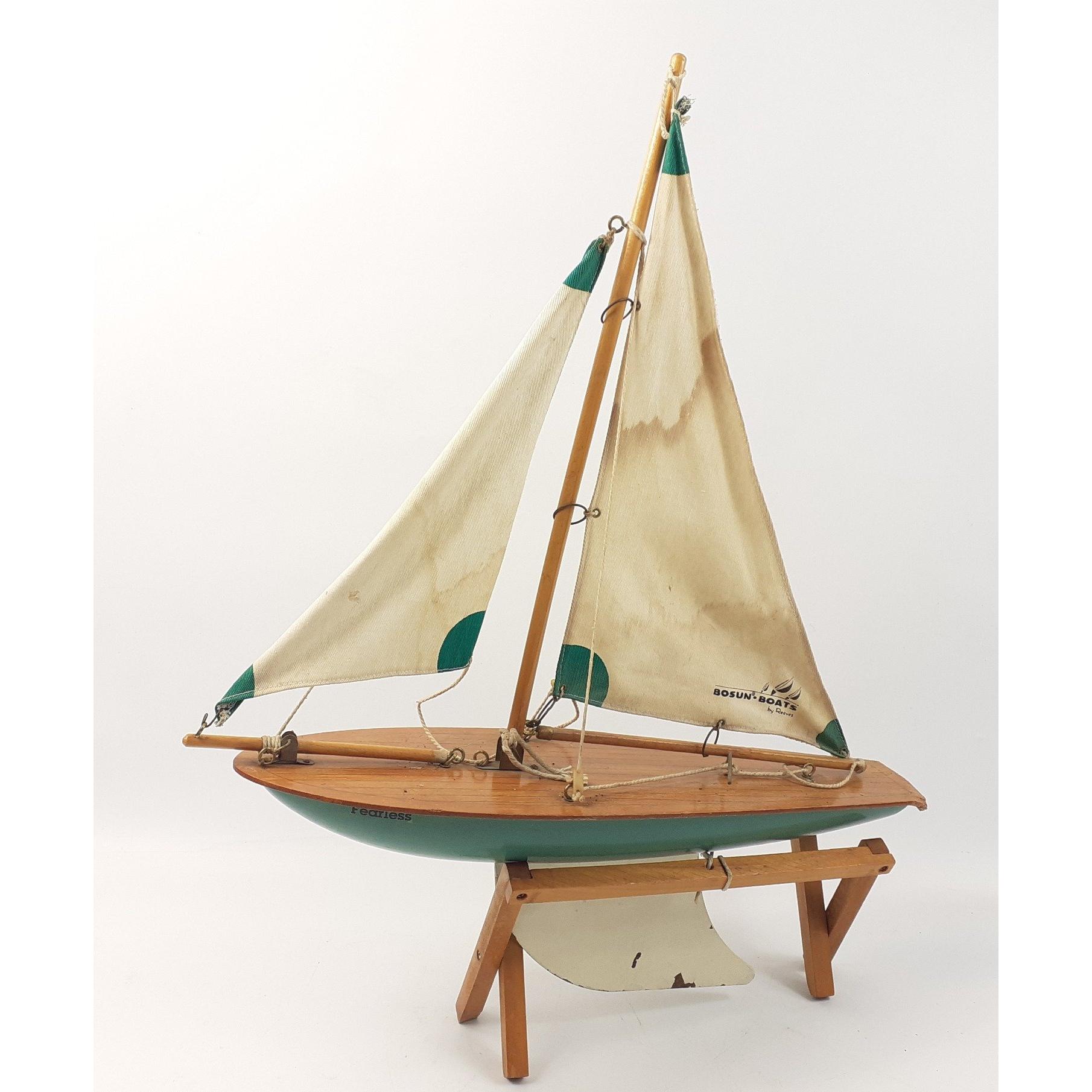 A VINTAGE BOSUN BOATS by Reeves wooden model pond yacht named 'Fearless' on stand approx 40cm longApprox 1 pieces