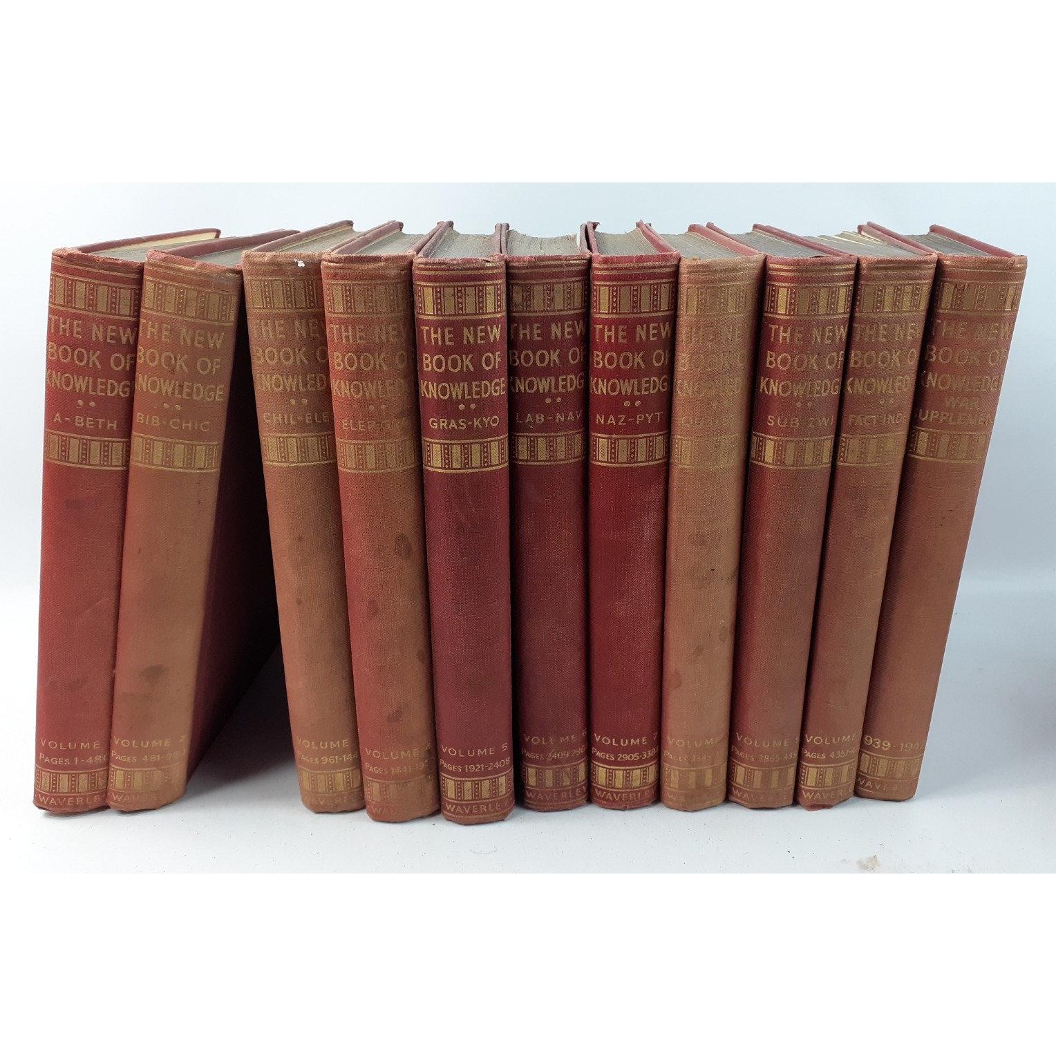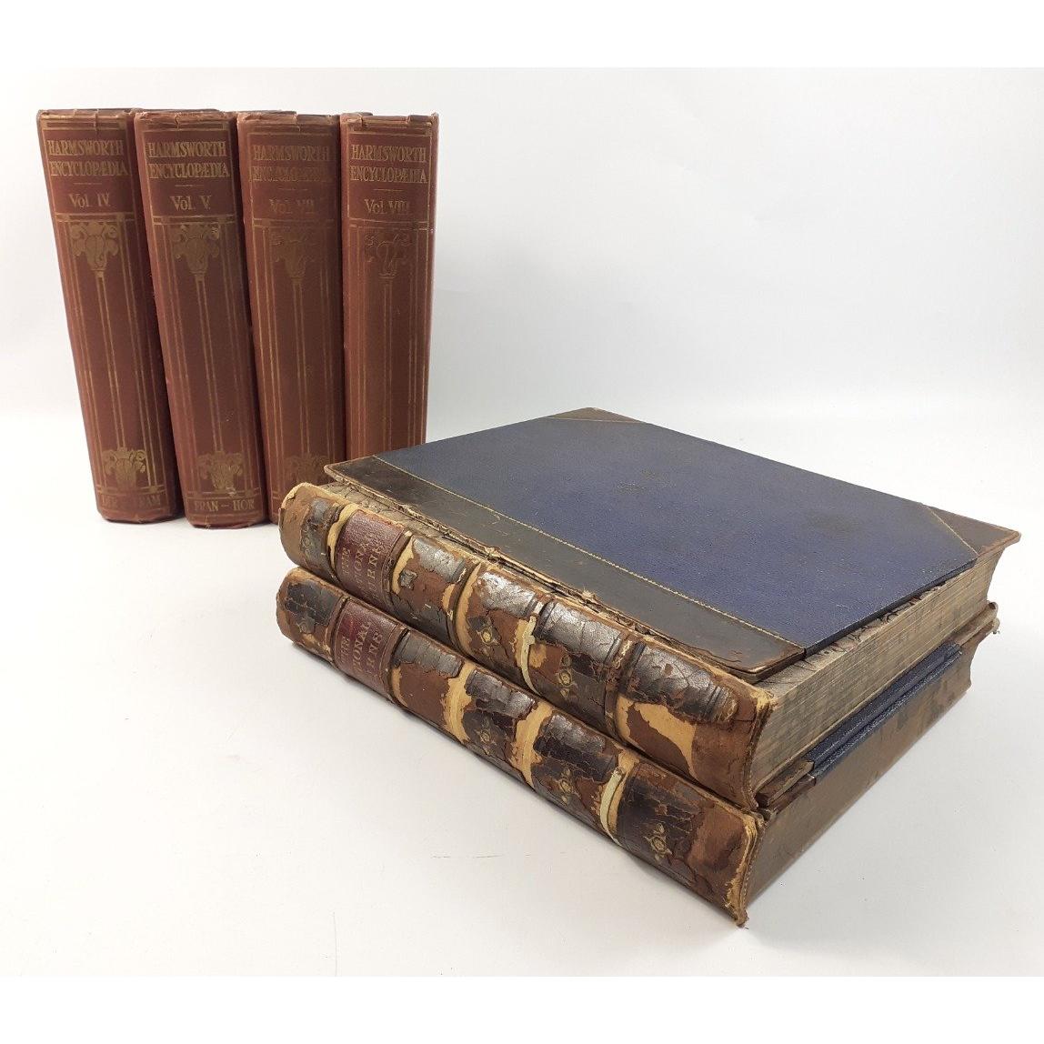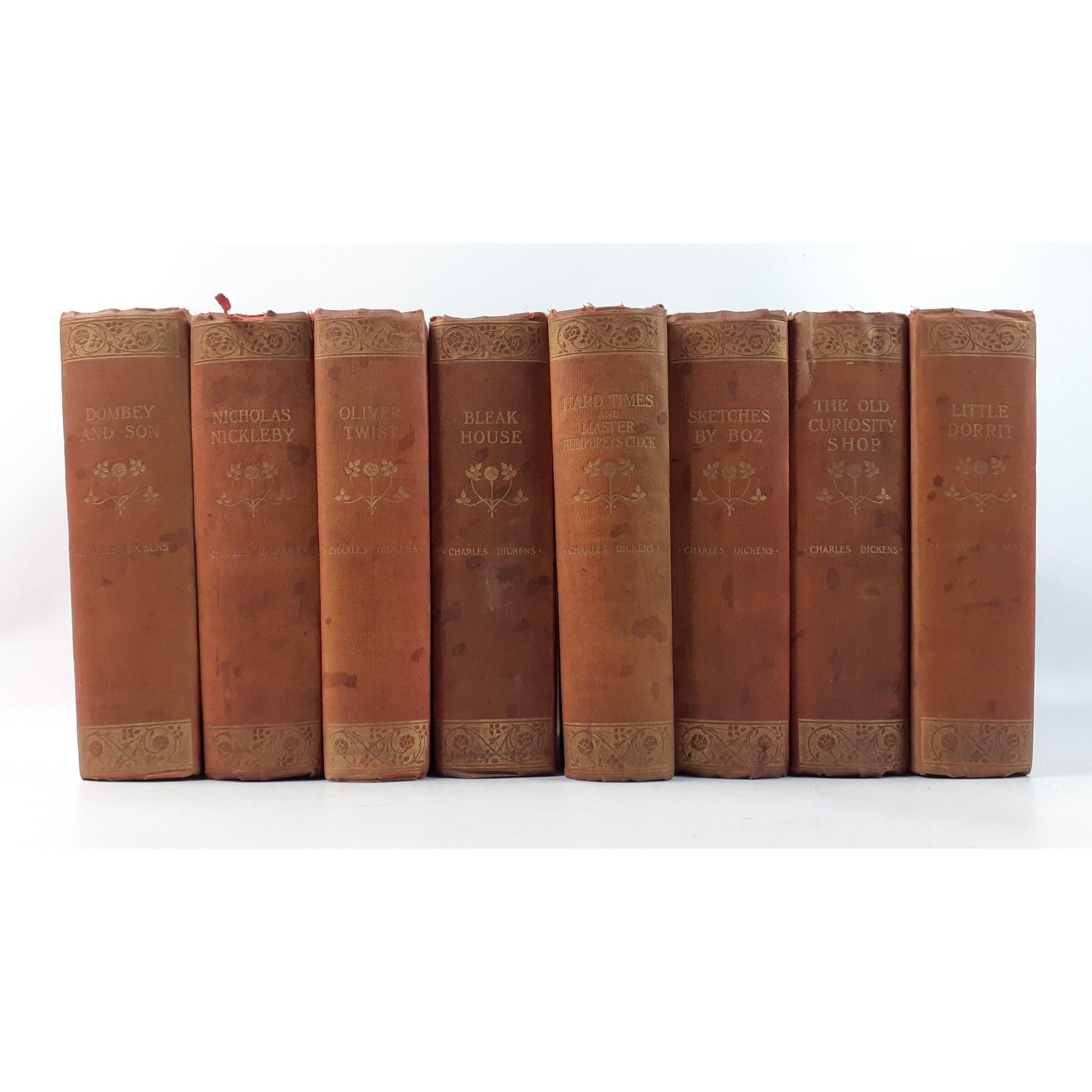 A box of vintage books to include eight 1902 Dickens volumes published by Gresham, 2 volumes of the National Burns, and a ten volume edition of the New Book of Knowledge which also includes a 1939-42 supplement and four others